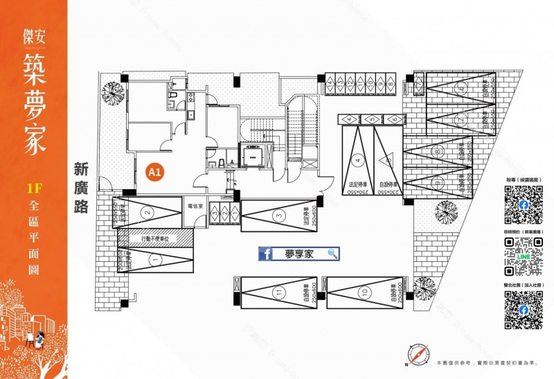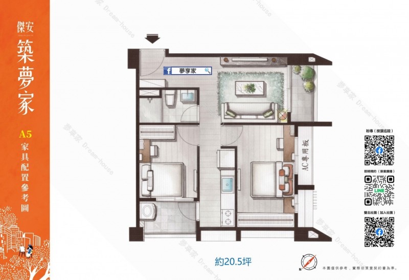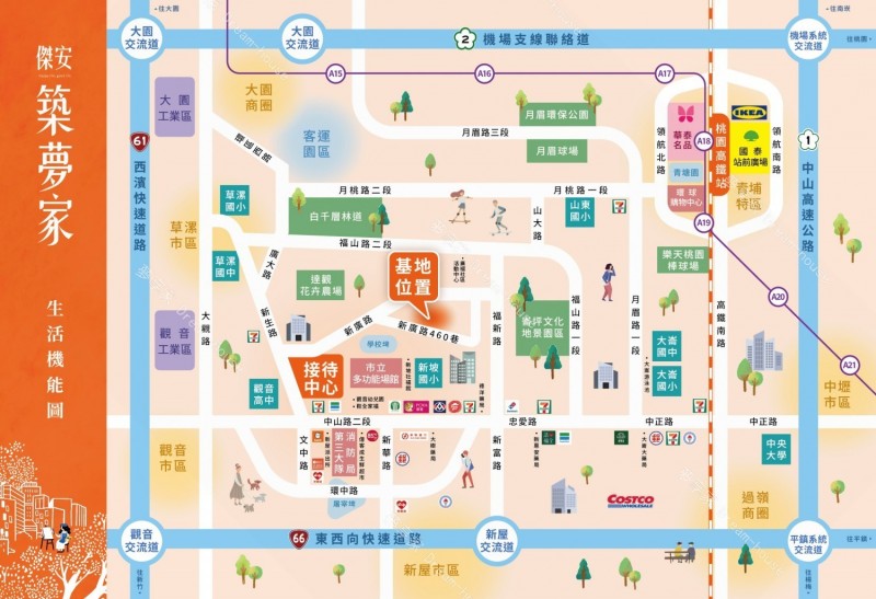 - 特色介紹 「傑安築夢家」位於桃園市觀音區新廣路460巷,由傑安開發建設有限公司投資興建,嘉富營造有限公司營造,黃豊竣建築師事務所建築設計,基地面積172.42坪、建蔽率59.99%、公設比20.53%,樓層規劃為1棟地上5層建築,共有21戶住家,格局坪數規劃二房(18.5~20.52坪)、三房(26.72~29.99坪)。