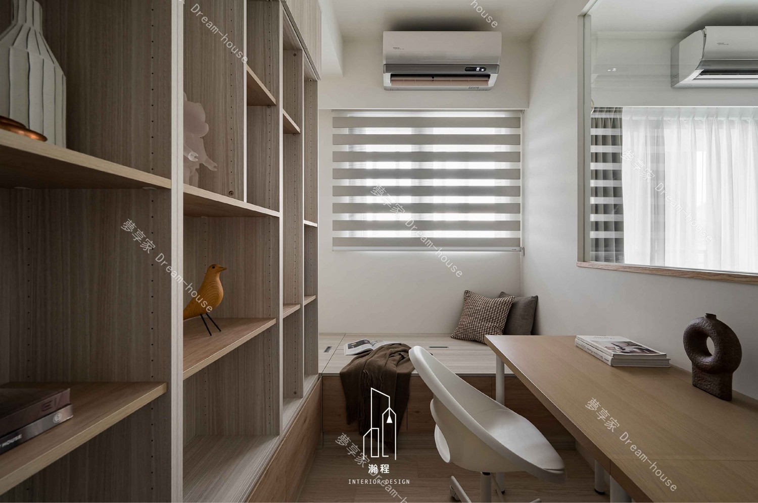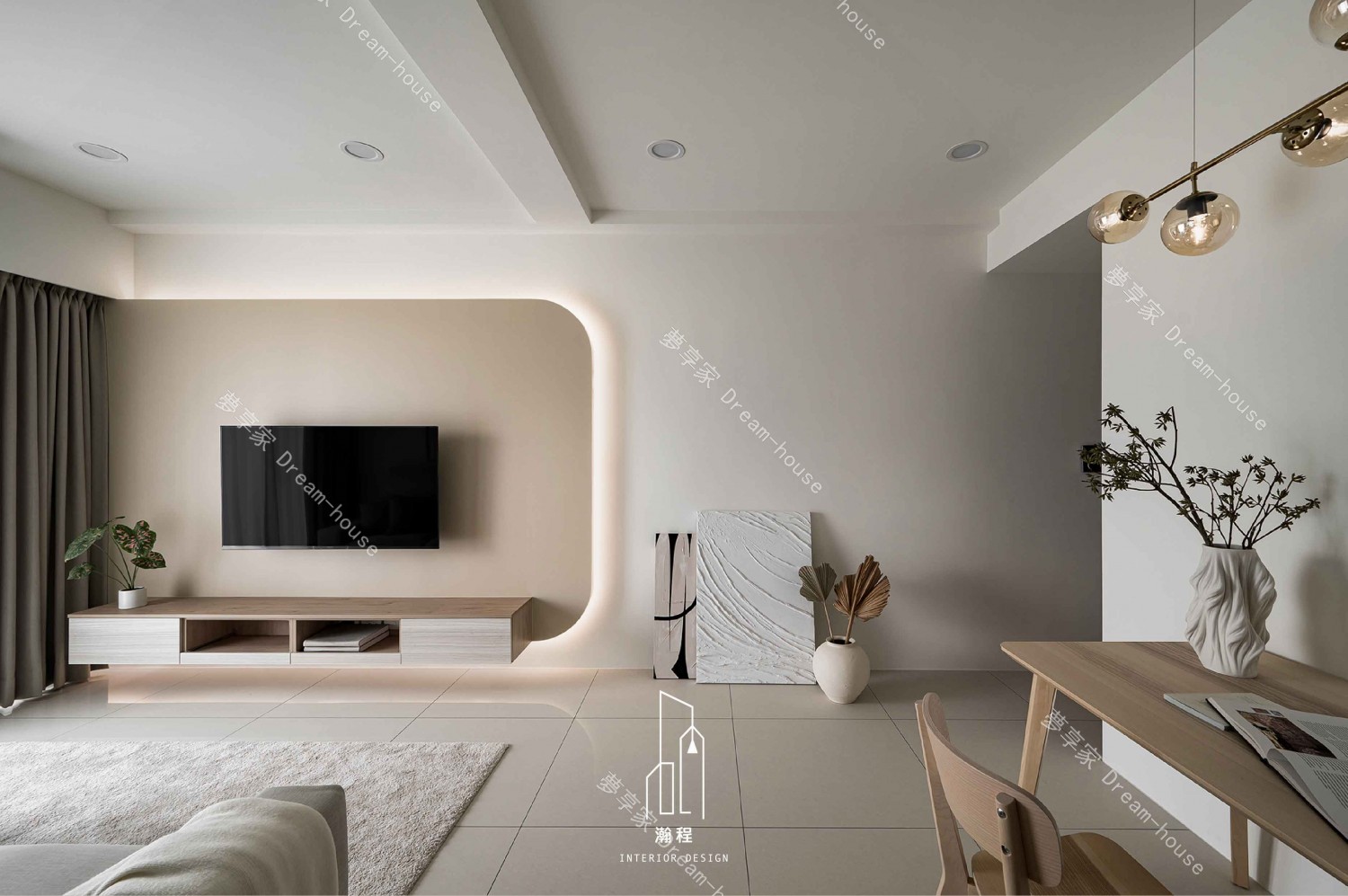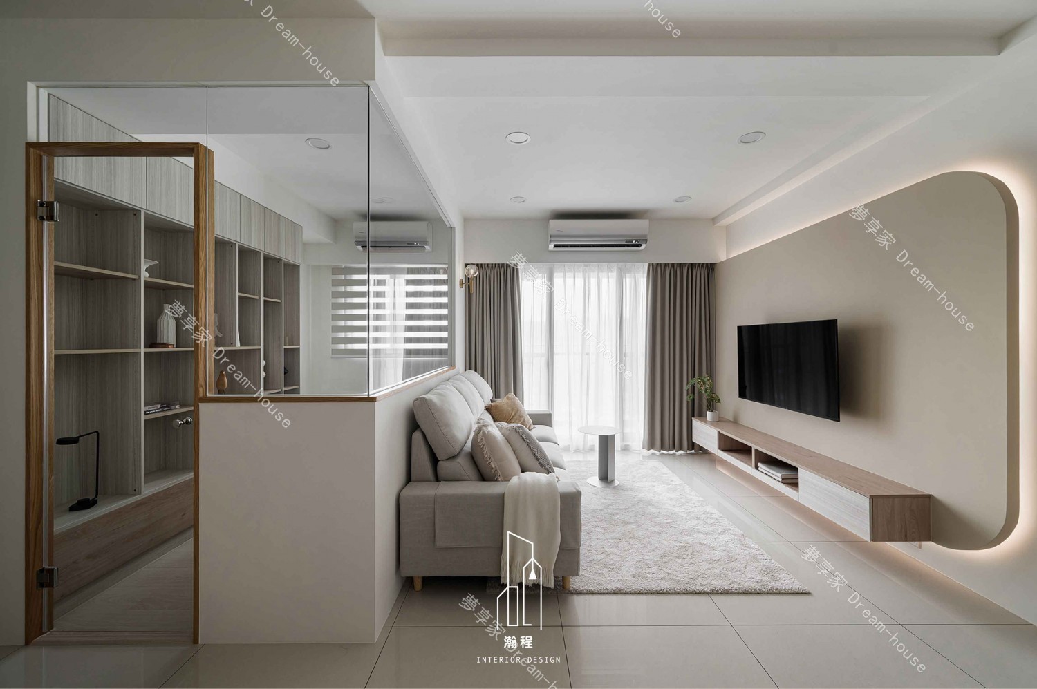 設計上需打造一個通透、採光良好的書房,兼顧展示書籍與辦公功能,並與客廳保持視覺延伸與空間互動感。整體色調以暖色系結合木紋材質,營造柔和且富質感的居家表情;客廳透過弧線造型增加細緻度與特色。主臥以系統化收納規劃為重點,提高使用效率;次臥則以機能完整、動線簡潔為方向,滿足孩子日常使用所需,構築溫馨又實用的家庭空間。