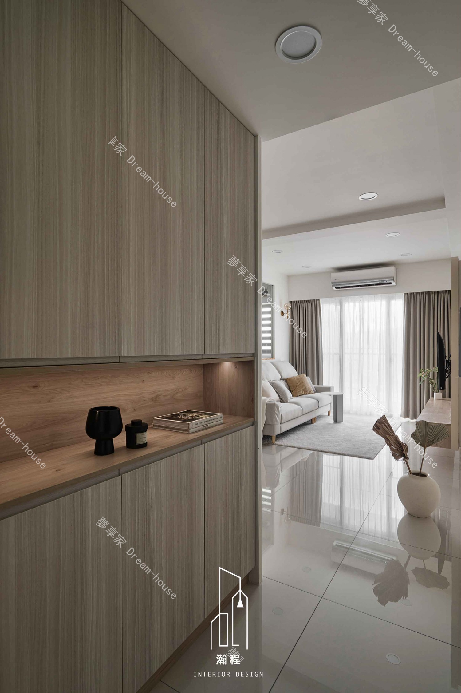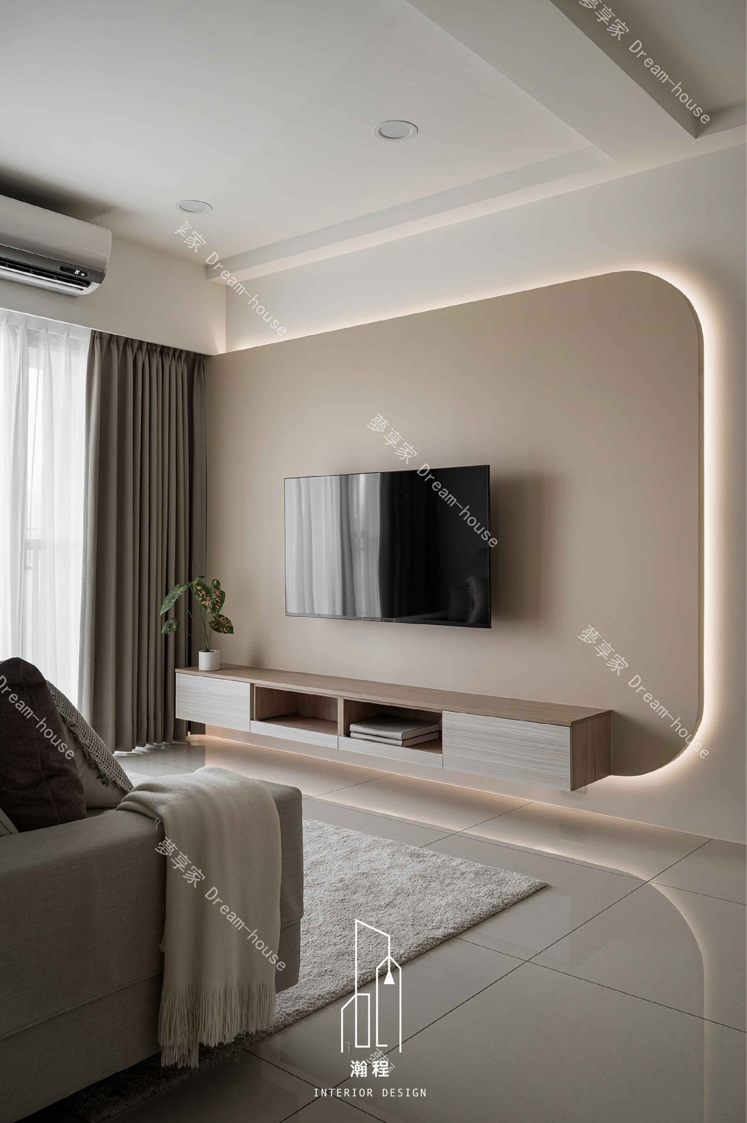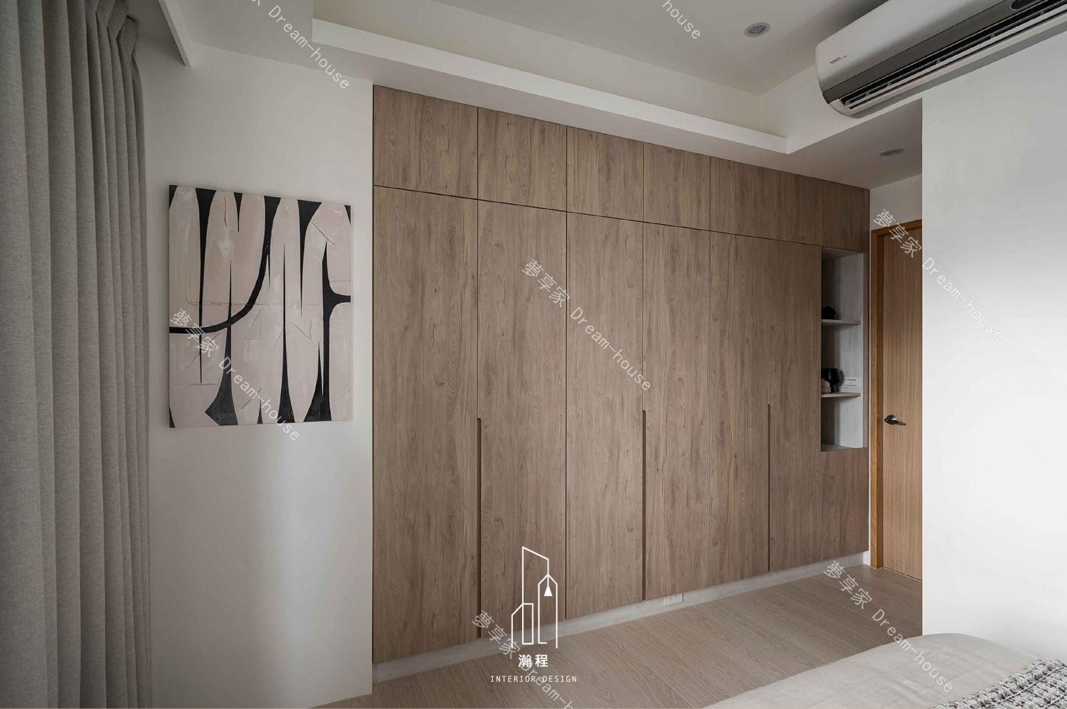 設計上需打造一個通透、採光良好的書房,兼顧展示書籍與辦公功能,並與客廳保持視覺延伸與空間互動感。整體色調以暖色系結合木紋材質,營造柔和且富質感的居家表情;客廳透過弧線造型增加細緻度與特色。主臥以系統化收納規劃為重點,提高使用效率;次臥則以機能完整、動線簡潔為方向,滿足孩子日常使用所需,構築溫馨又實用的家庭空間。