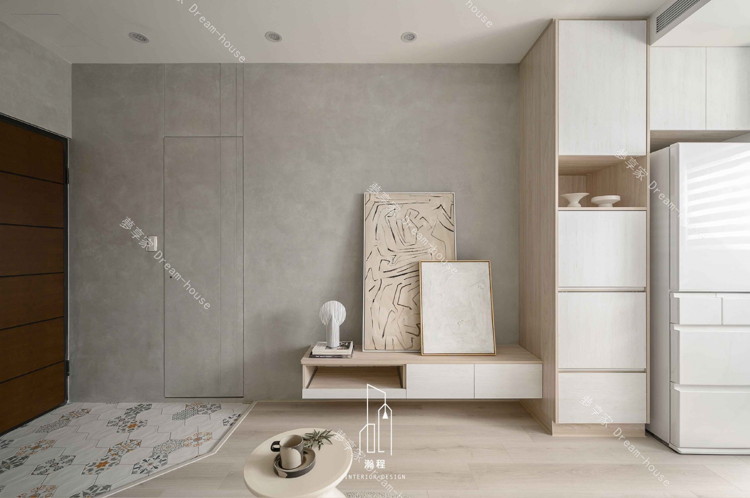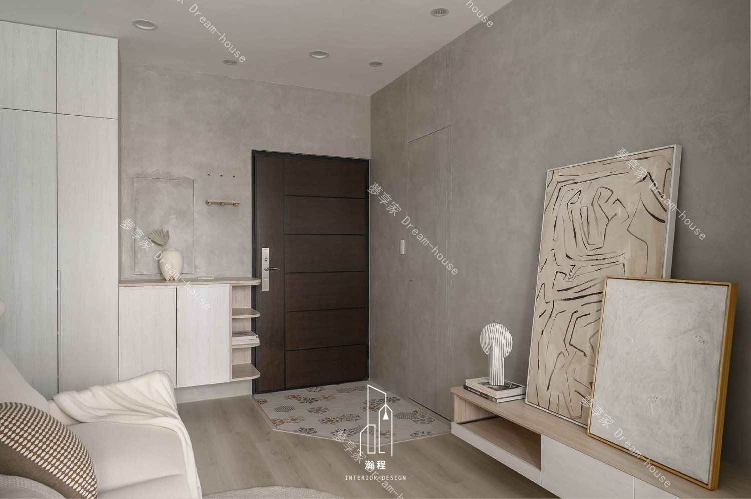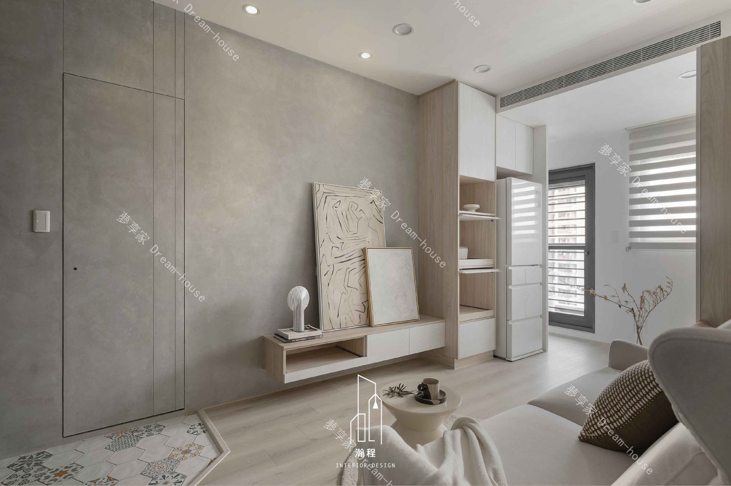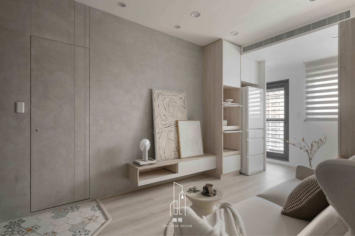 這款室內設計作品融合了現代極簡主義與自然材質,創造出一個舒適、清新的生活空間。以灰色水泥牆面和溫暖木質元素為主,配合簡約的家具設計,整體氛圍既現代又富有藝術感。精心挑選的裝飾畫與細緻的燈具,為空間增添了一絲藝術氣息。開放式布局和簡潔的線條,使整個空間顯得更加寬敞、流暢,完美呈現現代家居的精緻與實用。這樣的設計,無論是視覺還是功能性,都展現出極致的美學與舒適感,為現代都市生