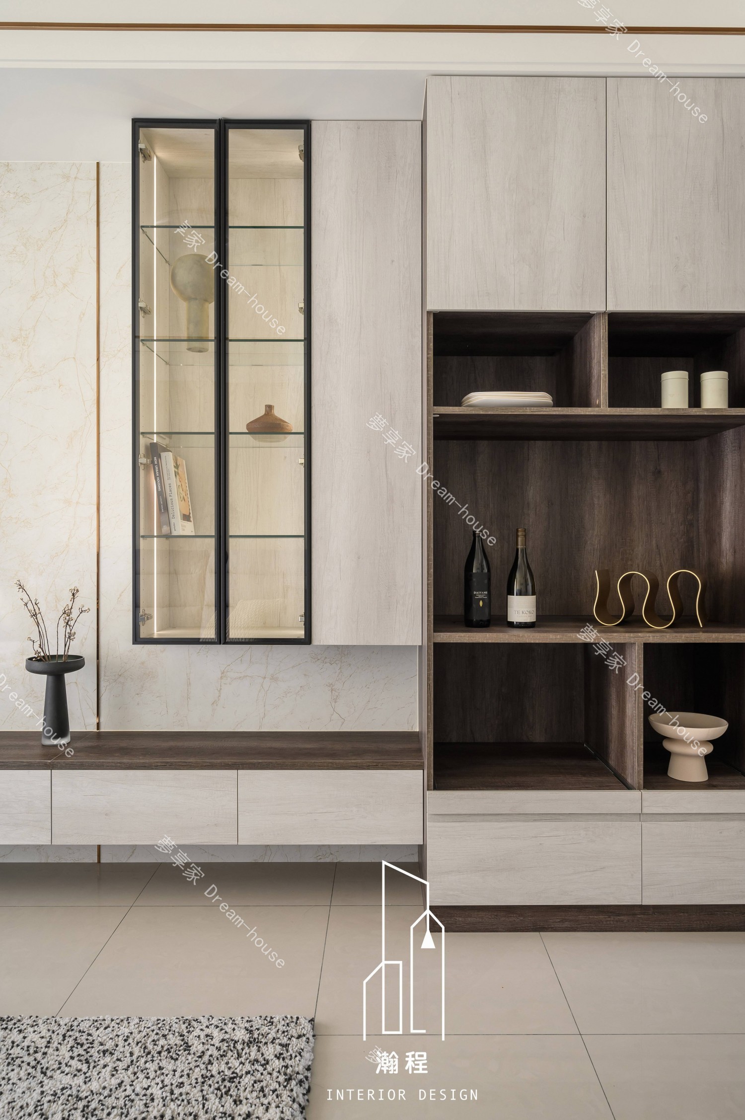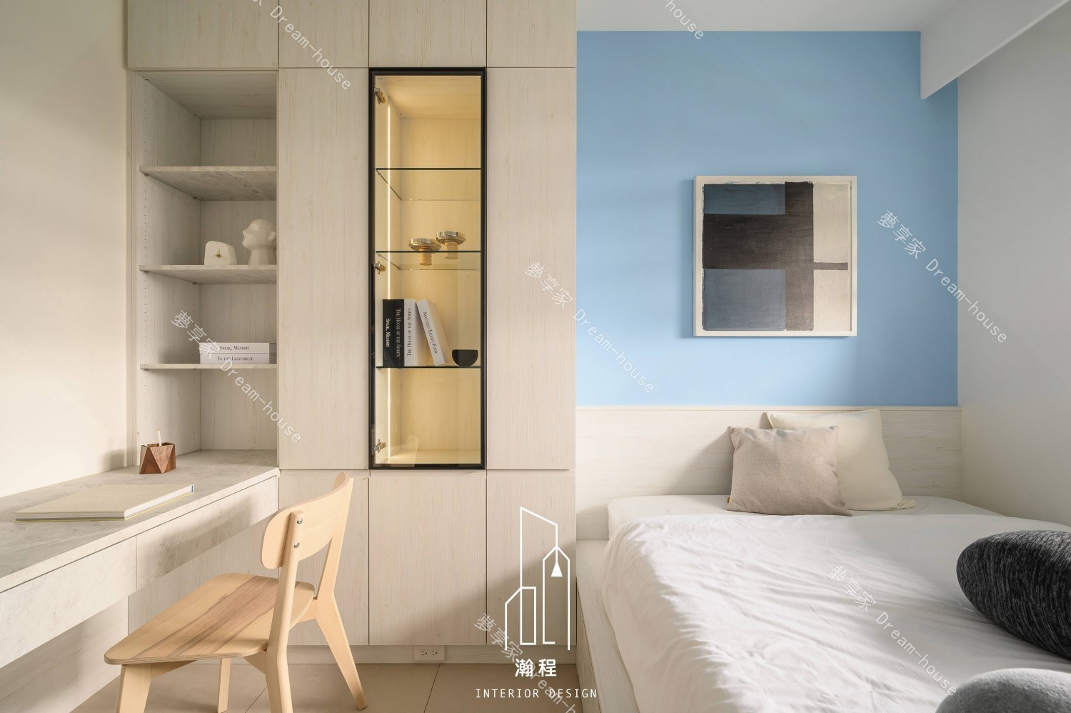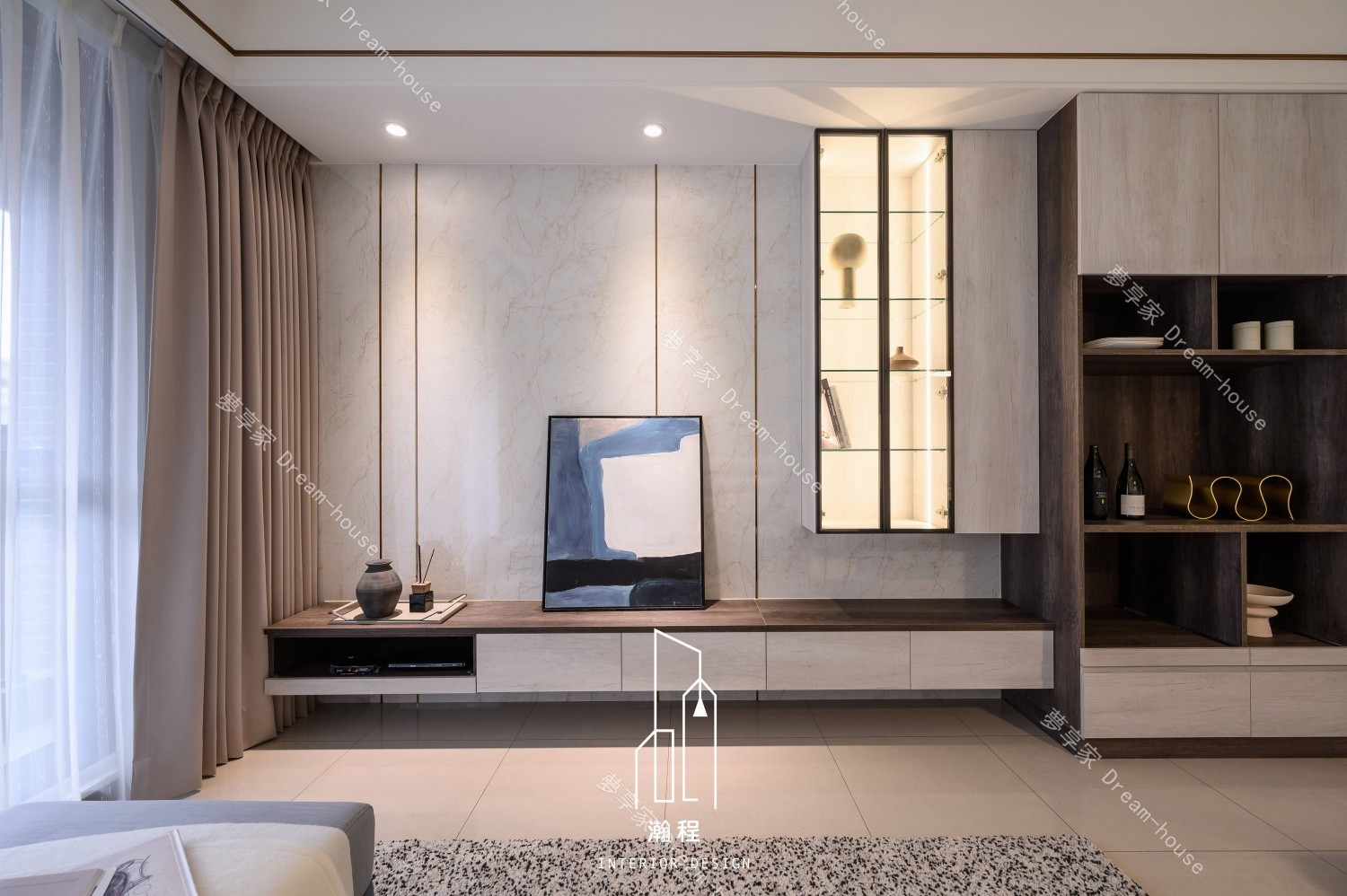 客廳空間透過淡色沙發與漸層牆面構圖,呈現視覺的層次感,同時融入圓弧與直線的交錯,象徵生活的柔軟與秩序。電視主牆選用仿大理石紋的美耐板與木質相結合,搭配內嵌燈光展示櫃,在簡潔中帶出細節的精緻度。臥室則延續整體的自然語彙,以淺木色櫃體搭配俐落線條,融合收納與書桌機能,創造出靜謐且舒心的休憩氛圍。