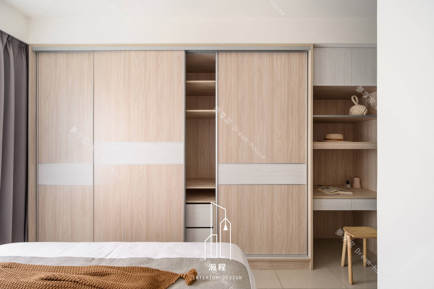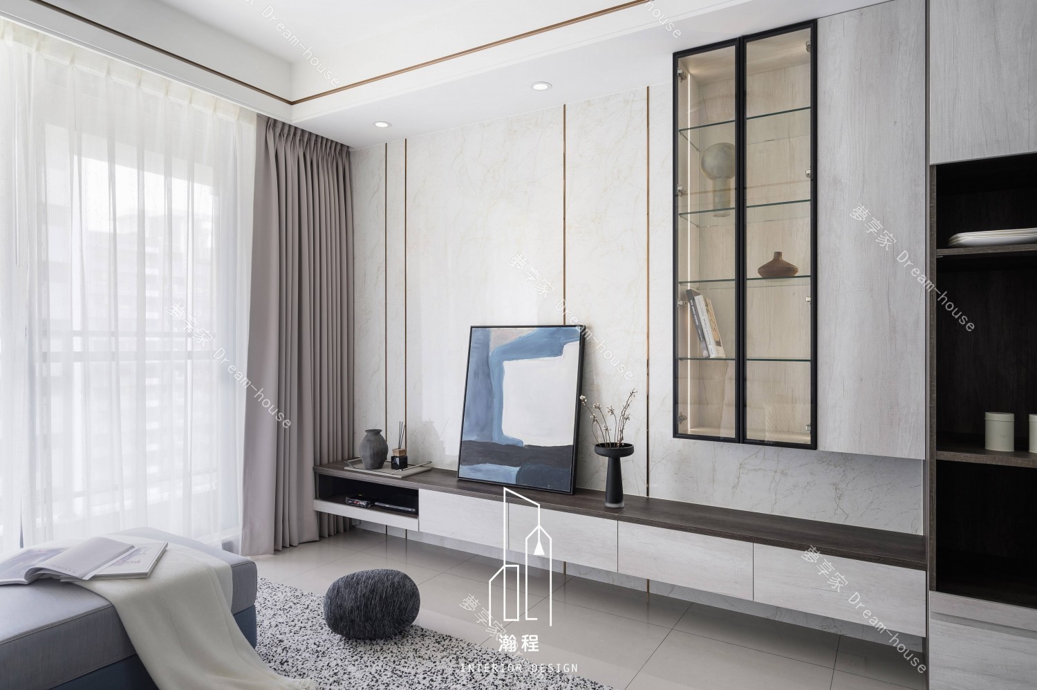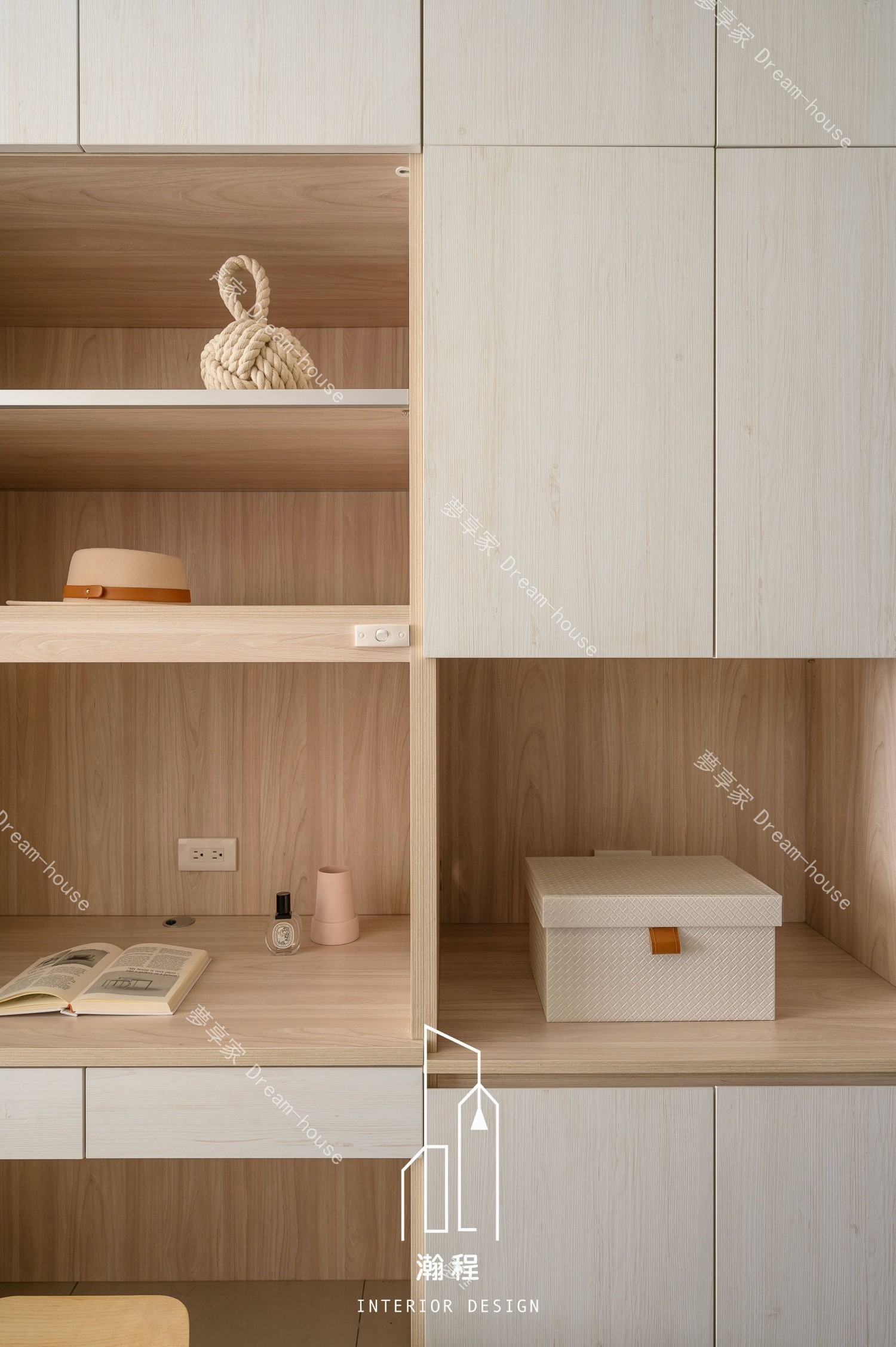 客廳空間透過淡色沙發與漸層牆面構圖,呈現視覺的層次感,同時融入圓弧與直線的交錯,象徵生活的柔軟與秩序。電視主牆選用仿大理石紋的美耐板與木質相結合,搭配內嵌燈光展示櫃,在簡潔中帶出細節的精緻度。臥室則延續整體的自然語彙,以淺木色櫃體搭配俐落線條,融合收納與書桌機能,創造出靜謐且舒心的休憩氛圍。