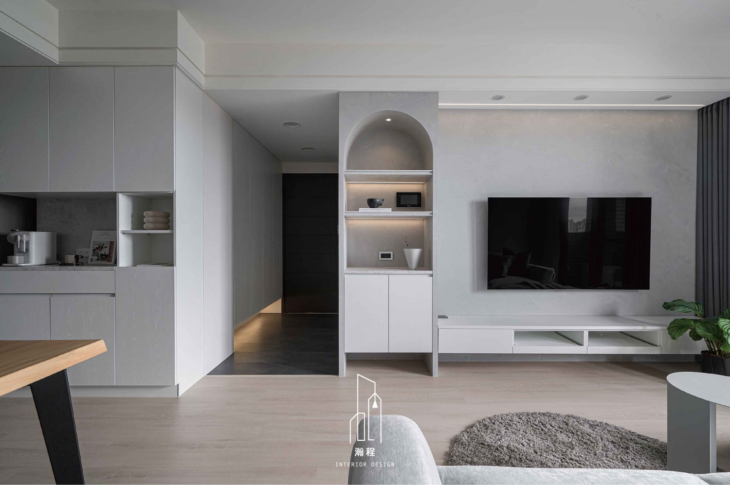 設計上以潔白木質櫃體與灰色塗料牆面為主軸,打造出沉穩且純淨的空間基調。透過圓弧形櫃架、隱藏式照明與柔和光影層次提升視覺細緻度;並在客廳運用簡約電視牆、實用櫃體與綠植搭配,讓極簡風格更具溫度與質感。整體配置著重功能性、色調平衡與空間開闊度,呈現現代極簡中帶有舒適與生活氣息的居家環境。 屋主訴求