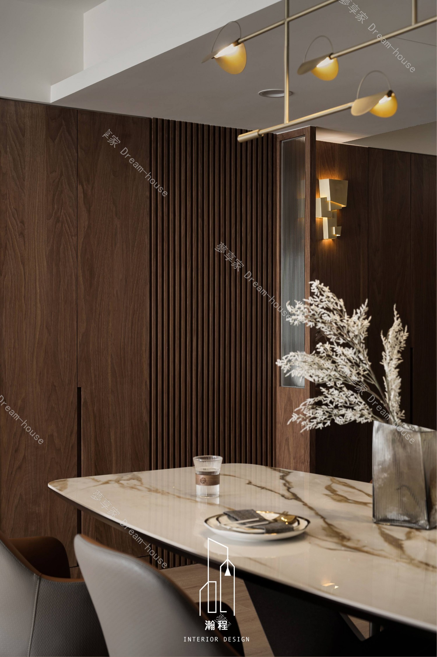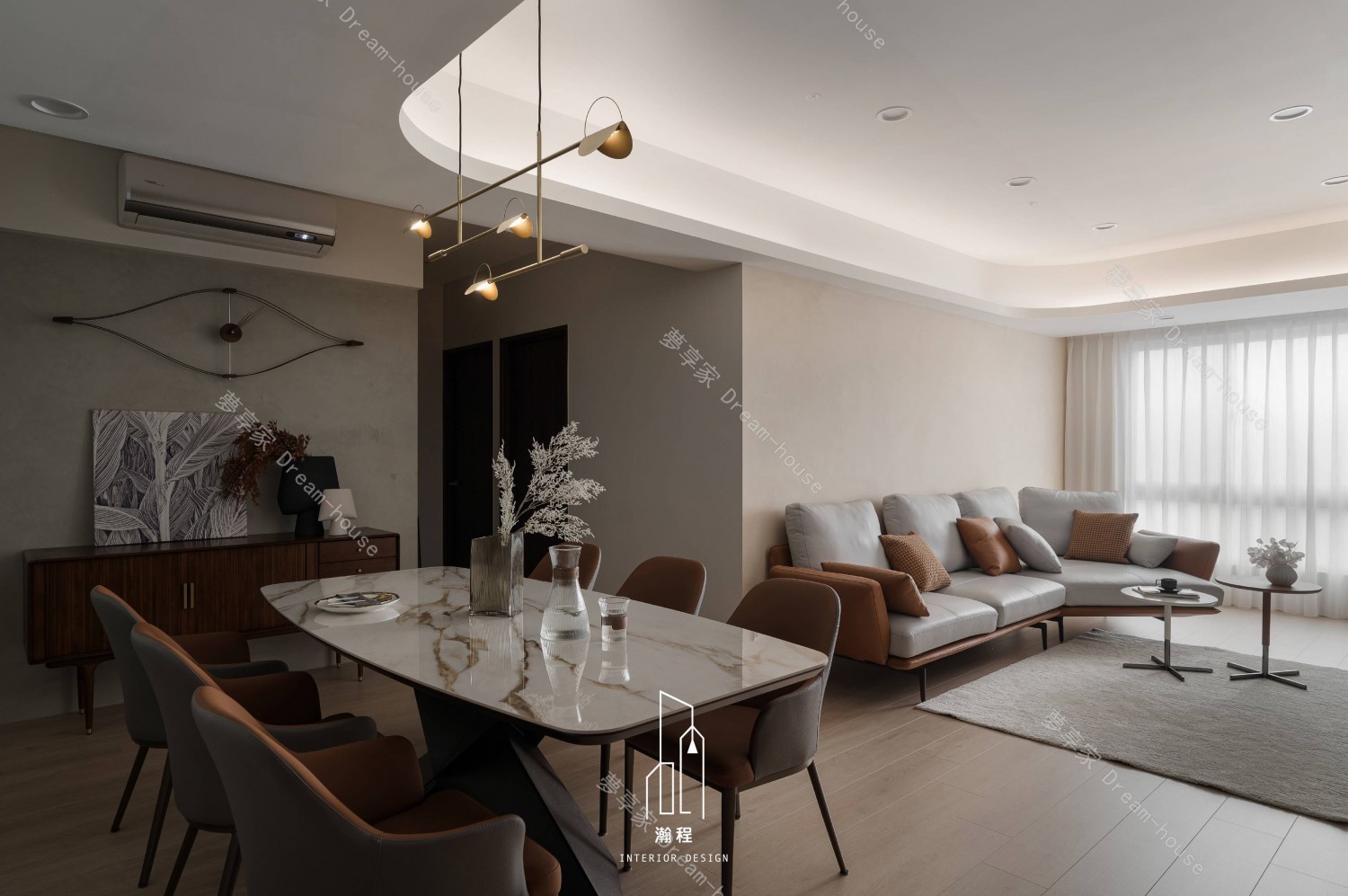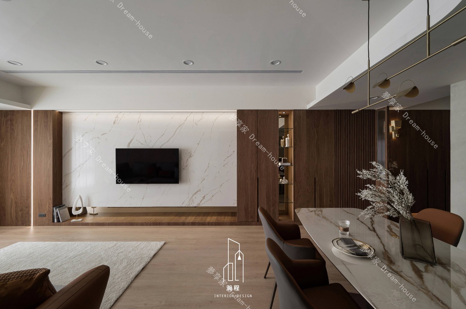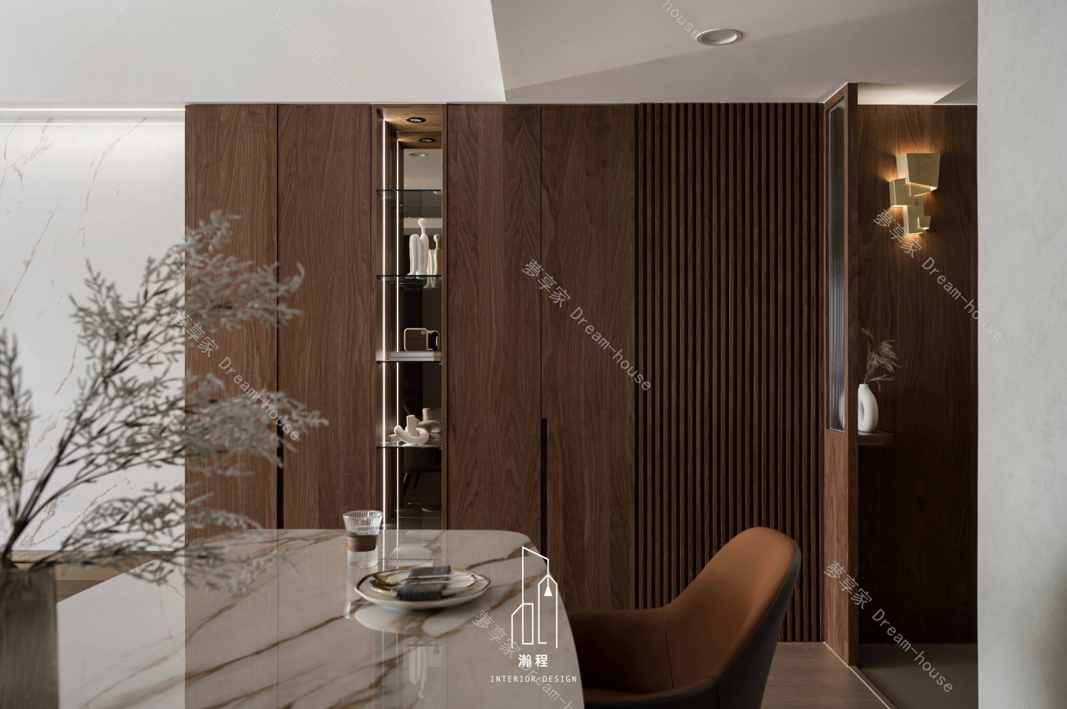 這個設計作品專為一位退休老師打造,秉持著尊重過往歲月與智慧的精神,選用了胡桃木作為主要的材質,以其深邃的色調與穩重的質感,營造出一個寧靜、優雅的居住空間。胡桃木的自然紋理與色澤,讓空間散發出溫暖、沉穩的氛圍,並呼應了主人的品味與內涵。結合暖色調的皮椅與木質元素,增添了一份舒適和自然氛圍。設計師巧妙運用了大理石紋路桌面和牆面,帶來一種優雅且不失現代感的視覺效果,並且搭配低調