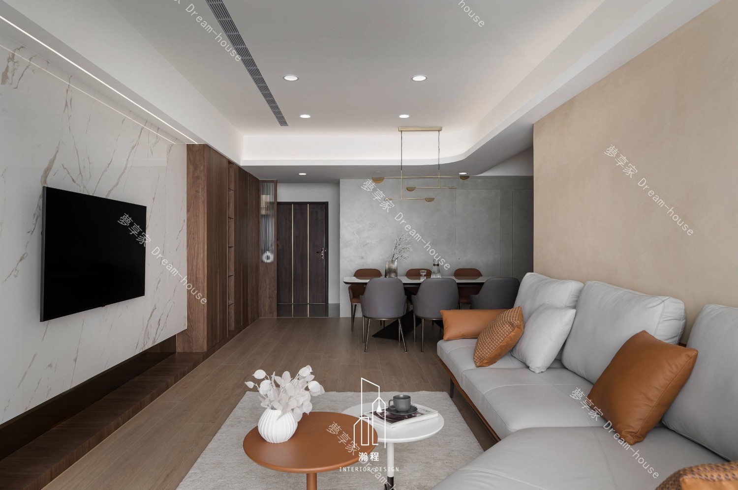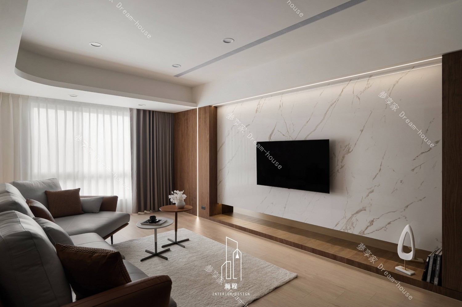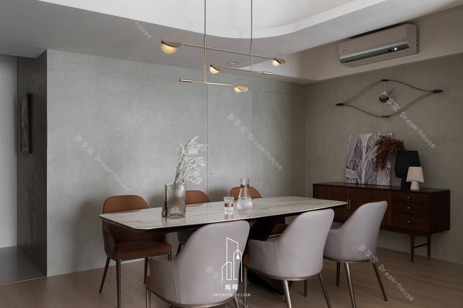 這個設計作品專為一位退休老師打造,秉持著尊重過往歲月與智慧的精神,選用了胡桃木作為主要的材質,以其深邃的色調與穩重的質感,營造出一個寧靜、優雅的居住空間。胡桃木的自然紋理與色澤,讓空間散發出溫暖、沉穩的氛圍,並呼應了主人的品味與內涵。結合暖色調的皮椅與木質元素,增添了一份舒適和自然氛圍。設計師巧妙運用了大理石紋路桌面和牆面,帶來一種優雅且不失現代感的視覺效果,並且搭配低調