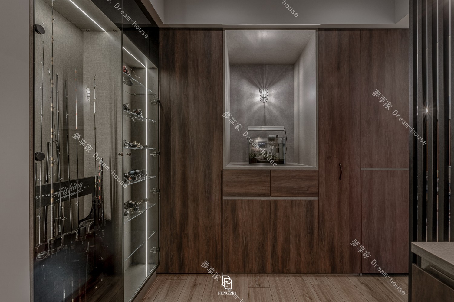 玄關區規劃了一座黑玻展示櫃,靈感來自業主對釣魚的熱愛。平時櫃內物品隱而不顯,開燈後則宛如展示藝術收藏般,將釣具化作生活美學的一部分。