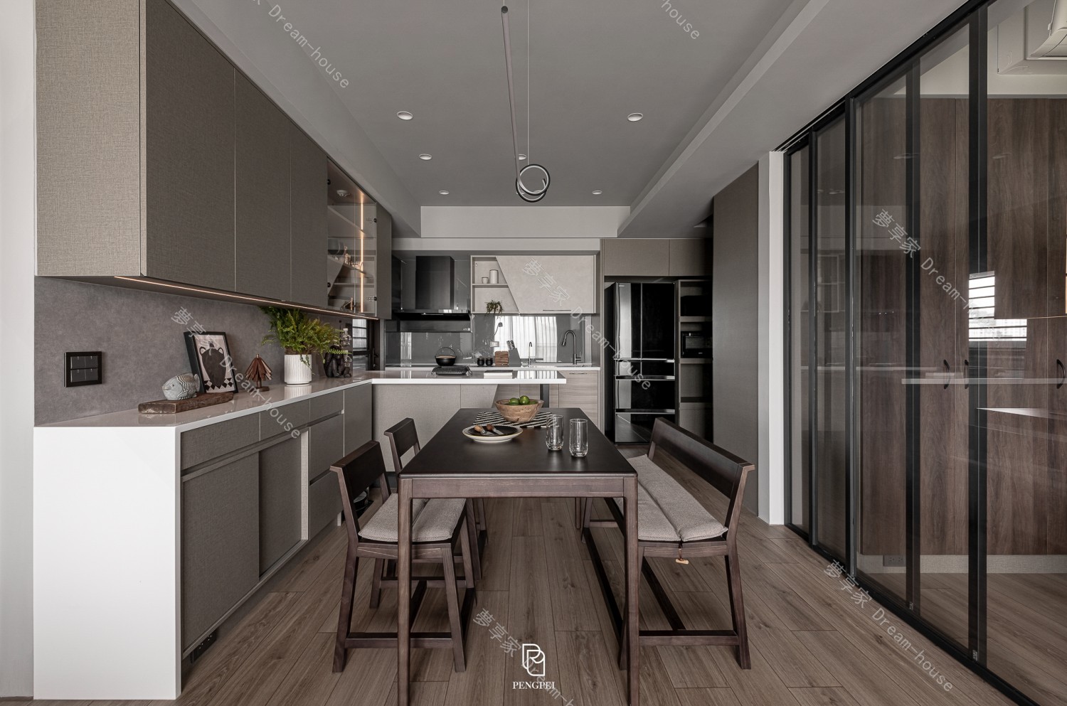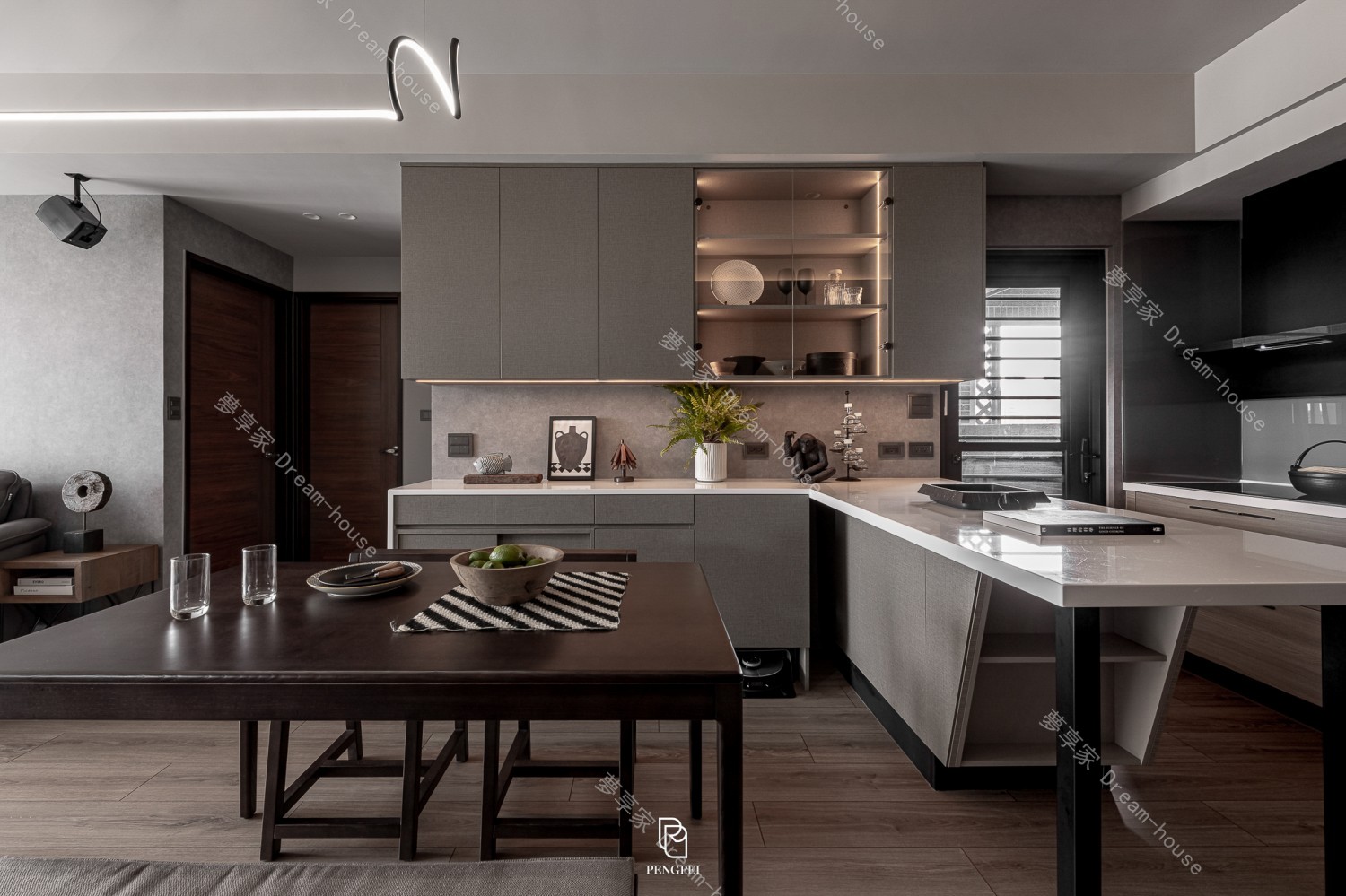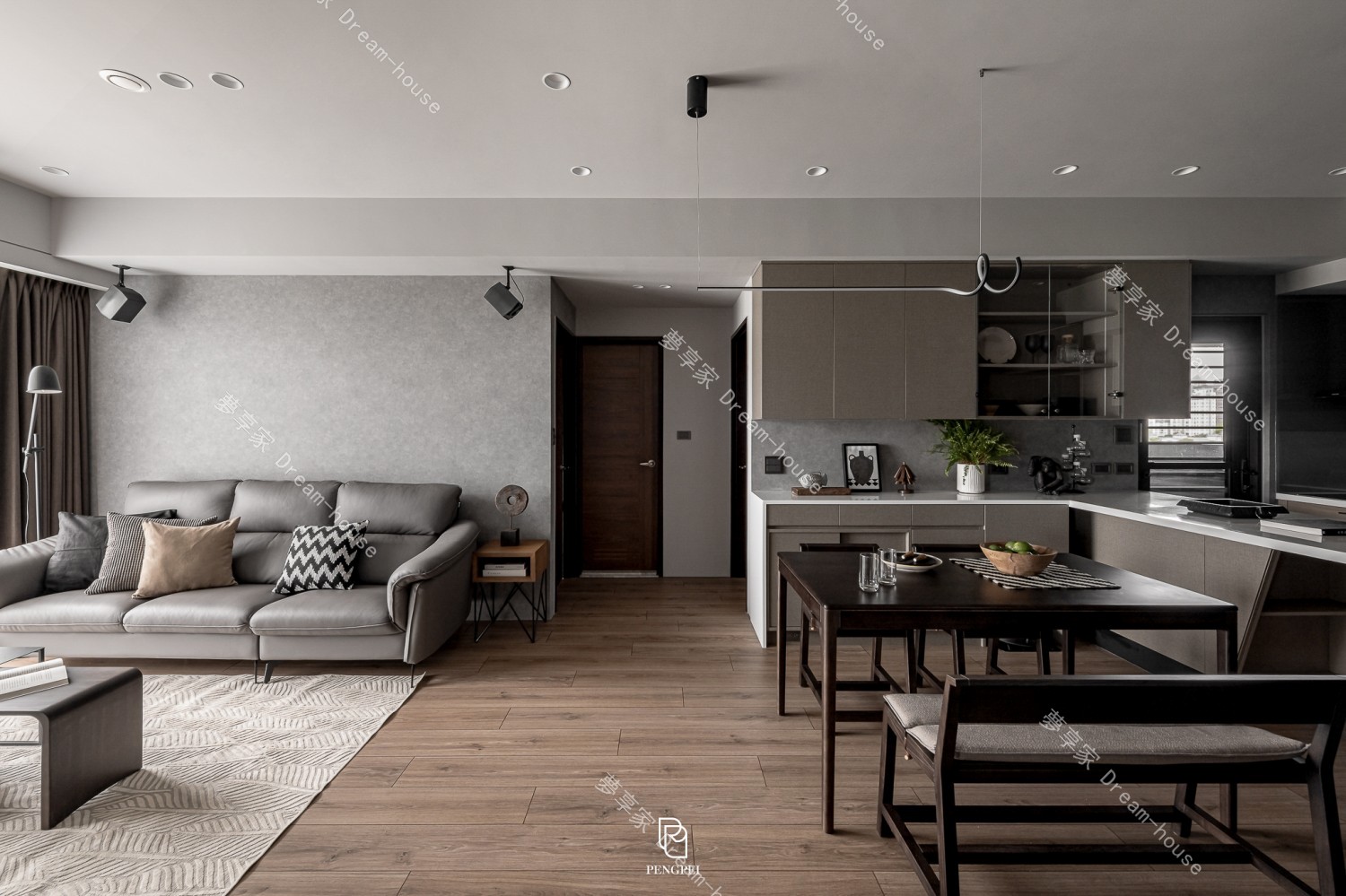 業主偏好深色現代風格,在色彩規劃上,全室以淺灰色系油漆為主調,局部搭配深木紋系統門板作為跳色對比,展現沉穩氣質。