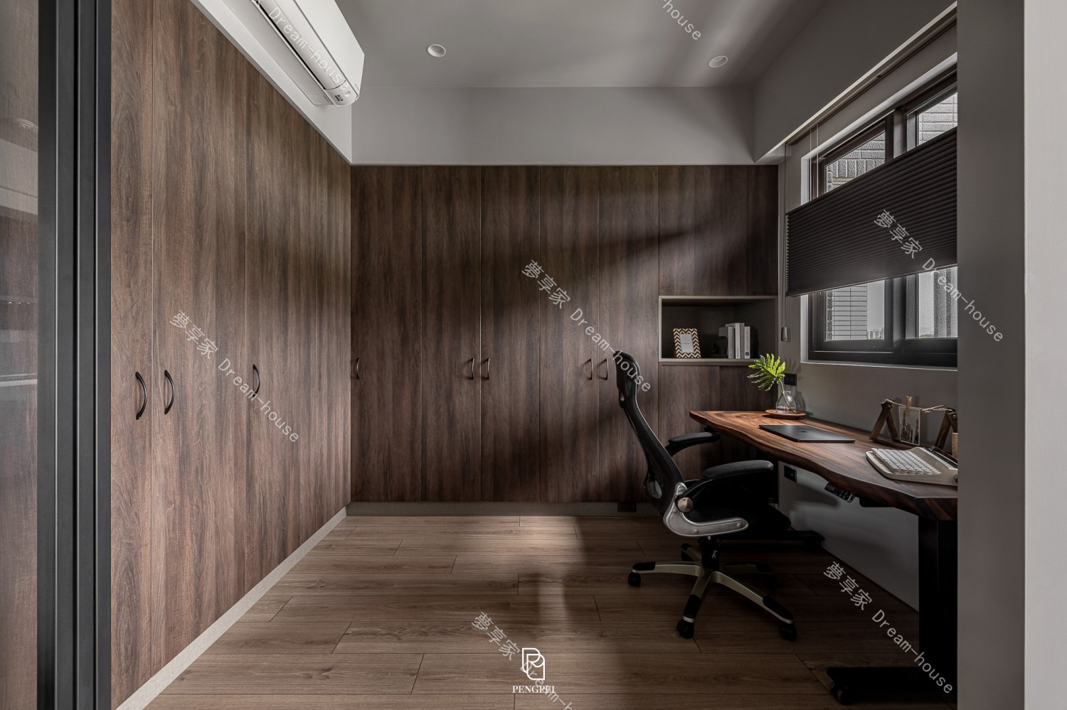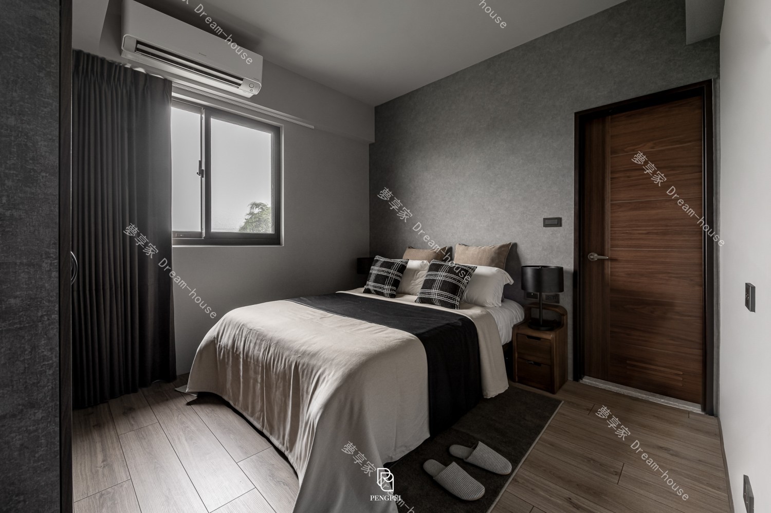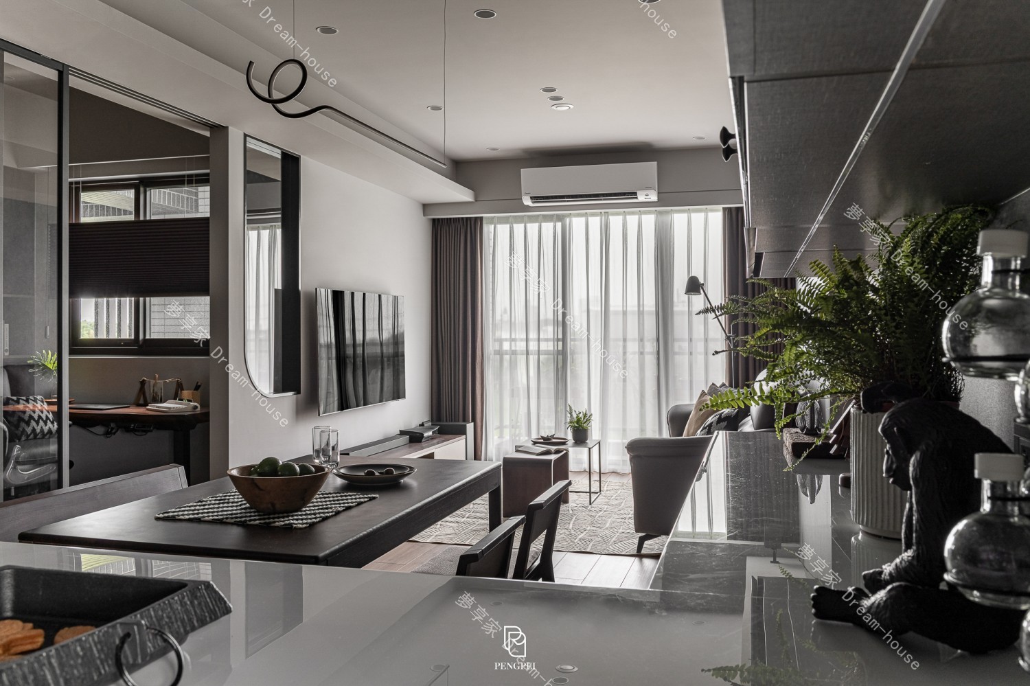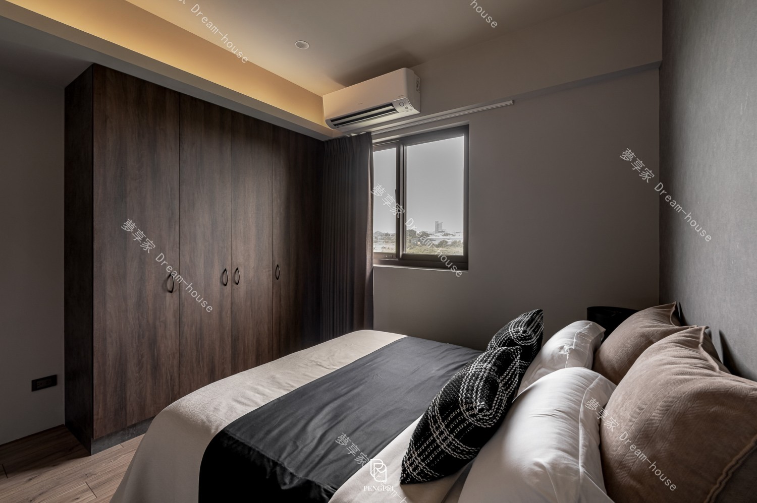 業主偏好深色現代風格,在色彩規劃上,全室以淺灰色系油漆為主調,局部搭配深木紋系統門板作為跳色對比,展現沉穩氣質。