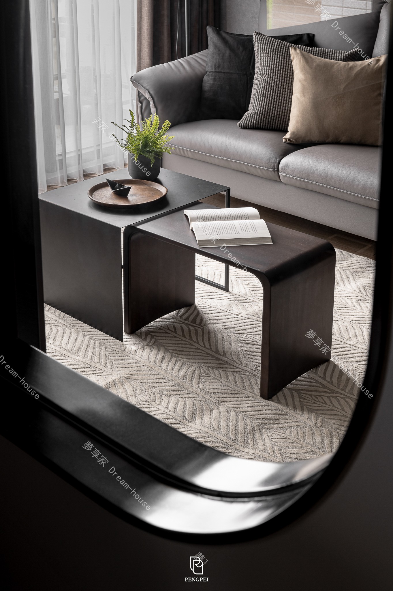 為了放大公共空間的視覺感受,我們拆除原有隔間,於牆面加入弧形玻璃元素,並採用玻璃橫拉門,使光線得以流動,讓客廳的深度在視覺上自然延伸。