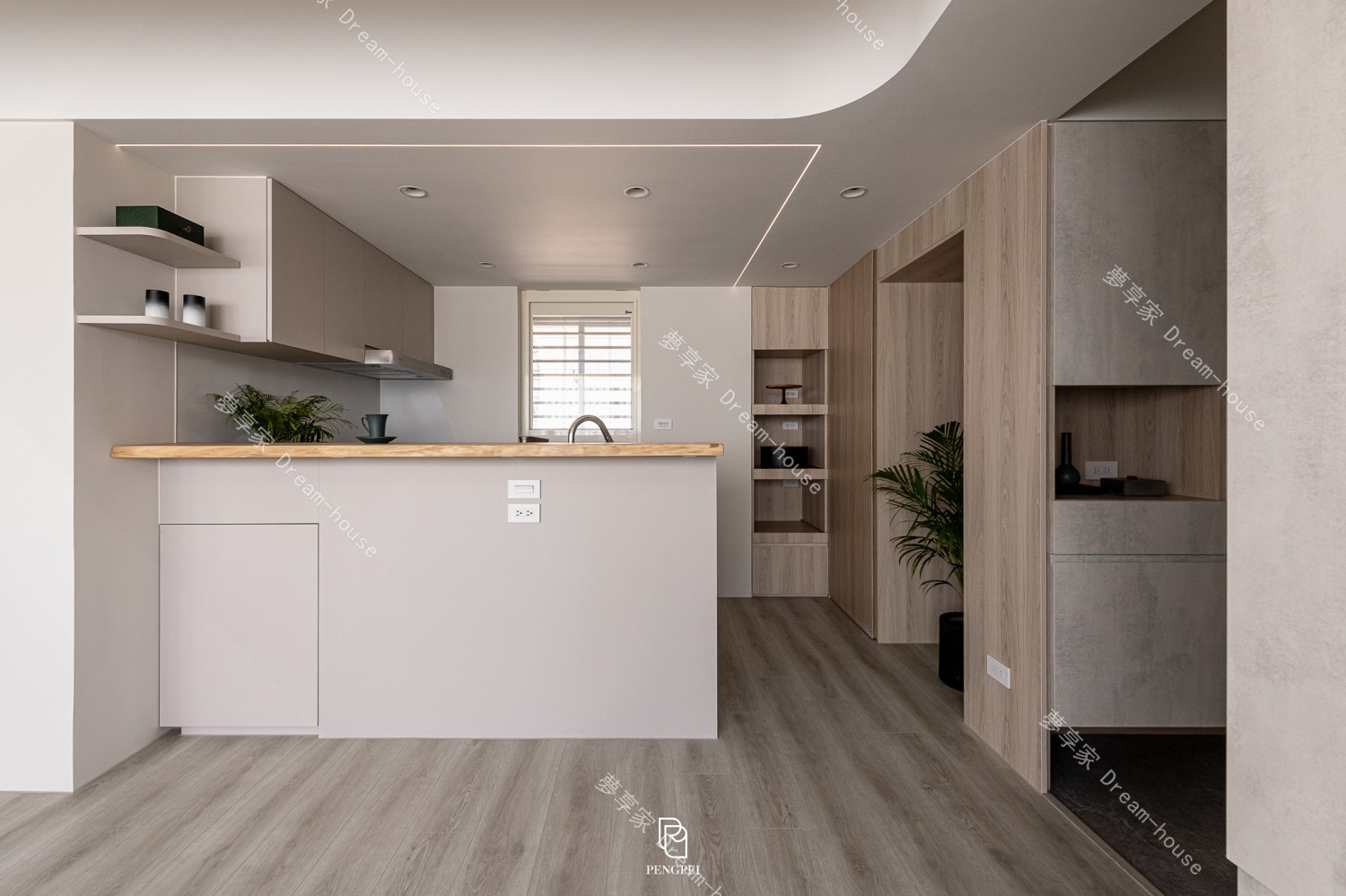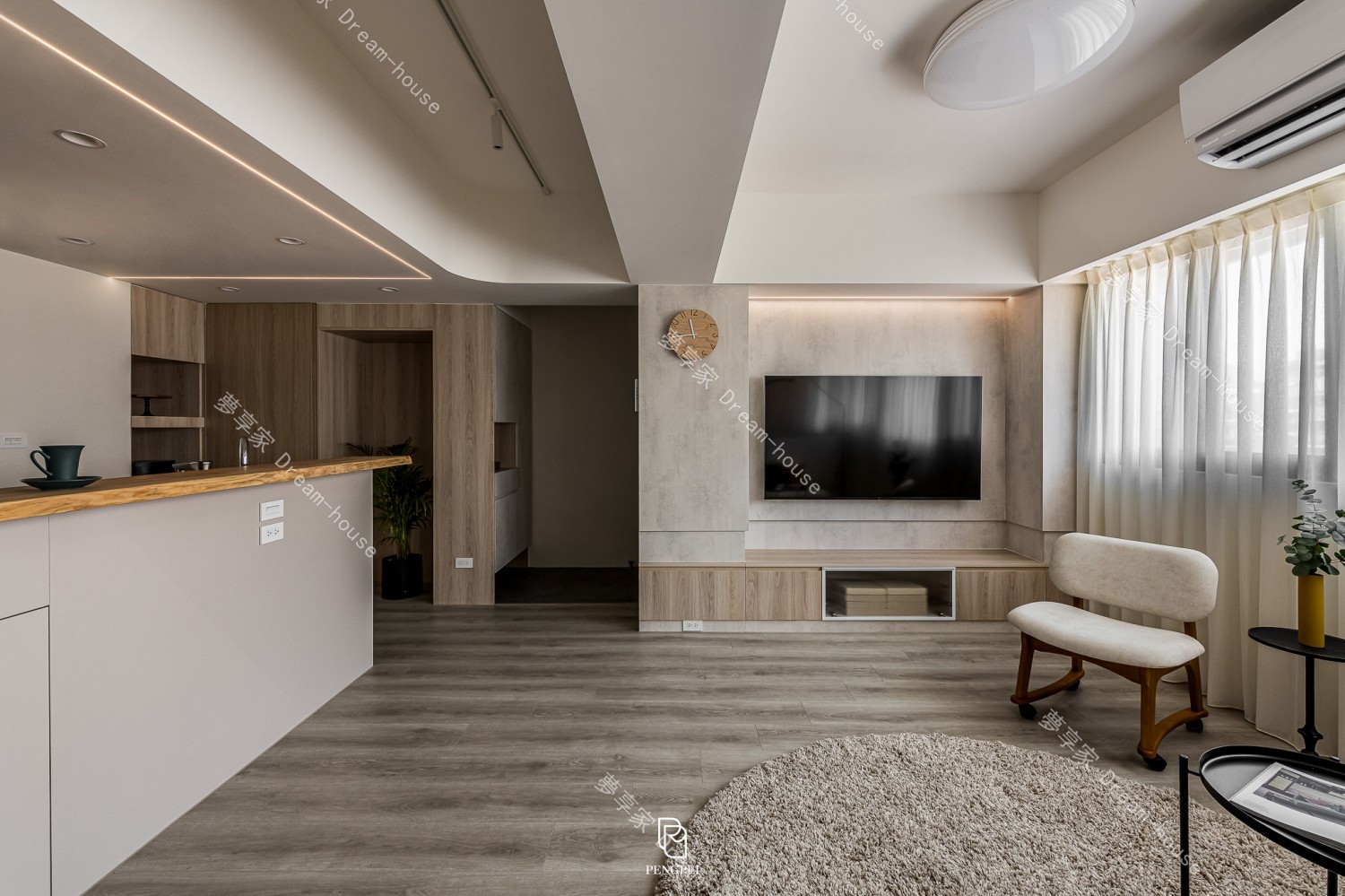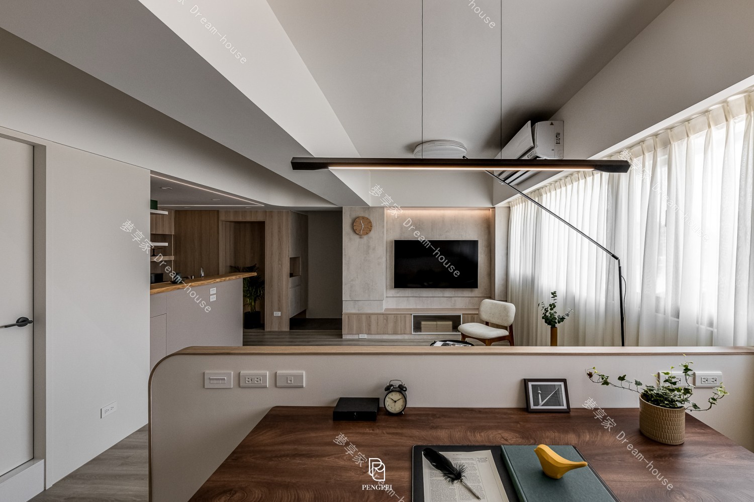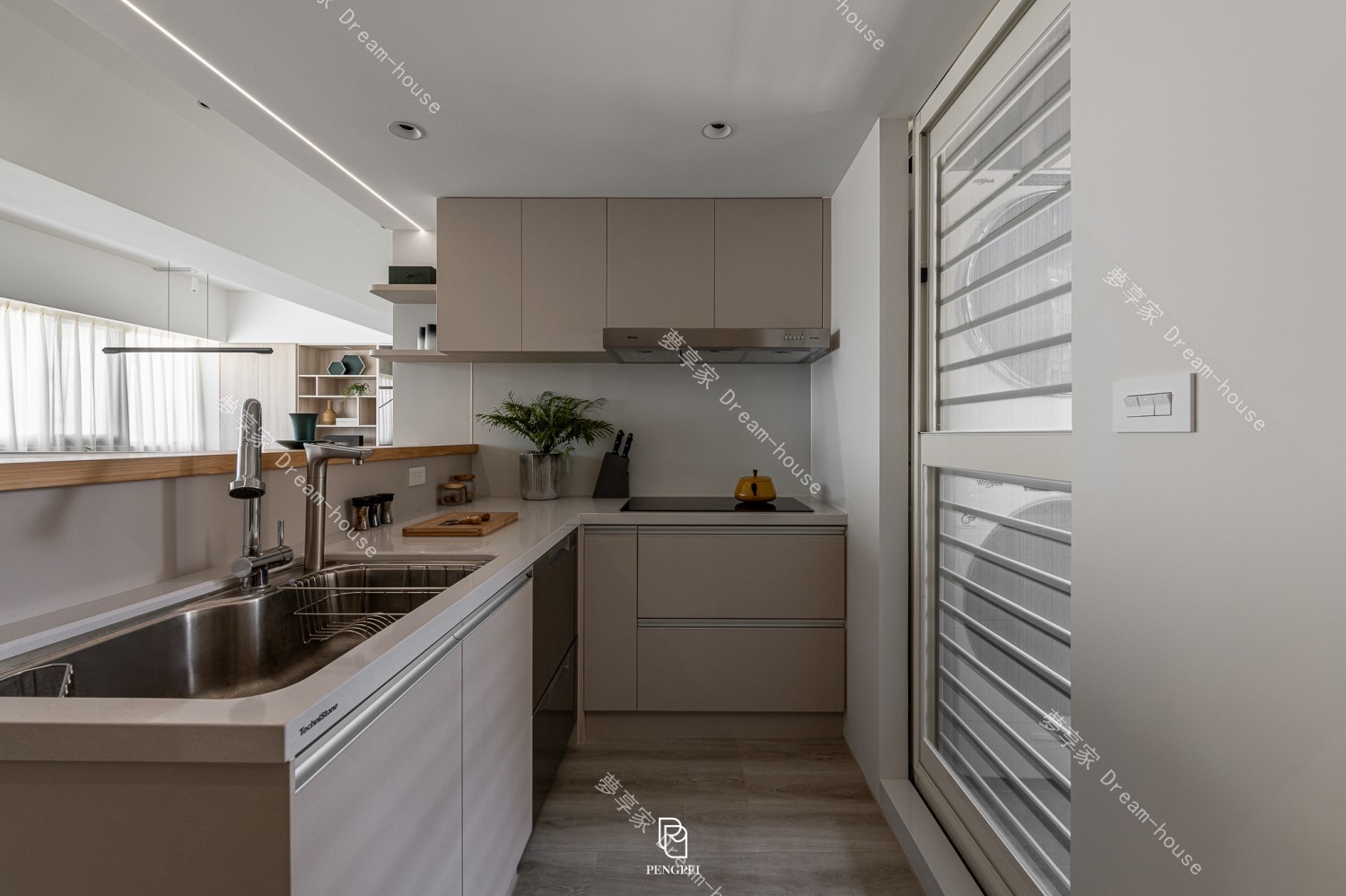 - 此戶型擁有都市住宅少有的三面採光,我們將原三房的格局重新配置成兩房,讓工作區擁有充分的視野與自然光。廚房由一字型改為面向客廳的 L 型配置,並整合隱藏儲藏間,使公共區域的動線與使用性同步提升。