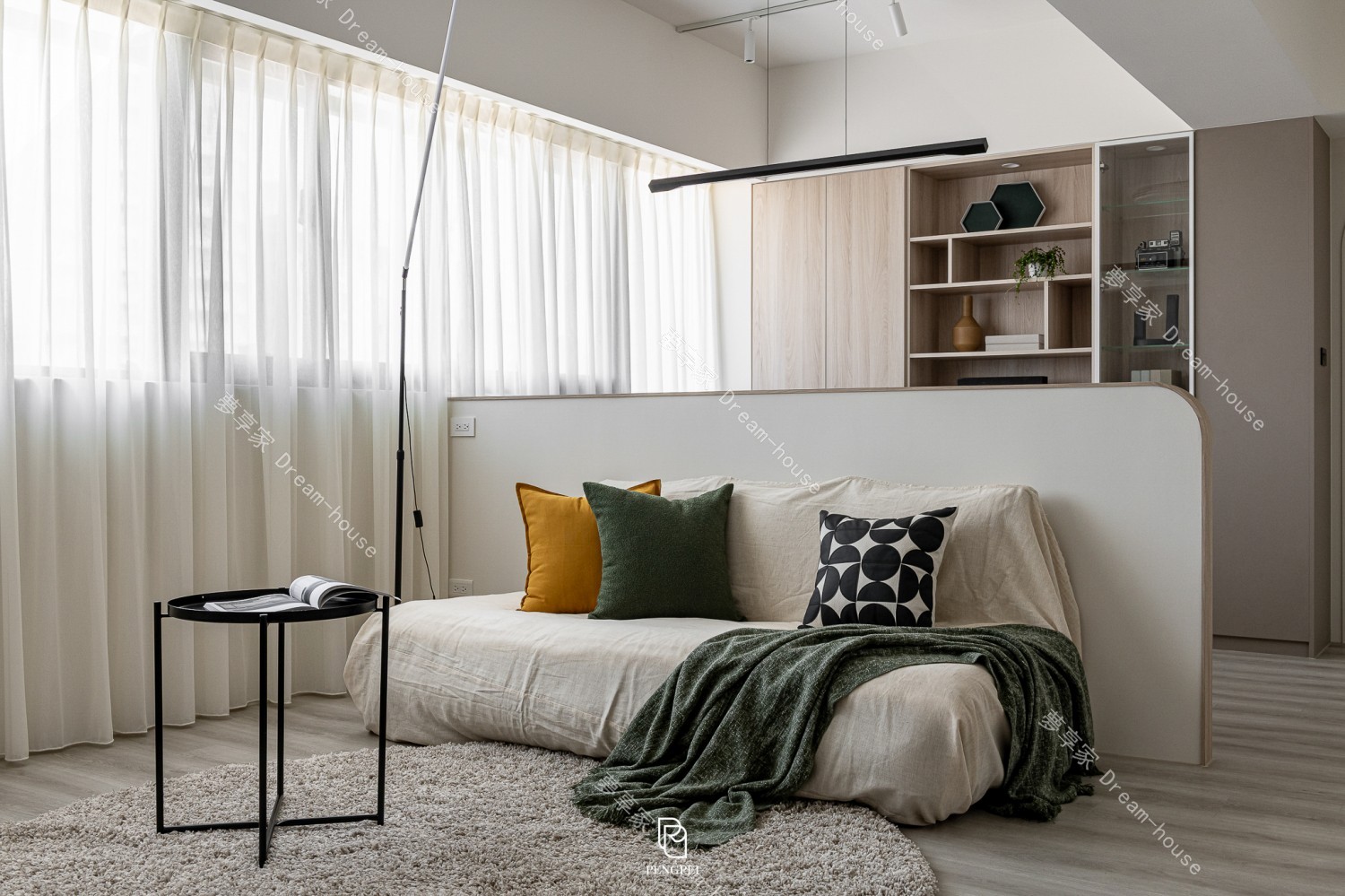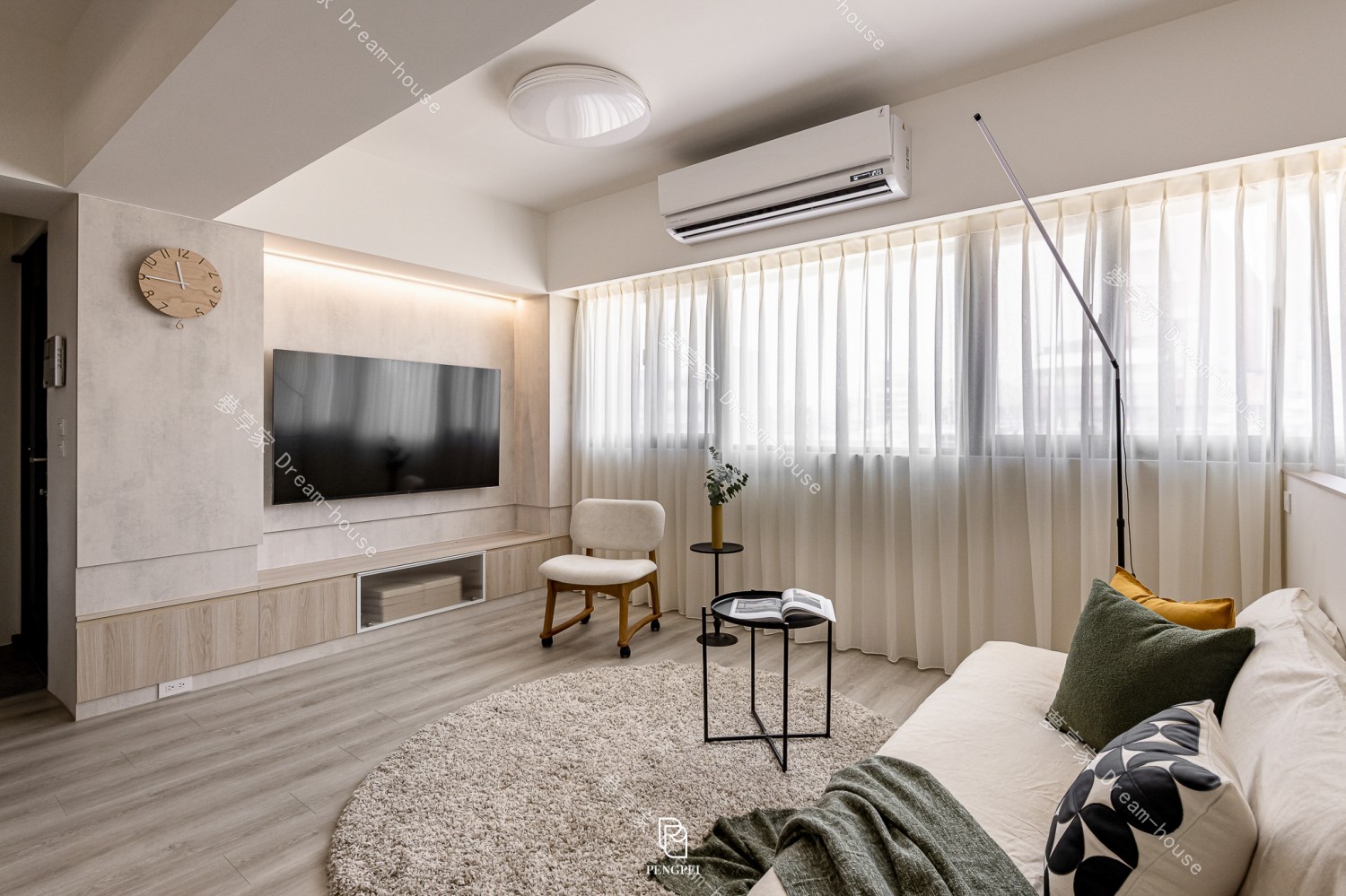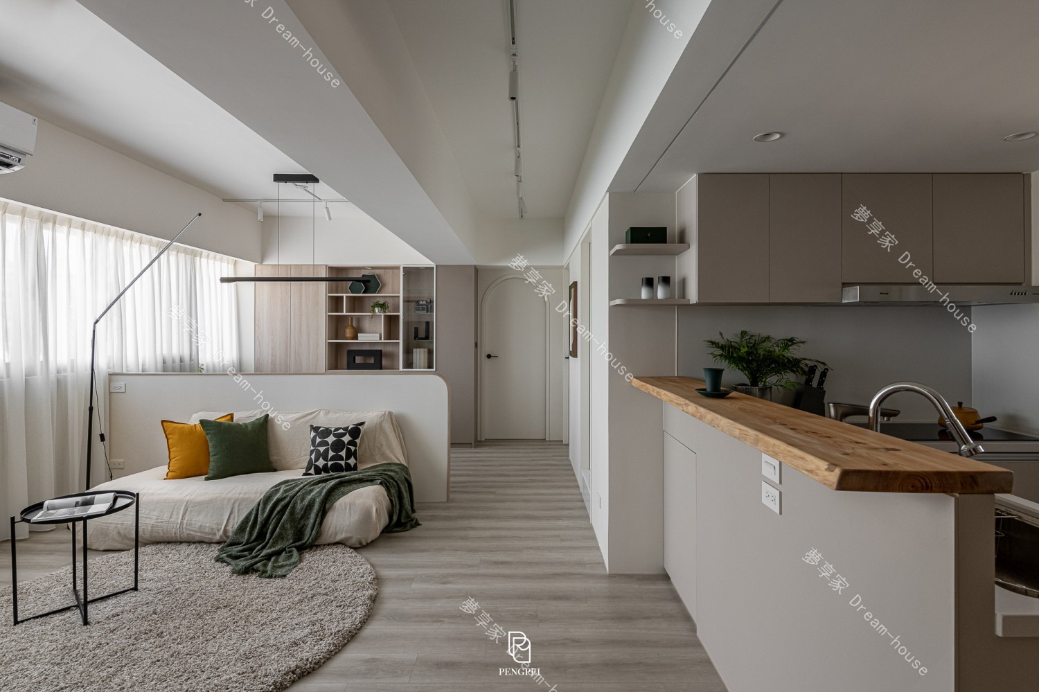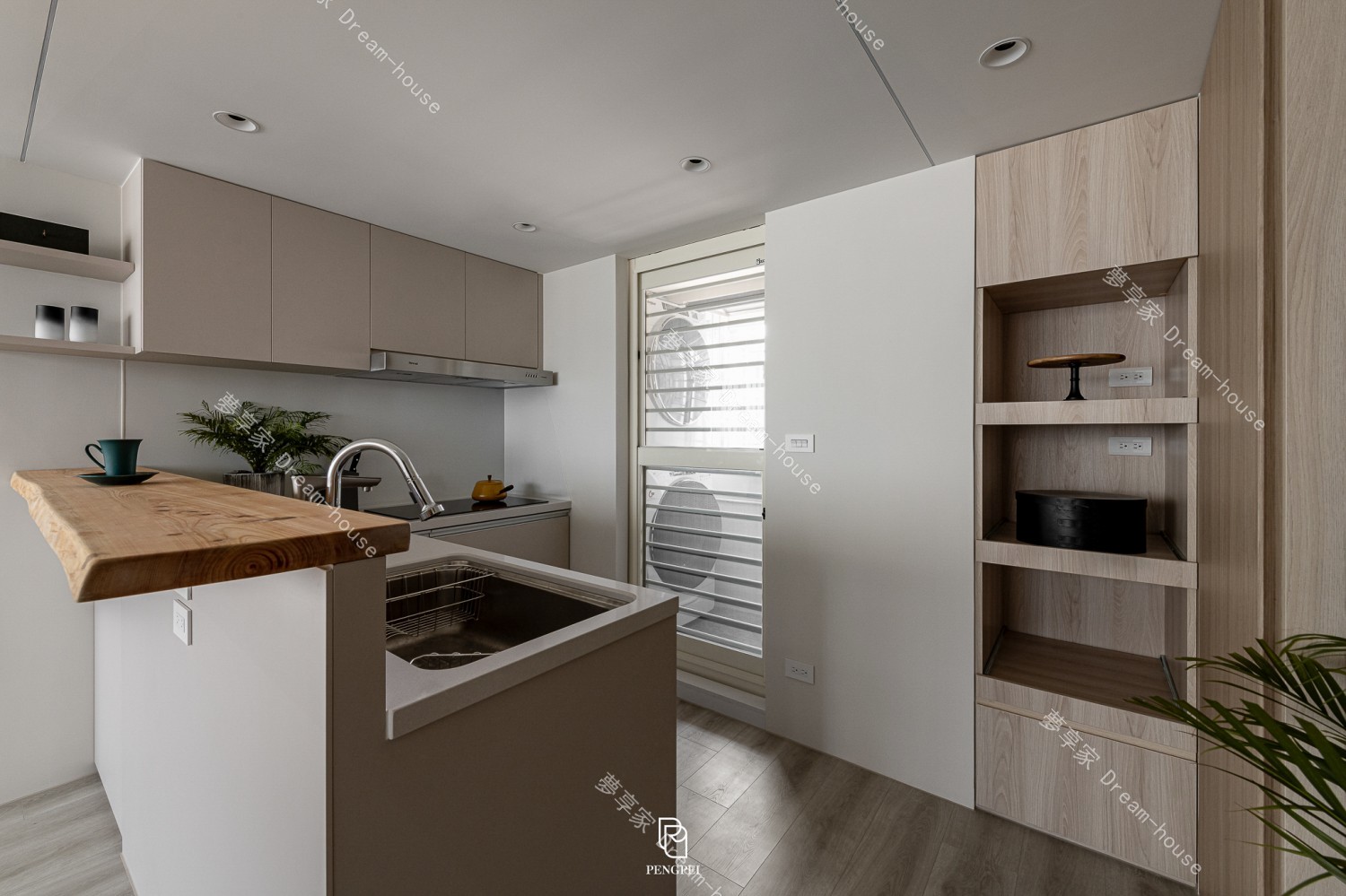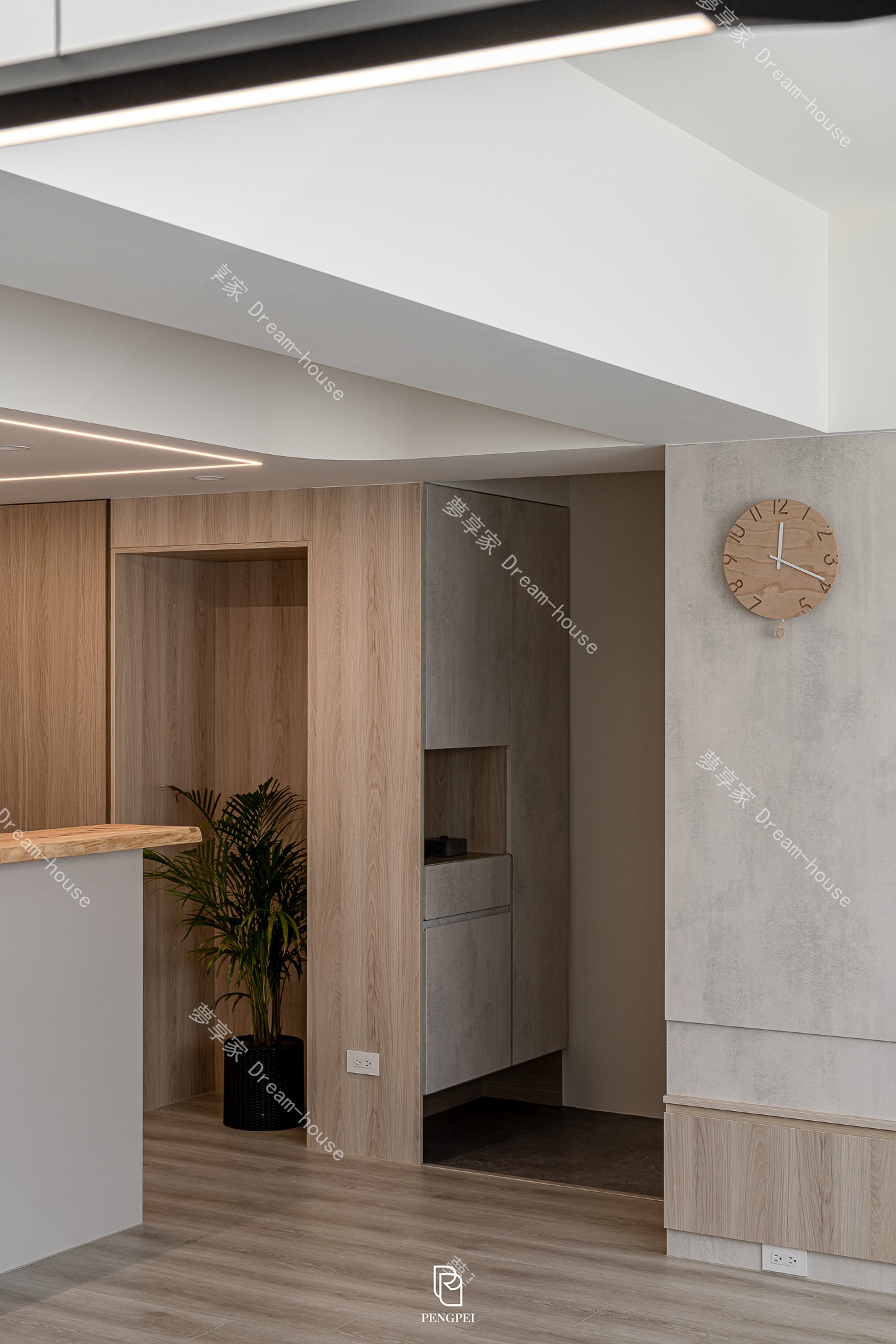 - 此戶型擁有都市住宅少有的三面採光,我們將原三房的格局重新配置成兩房,讓工作區擁有充分的視野與自然光。廚房由一字型改為面向客廳的 L 型配置,並整合隱藏儲藏間,使公共區域的動線與使用性同步提升。