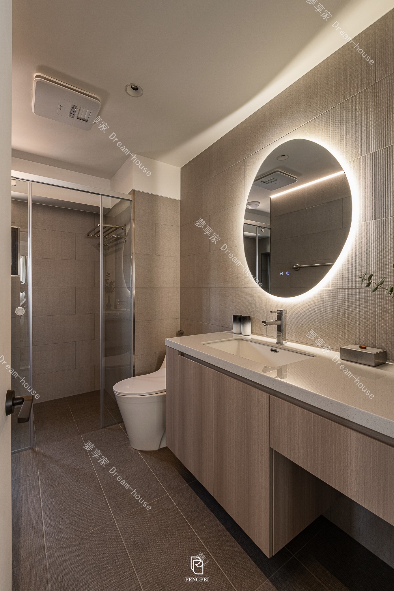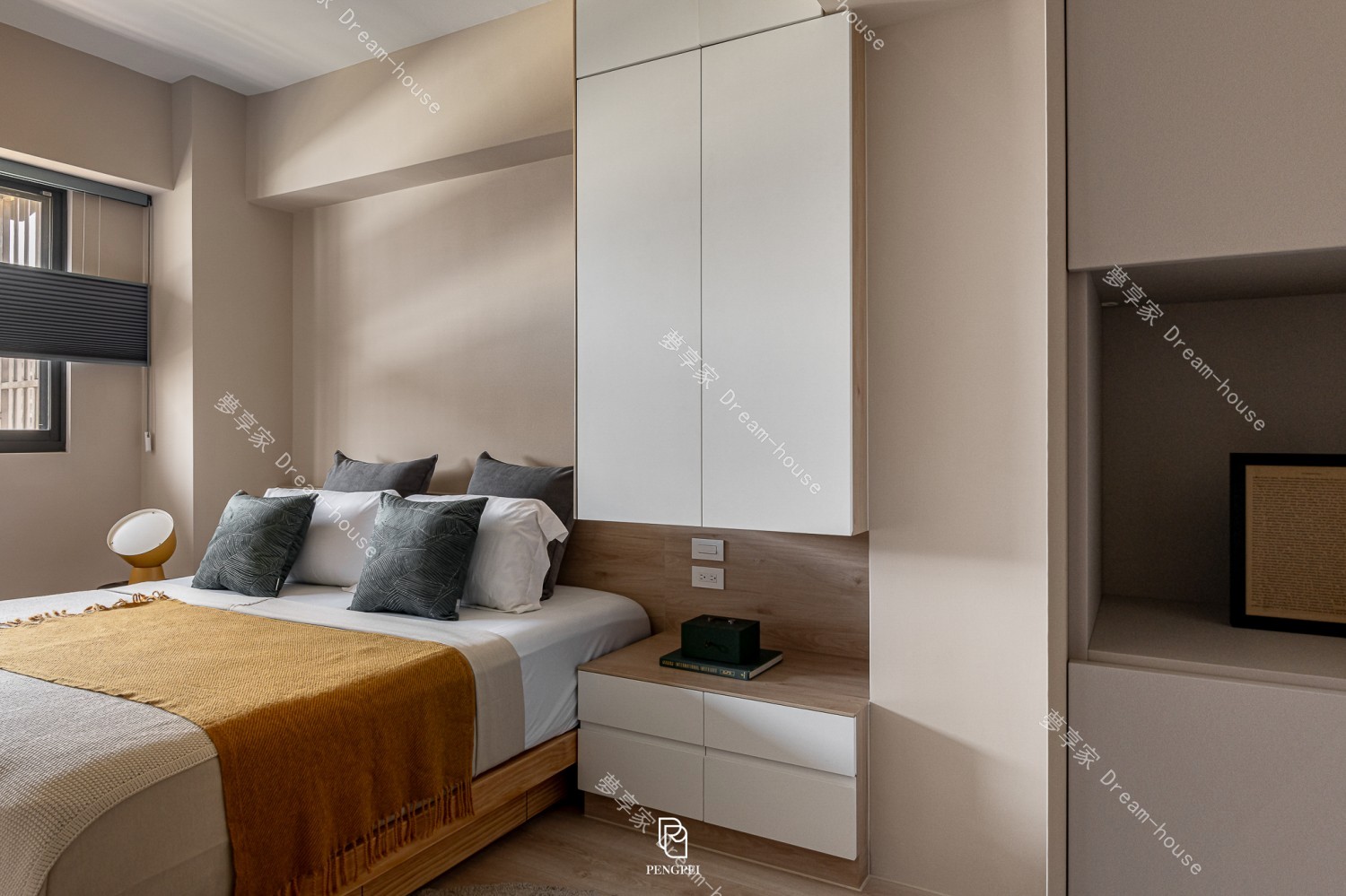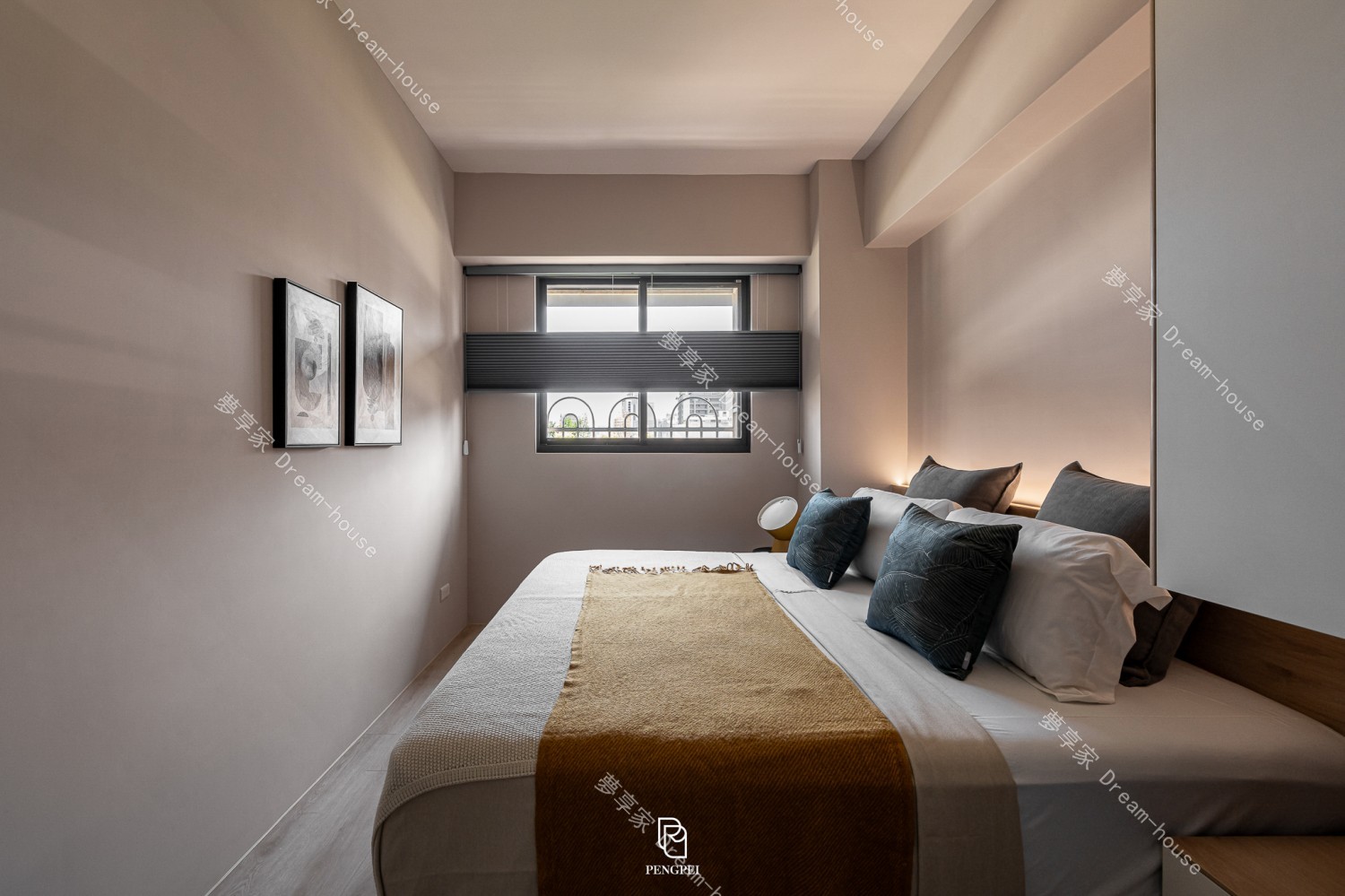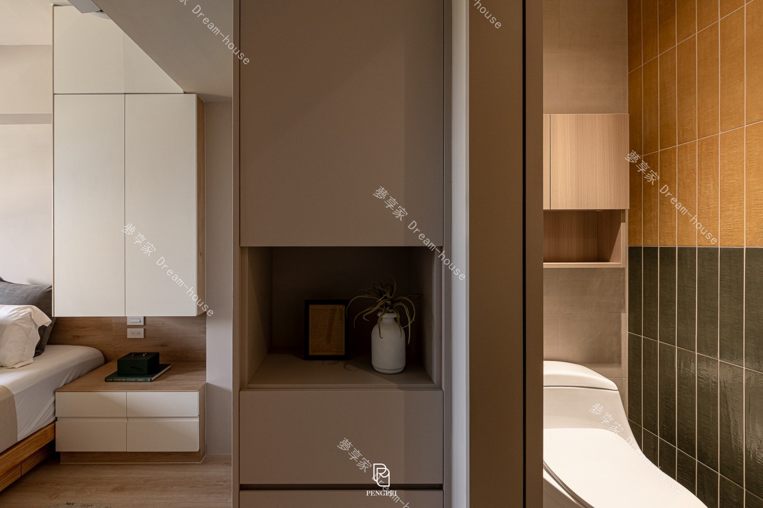 - 此戶型擁有都市住宅少有的三面採光,我們將原三房的格局重新配置成兩房,讓工作區擁有充分的視野與自然光。廚房由一字型改為面向客廳的 L 型配置,並整合隱藏儲藏間,使公共區域的動線與使用性同步提升。