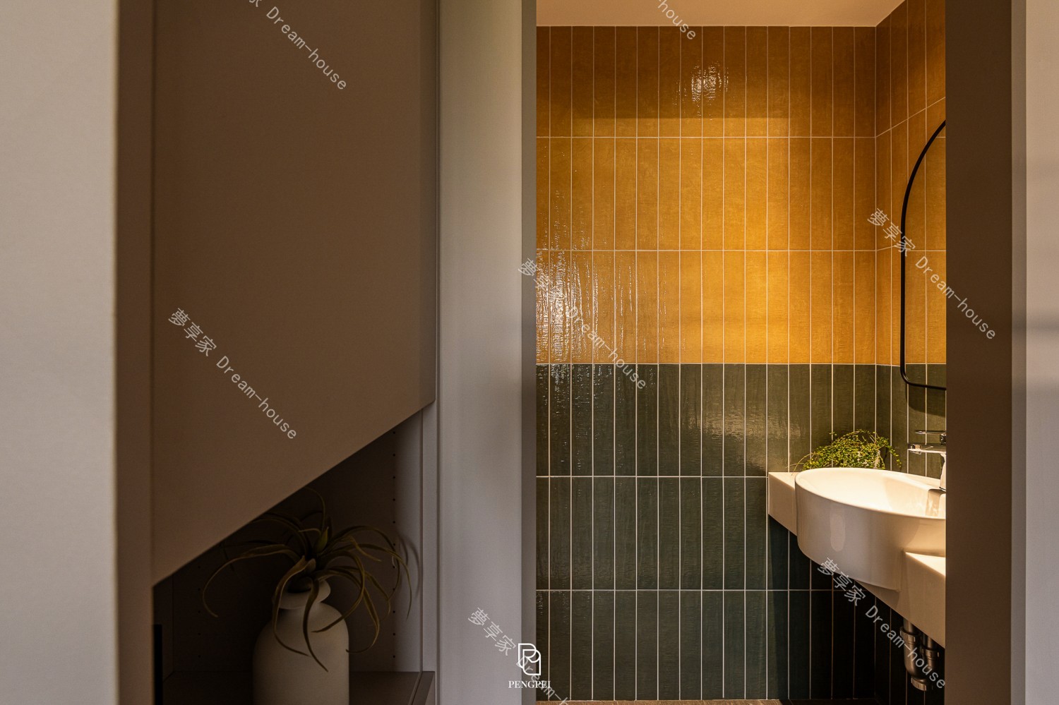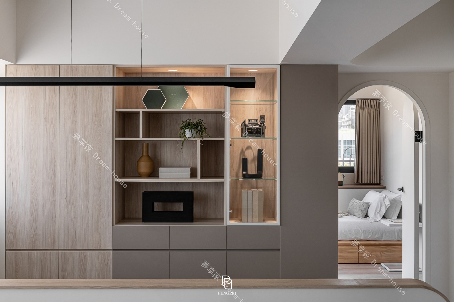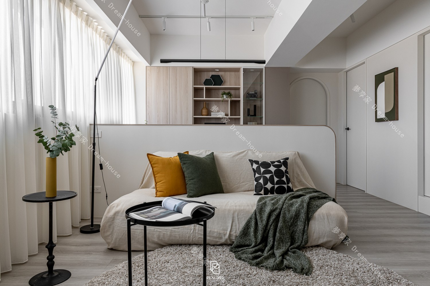 公共區域保留原層高,搭配吸頂燈、吊燈、軌道燈等多種燈具形式,建立豐富的照明層次。貫穿全室的大樑透過留白與淡化量體感,並在廊道前後以弧型修飾,以及將走道端景採拱門造型作為呼應,同時營造視覺焦點。