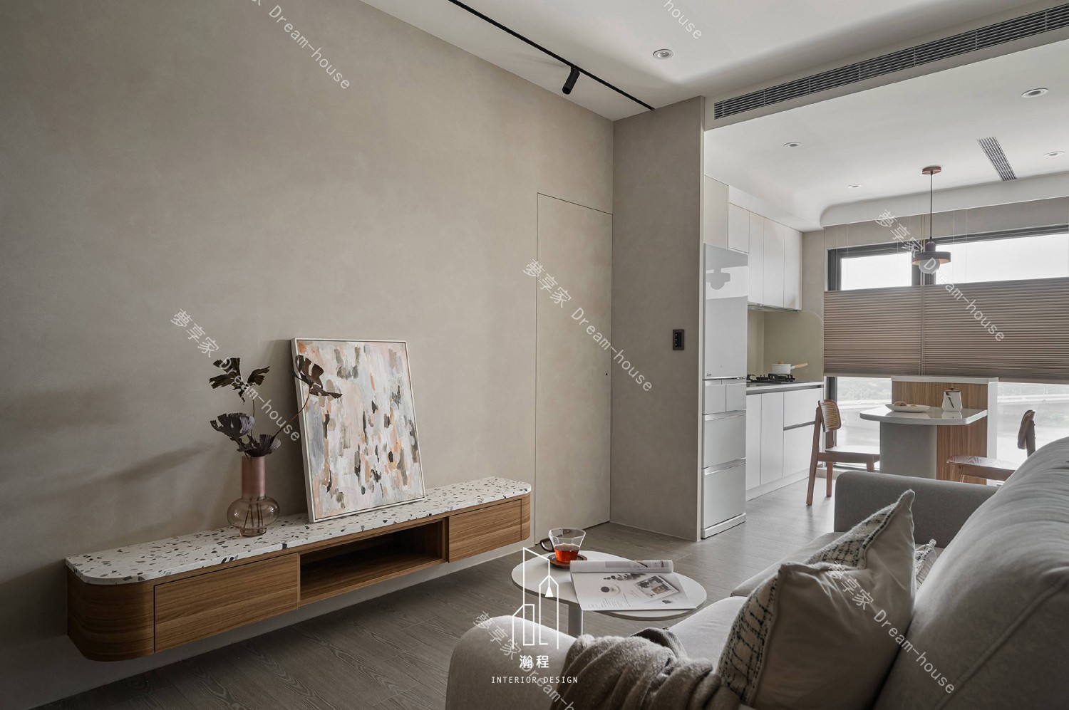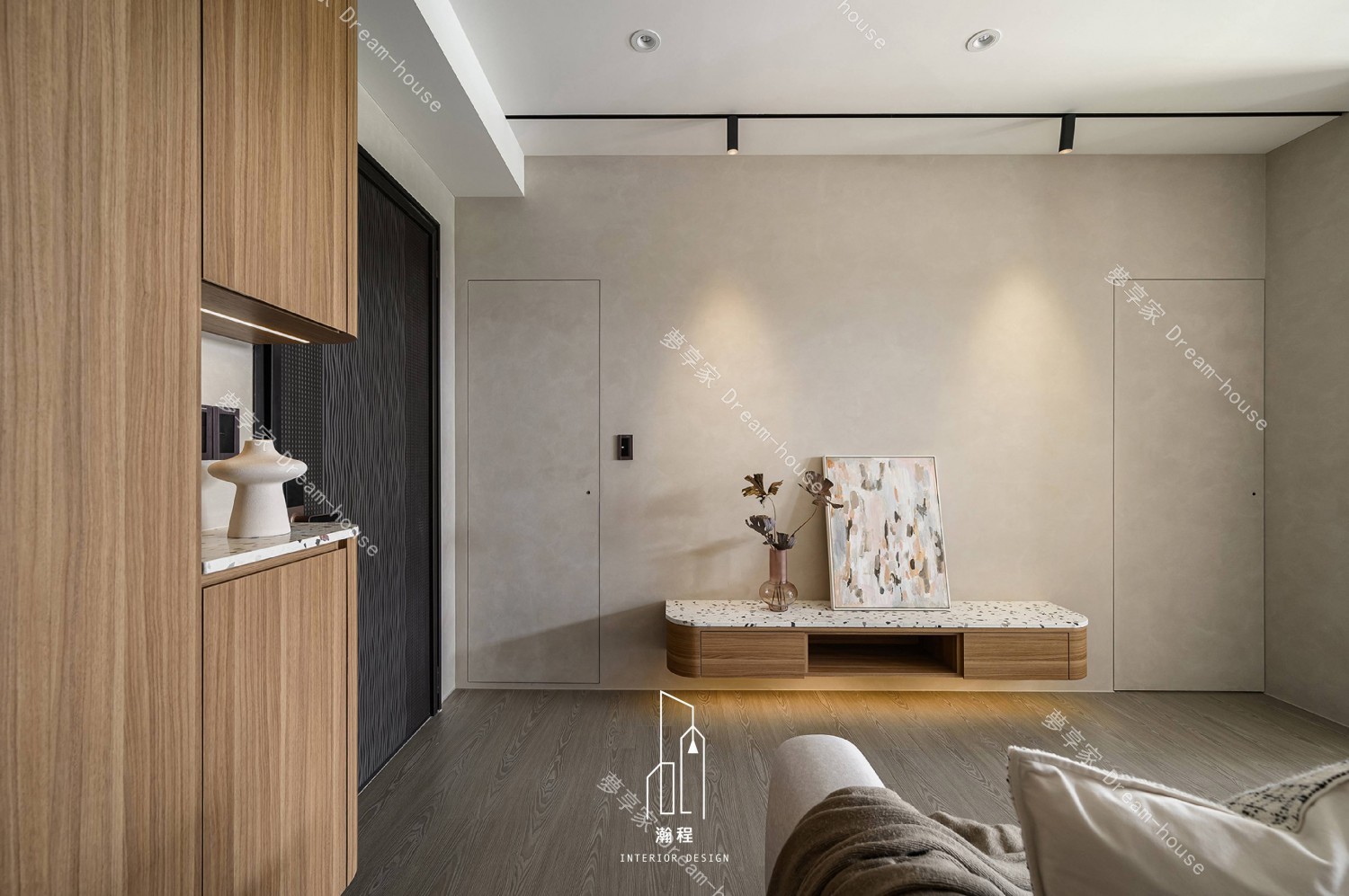 客廳以暖灰手抹質感牆面作為視覺核心,搭配懸浮式櫃體與弧形木質面,讓空間在簡約中帶有柔和的線條感。畫作與陶器的擺飾延續侘寂語彙,使日常物件成為空間的靜謐裝飾。