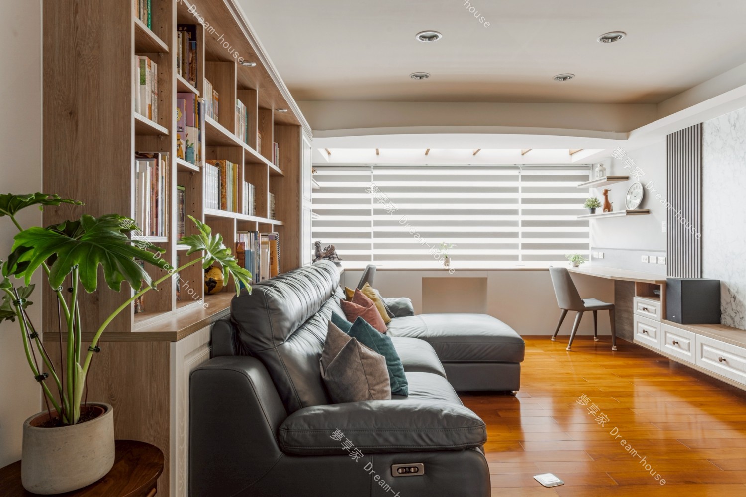 - 此空間以「溫潤光感 × 機能整合」為核心理念,透過大量自然光引入、柔和的用色與俐落線條,營造出兼具居家舒適性與現代質感的生活環境。以減法美學為基礎,透過乾淨的水平線條、輕量化層架以及具科技感的捲簾設計,塑造平靜、明亮、柔和且不壓迫的居住氛圍。