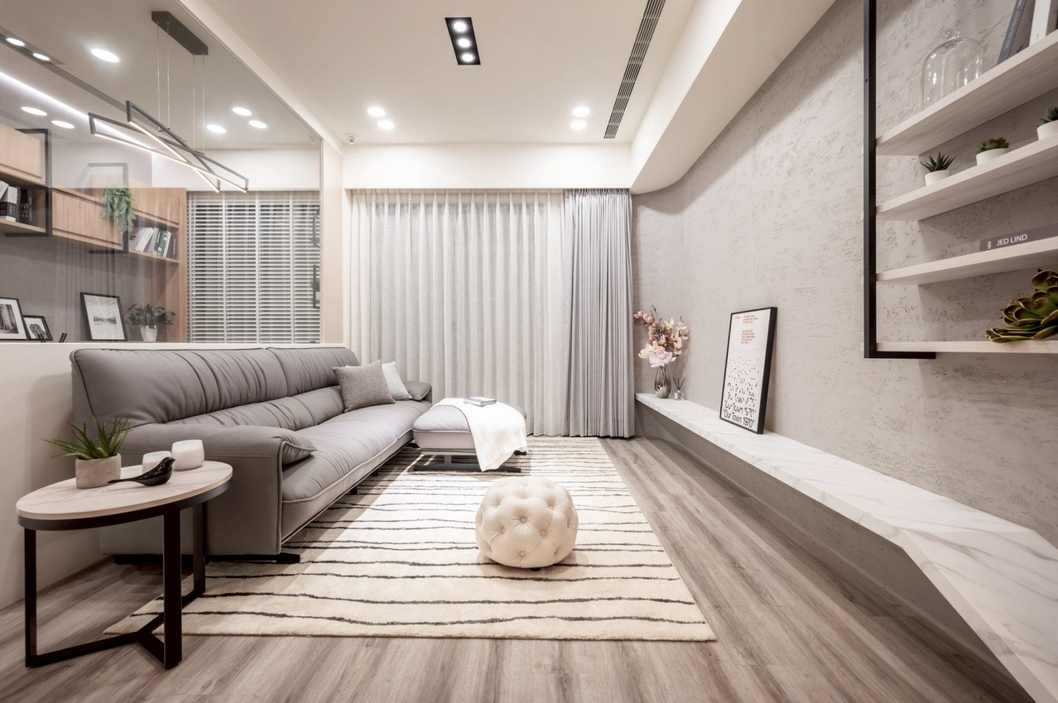 暖色木地板:提升空間溫度,與灰階家具形成柔和對比。