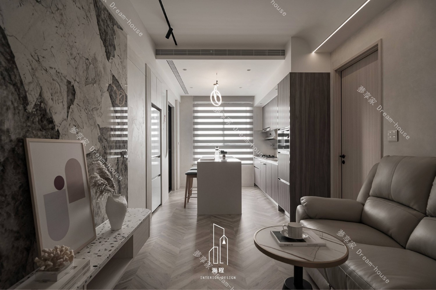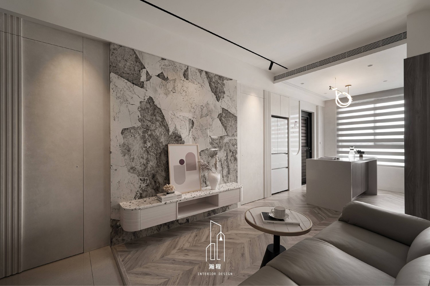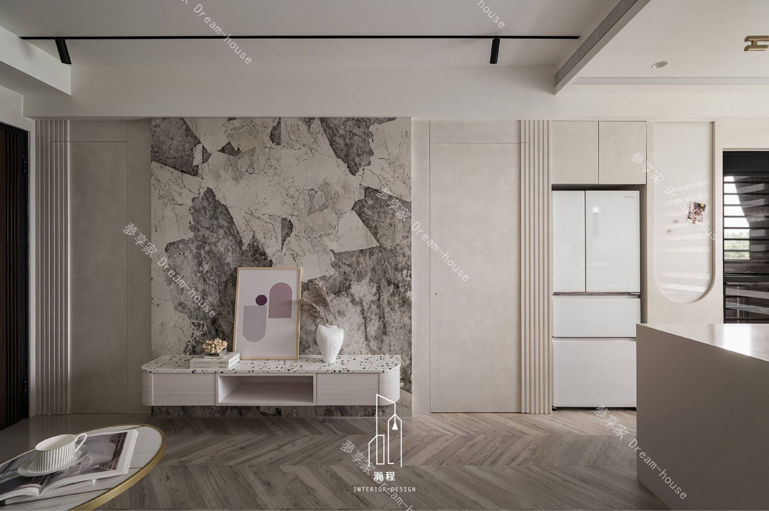 設計風格採用現代簡約與自然元素結合的手法,整體色調以溫暖的米色、灰色和白色為主,配以大理石牆面及木質地板,營造出輕盈又舒適的氛圍。設計師注重細節,從家具的選擇到牆面裝飾,都在視覺與功能性之間取得良好的平衡。每個空間的區域都有精心布局,讓居住者可以感受到開放與私密的和諧交織。