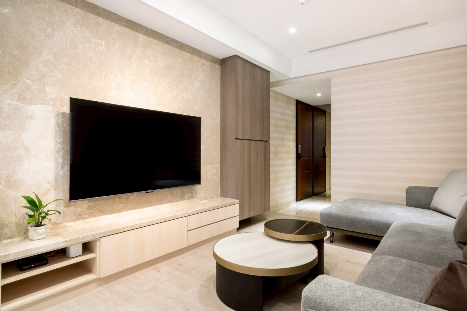 以淺橡木搭配溫潤觸感的布料、地毯,提升空間溫度,避免全灰色系造成冷感。