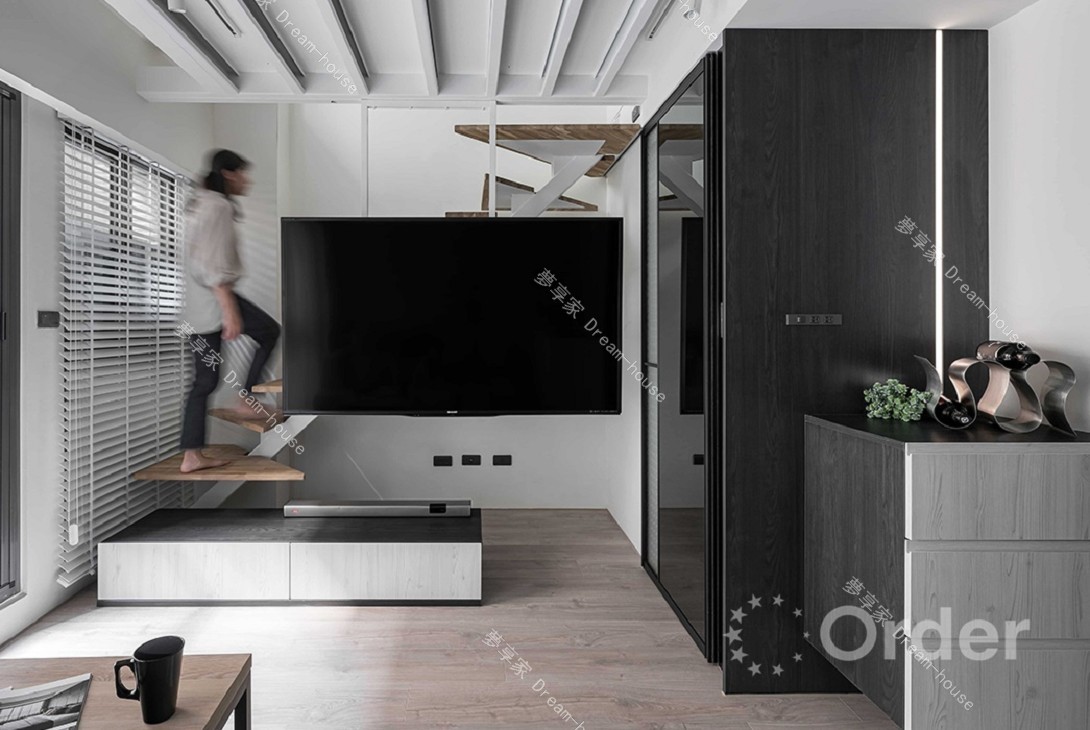 將原封閉式木作梯全部拆除,以穿透性極高的龍骨梯,結合弱電配置,懸浮烤漆鐵件,巧妙為梯間扶手,同時壁掛 70 吋電視,使視線毫無遮掩,灰階色與溫潤實木踏階有了絕佳互動,暖木色亦為主牆一景,再引入活動式櫃體,使地域感更形輕盈。