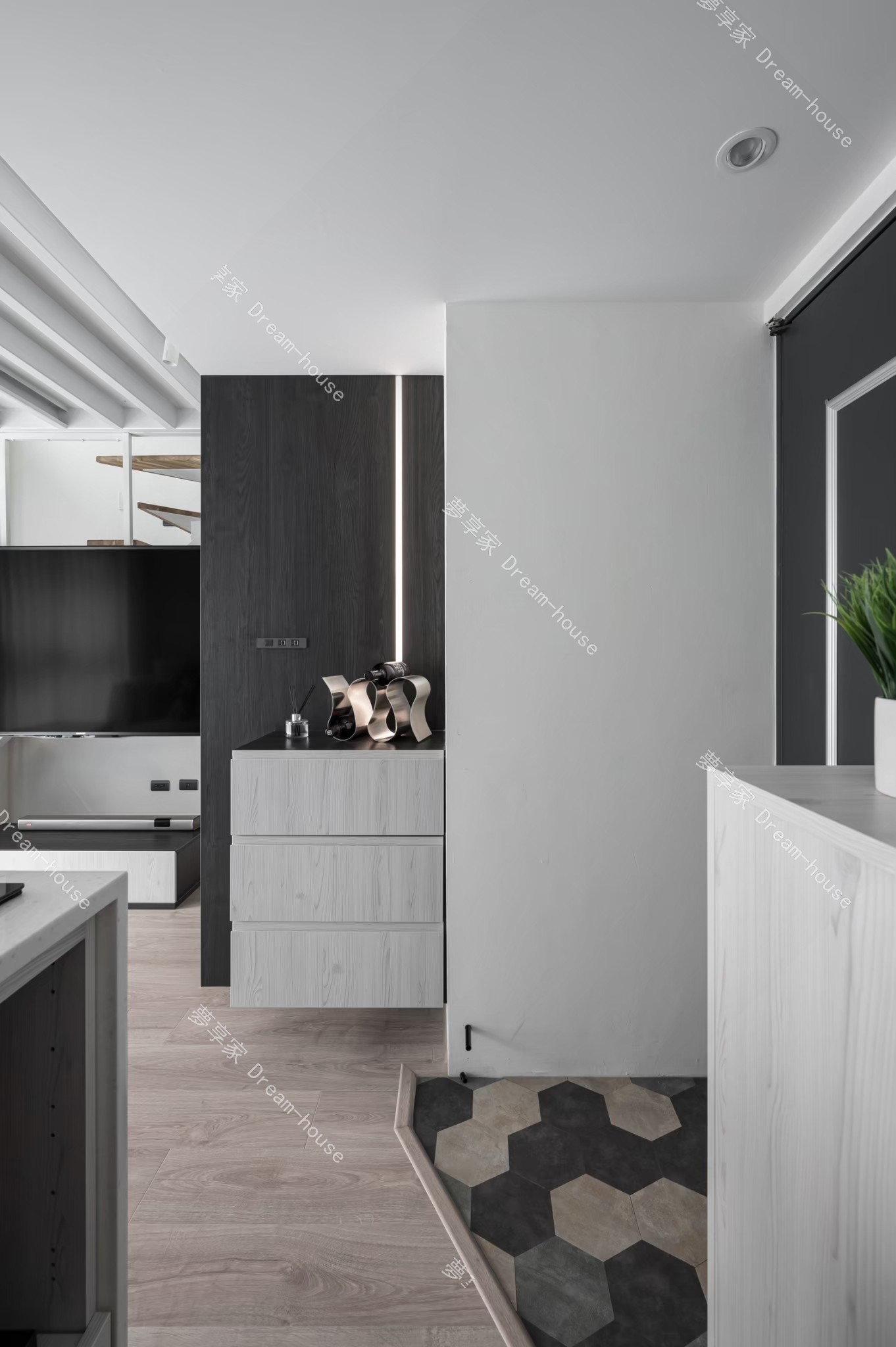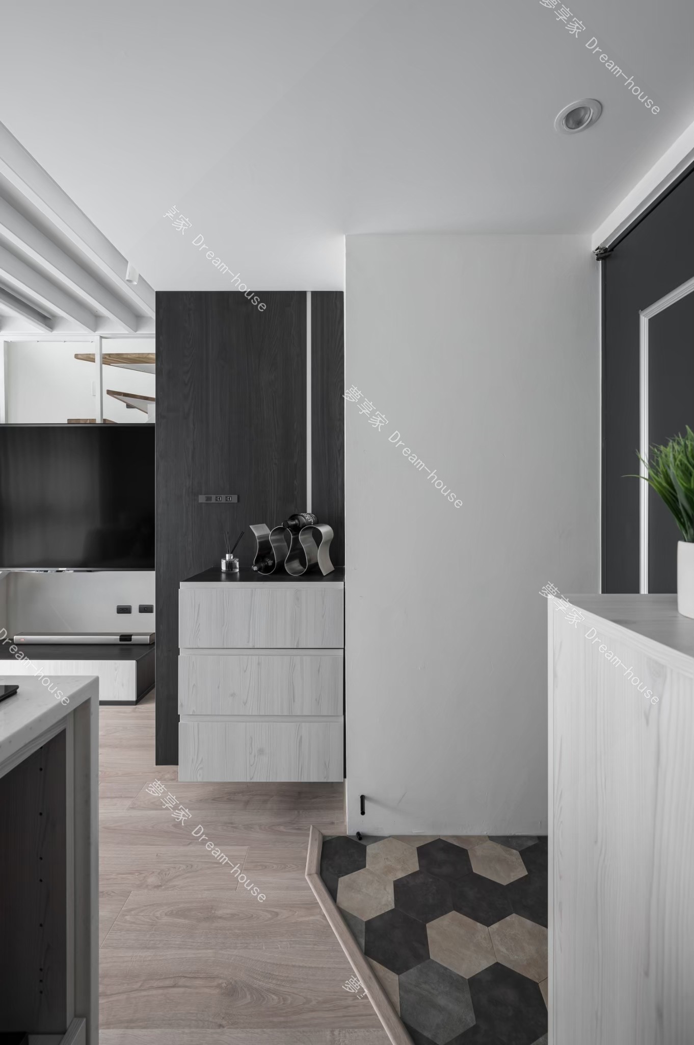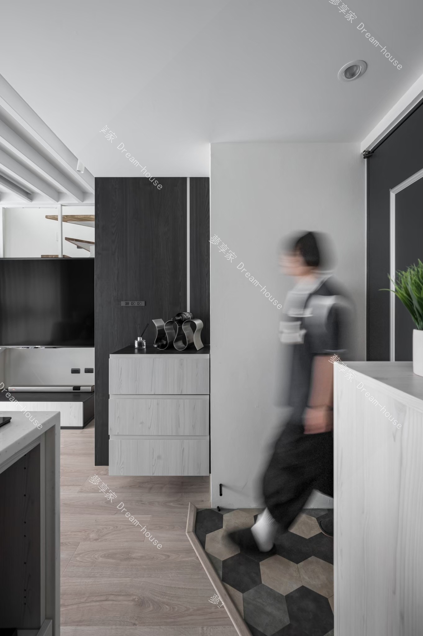 揭門入室時,玄關正巧落於餐廚一側,為了勾勒落塵區,保有內外之距並劃分動線,以灰色系、仿舊感六角磚鋪敘,側邊架一式懸浮系統櫃加以圍塑。特別選擇活潑六角形帶出繽紛感,以灰色串連全室風格,使得空間感顯得勻潤、富有層次性。