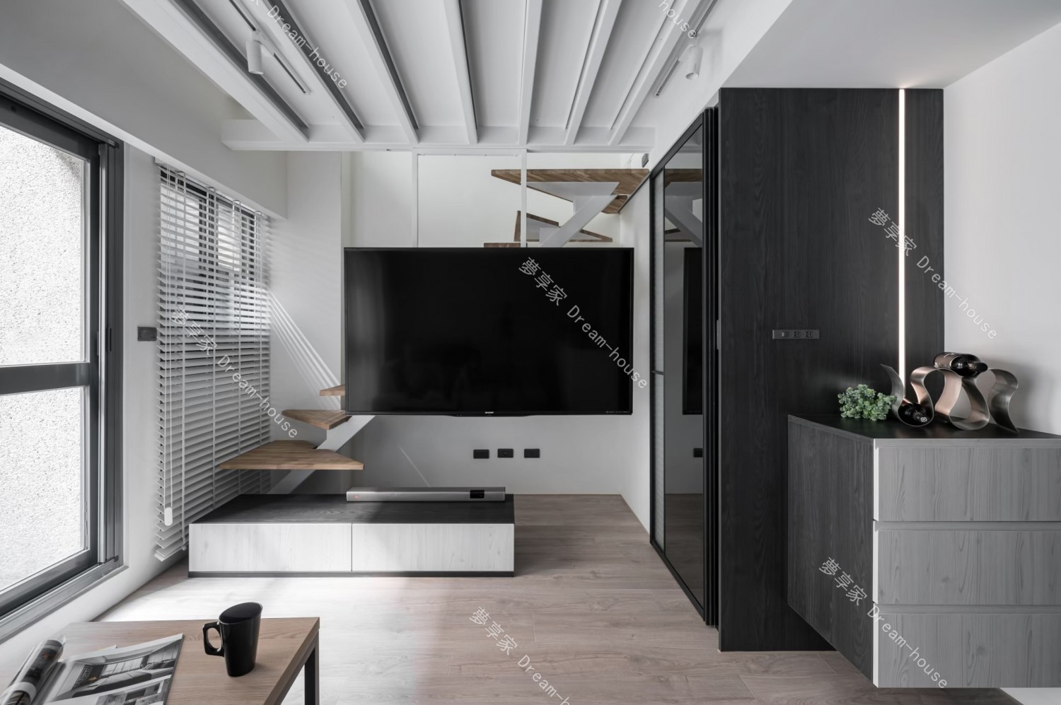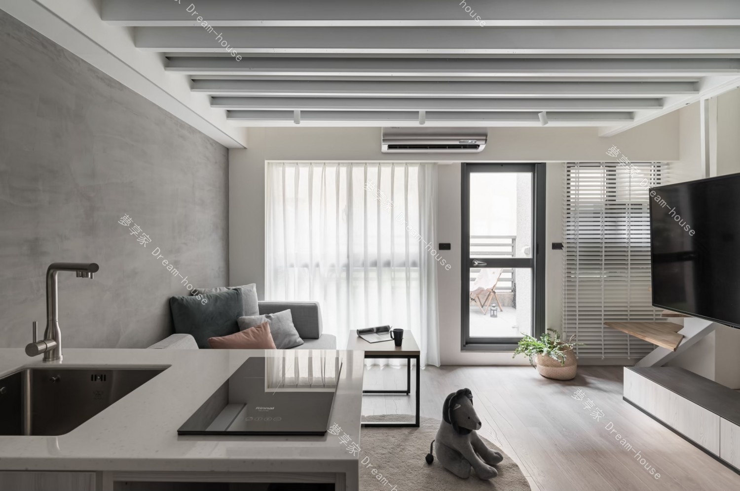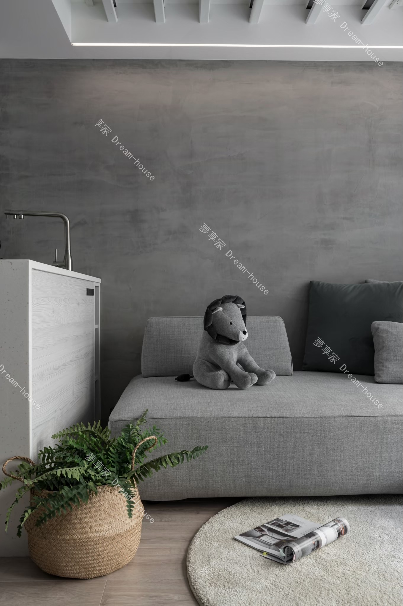 灰色司曼特漆作為沙發背牆,亦成為客廳主景,電視牆面則以虛化方式表現,更進一步將原天花拆除,保留原始樓層 C 型鋼,加強與穩固結構性,以最大效率拉高天花,援引軌道燈,裸現輕巧質感。