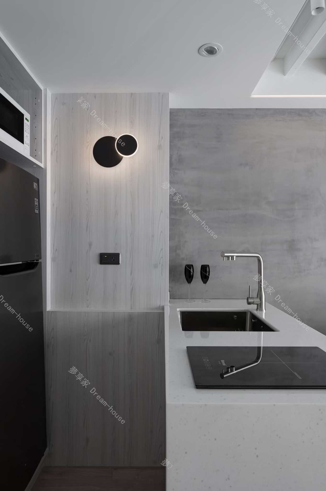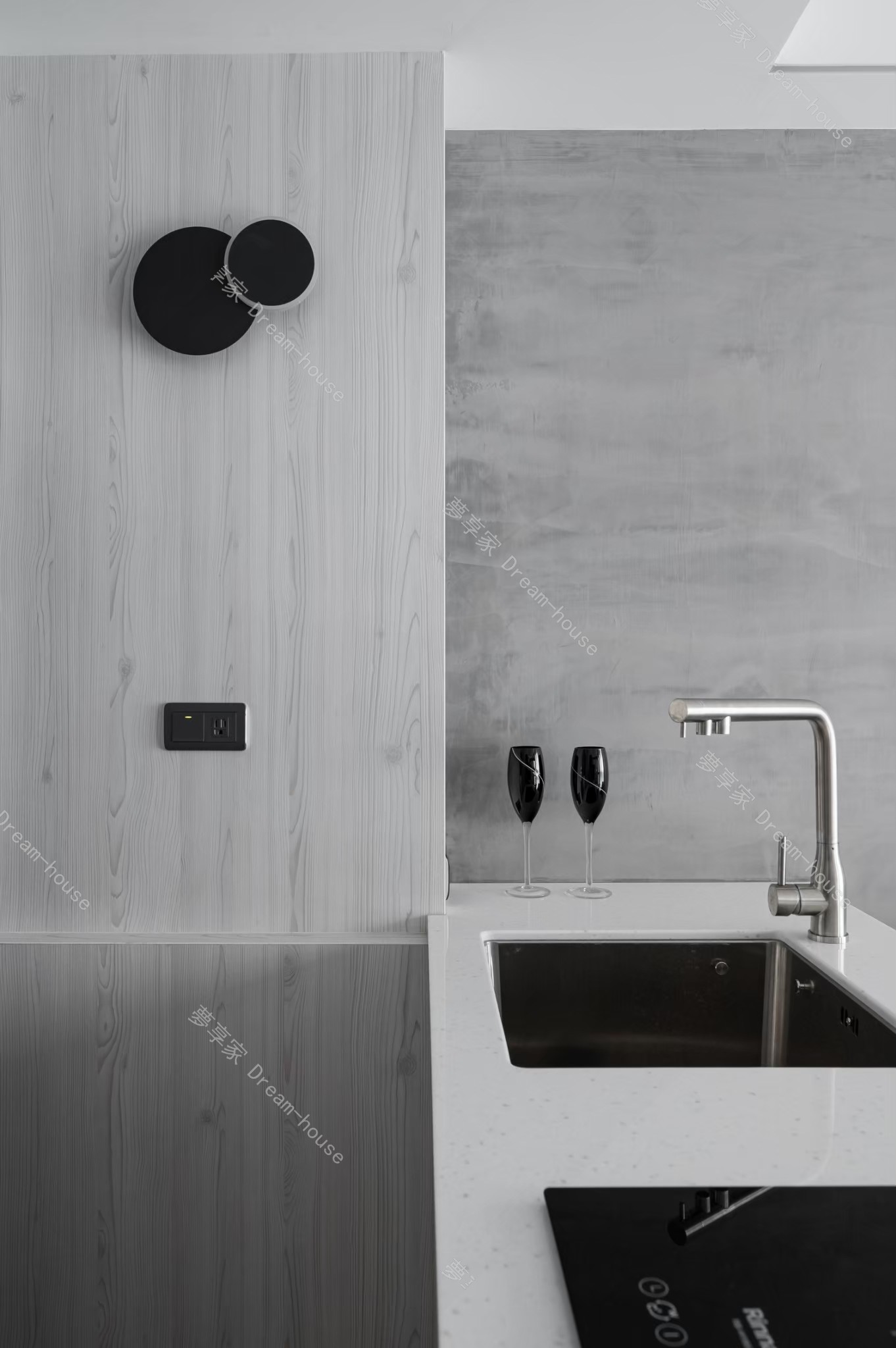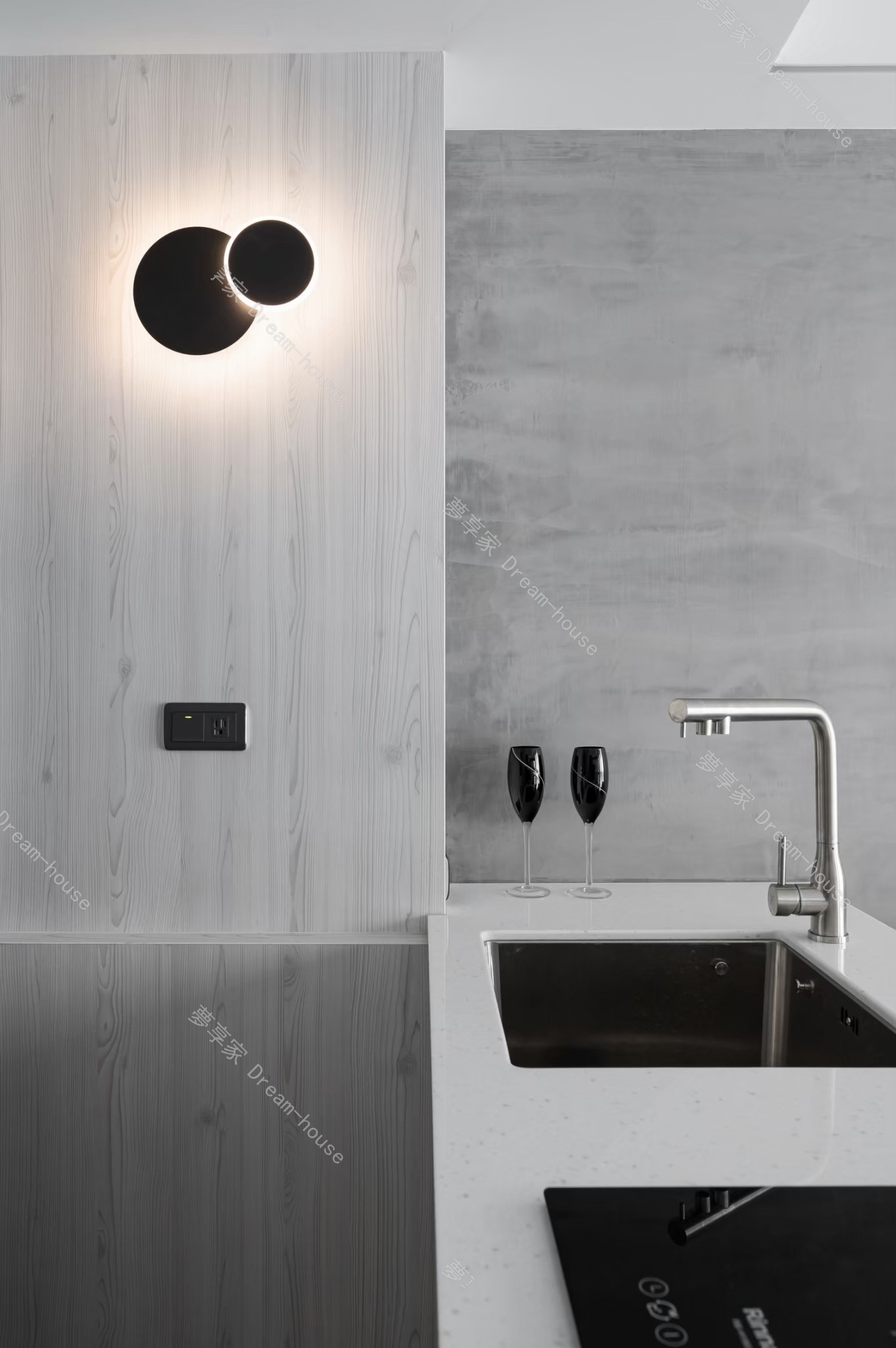 由於廚房側接引入口,更須依憑高效整合機能,使得雙一字型烹飪區,能夠完善整納冰箱、電器、 IH 爐、中島檯,內側電器櫃亦結合抽拉盤,以達最高效收納之便。中島檯以面寬 130 公分、高 95 公分灰色板材與白面人造石形塑,即使量體較大,卻成為進入客廳絕佳分野,涵納了高機能,與壁掛燈飾側牆,有了完美烘托姿態。