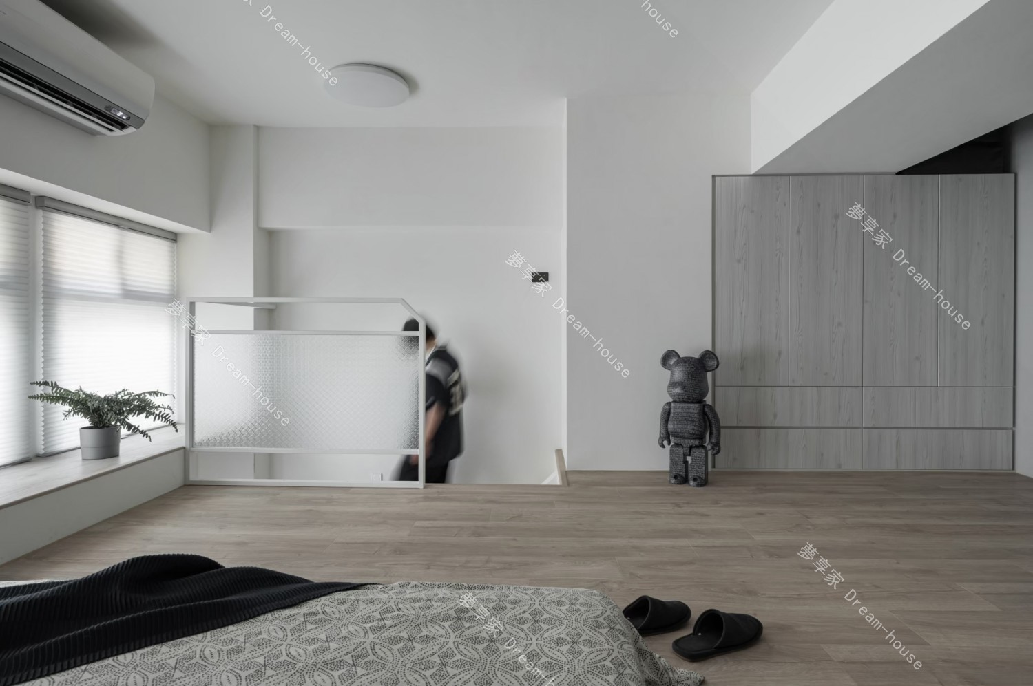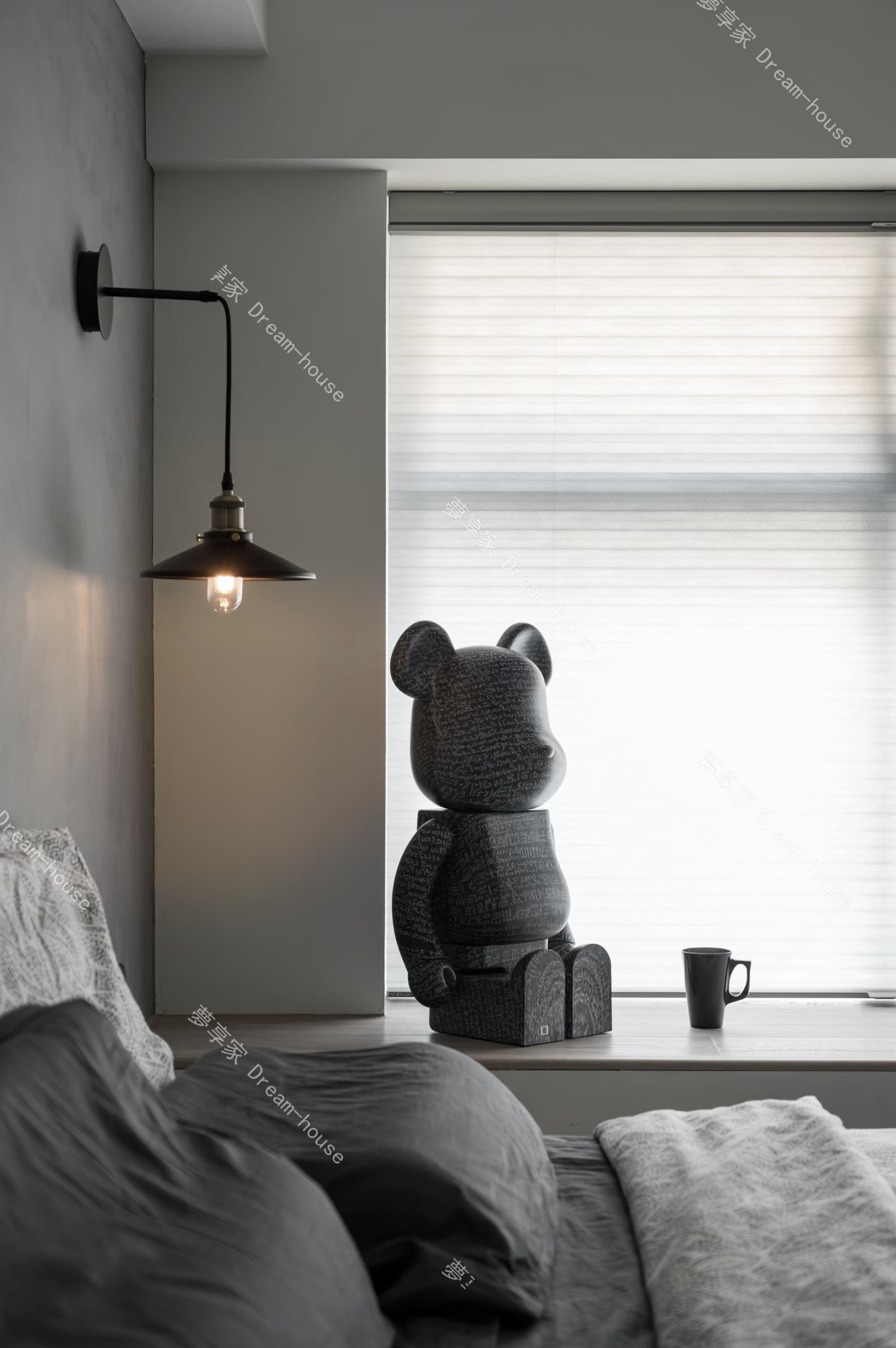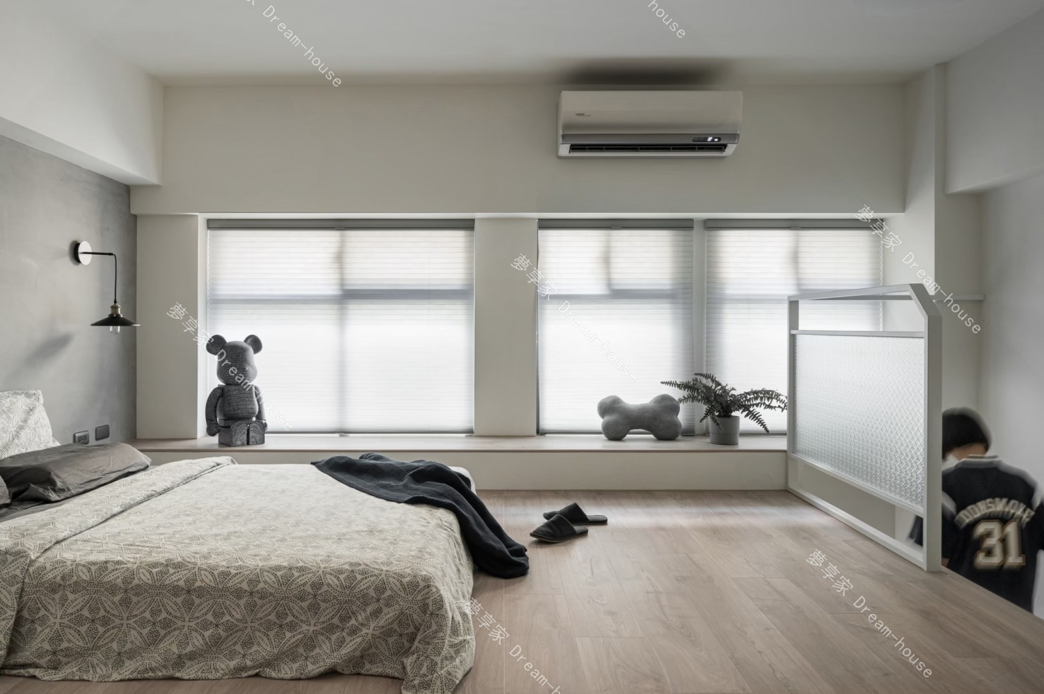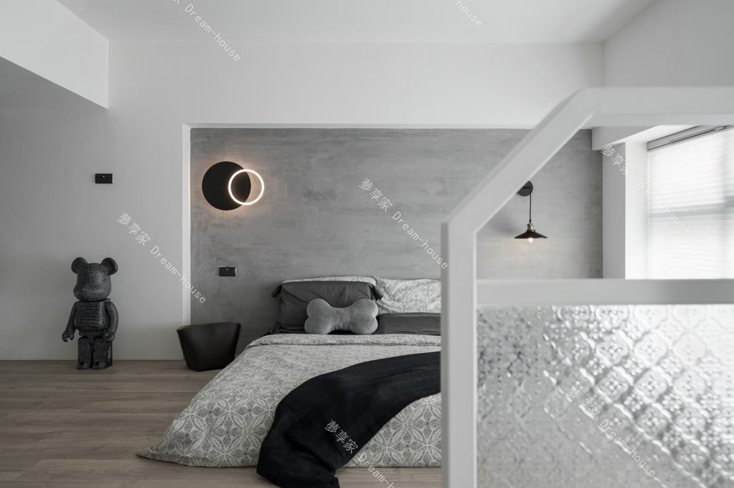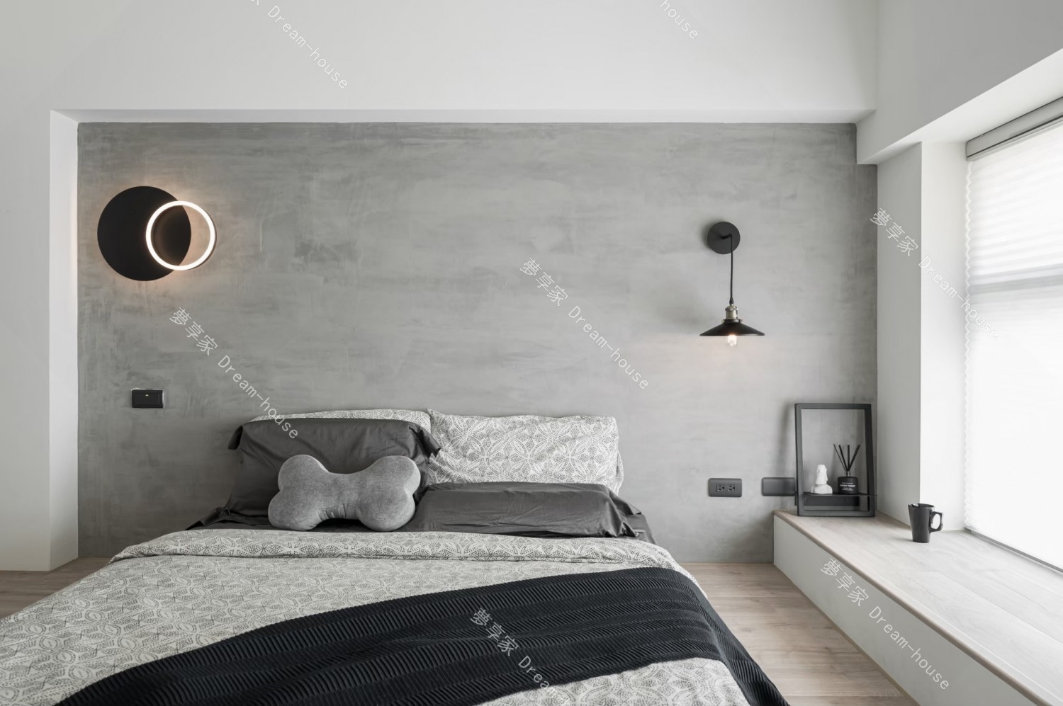 延續手感灰底漆,刻意保留梁柱 L 形,使灰底壁與白跳出獨有框景,圍塑臥眠區塊,引注圓形壁燈,以弧轉化線條感,臨窗側架高一式臥榻,恰為下方冷氣迴風口預留空間,亦作為潮玩藏品展示區。