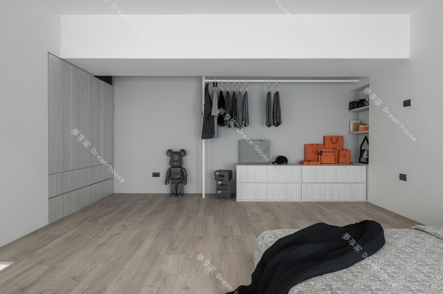 對於低梁大柱未加以修飾,特意保留原樣,以作為臥眠與收納兩區分界,除了闢有一落櫃體,也利用長形面寬,擴大為開放式展示區,使潮玩、時尚配件,能點綴滿室、突顯自我風格。