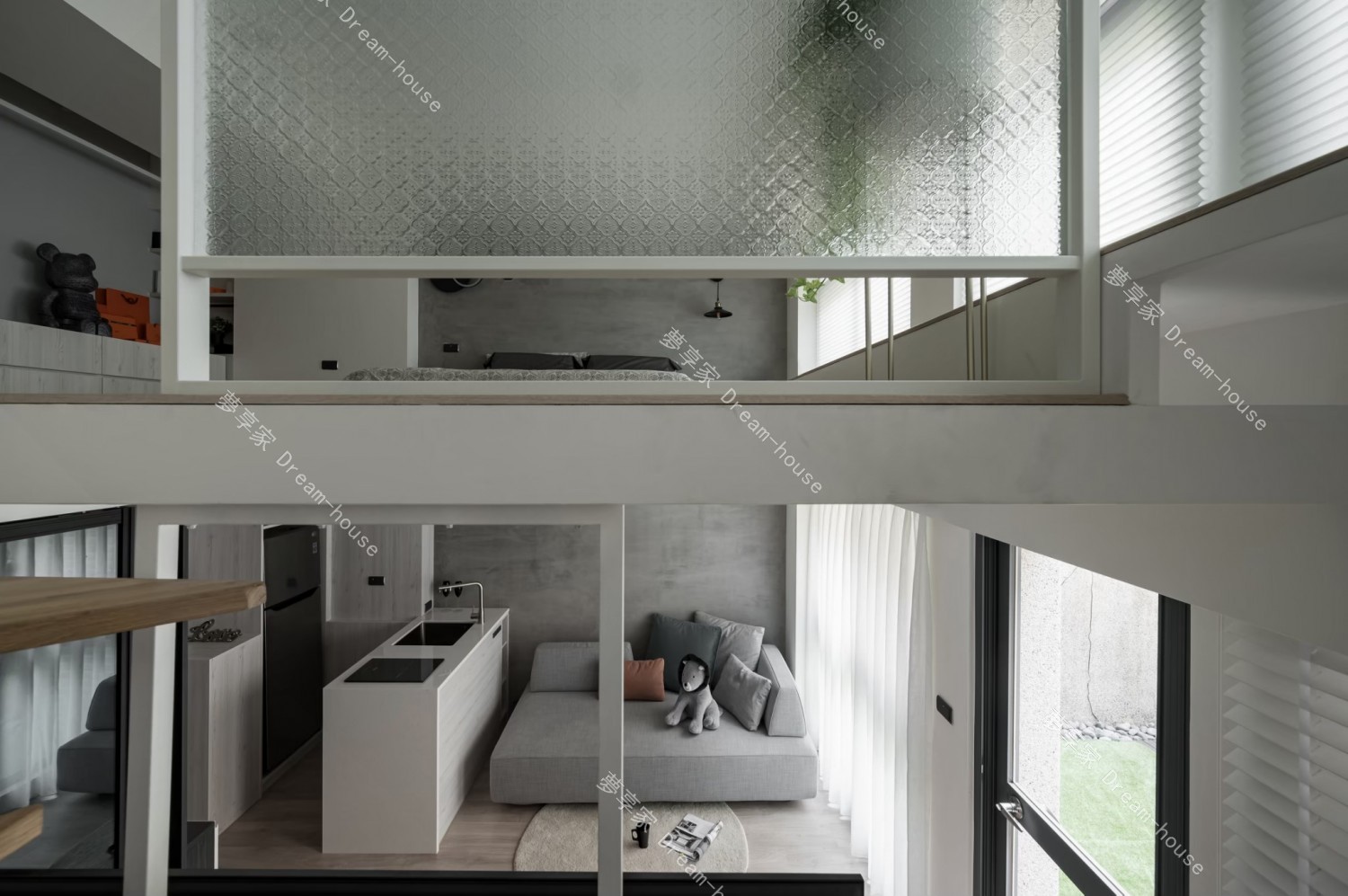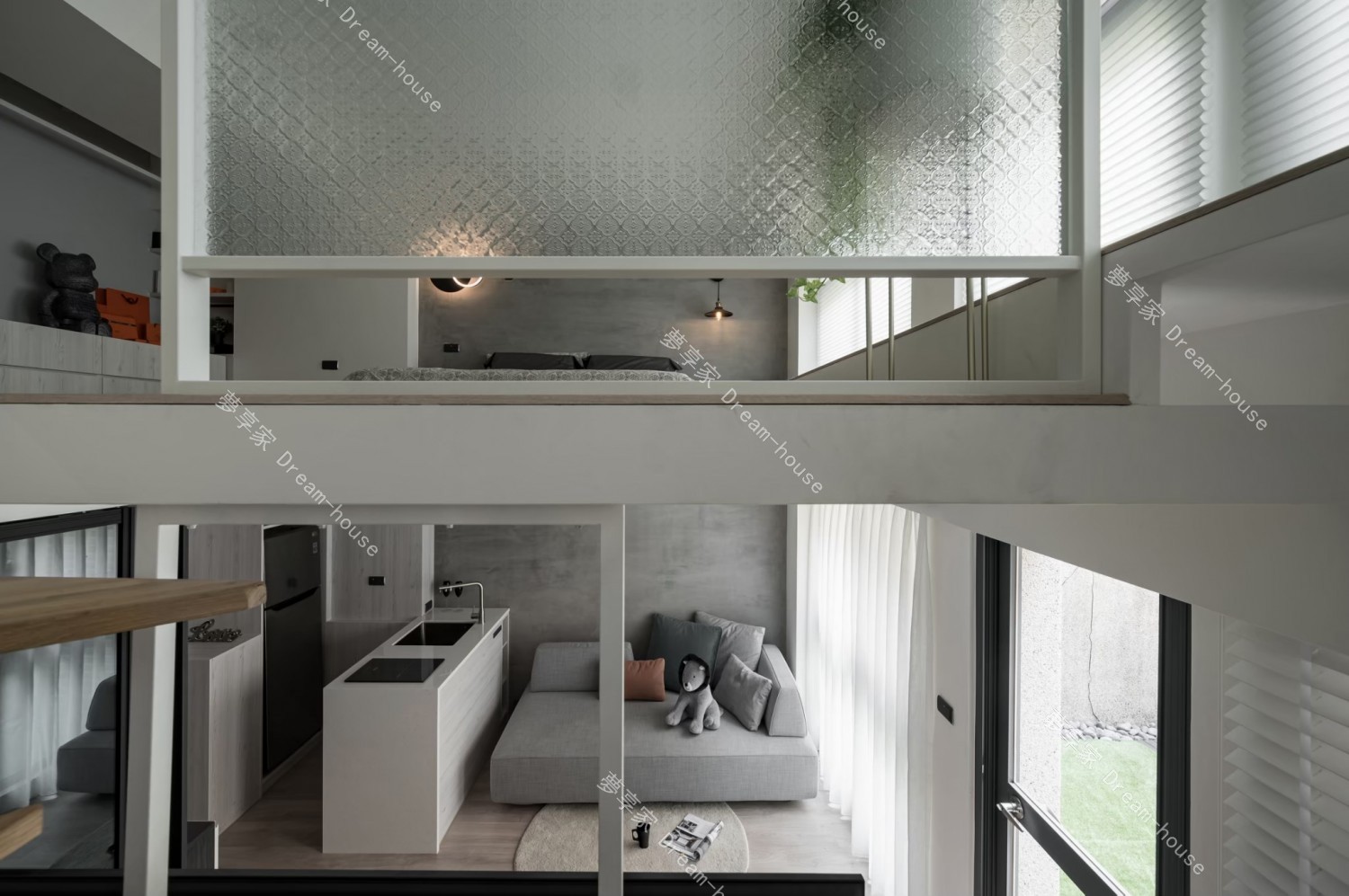 以白色烤漆形塑龍骨梯,活動櫃為第一踏階,順沿而上時,一共 9 階梯面,以略為彎折幅度與上下相連,緩行此處時,視線還能穿梭兩層樓面,更鑲嵌一片海棠花玻璃,使臥眠區悠緩映入。