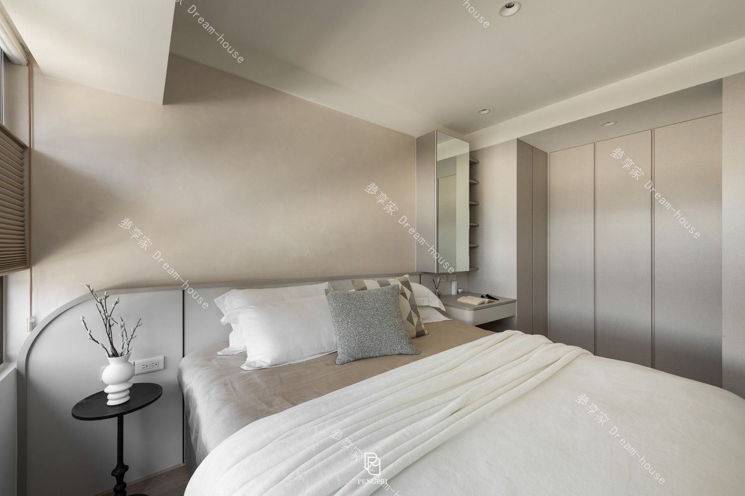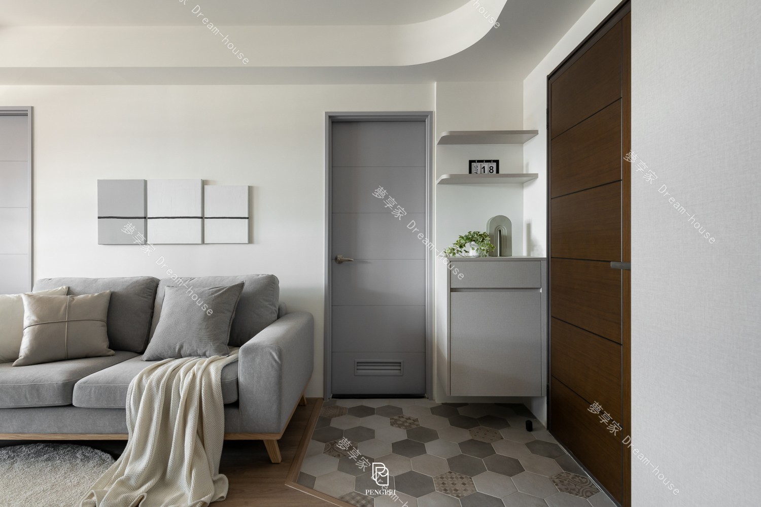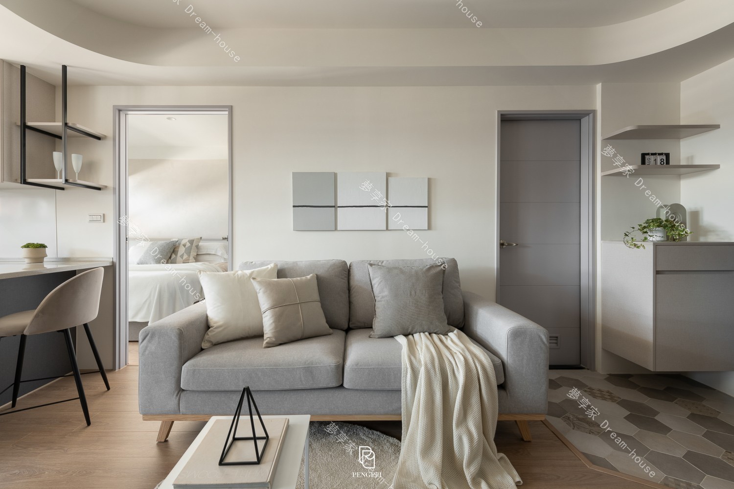 天花板以圓潤線條修飾銳角,房間門組重新烤漆搭配設計風格,並以系統櫃取代木工來替屋主控制預算。