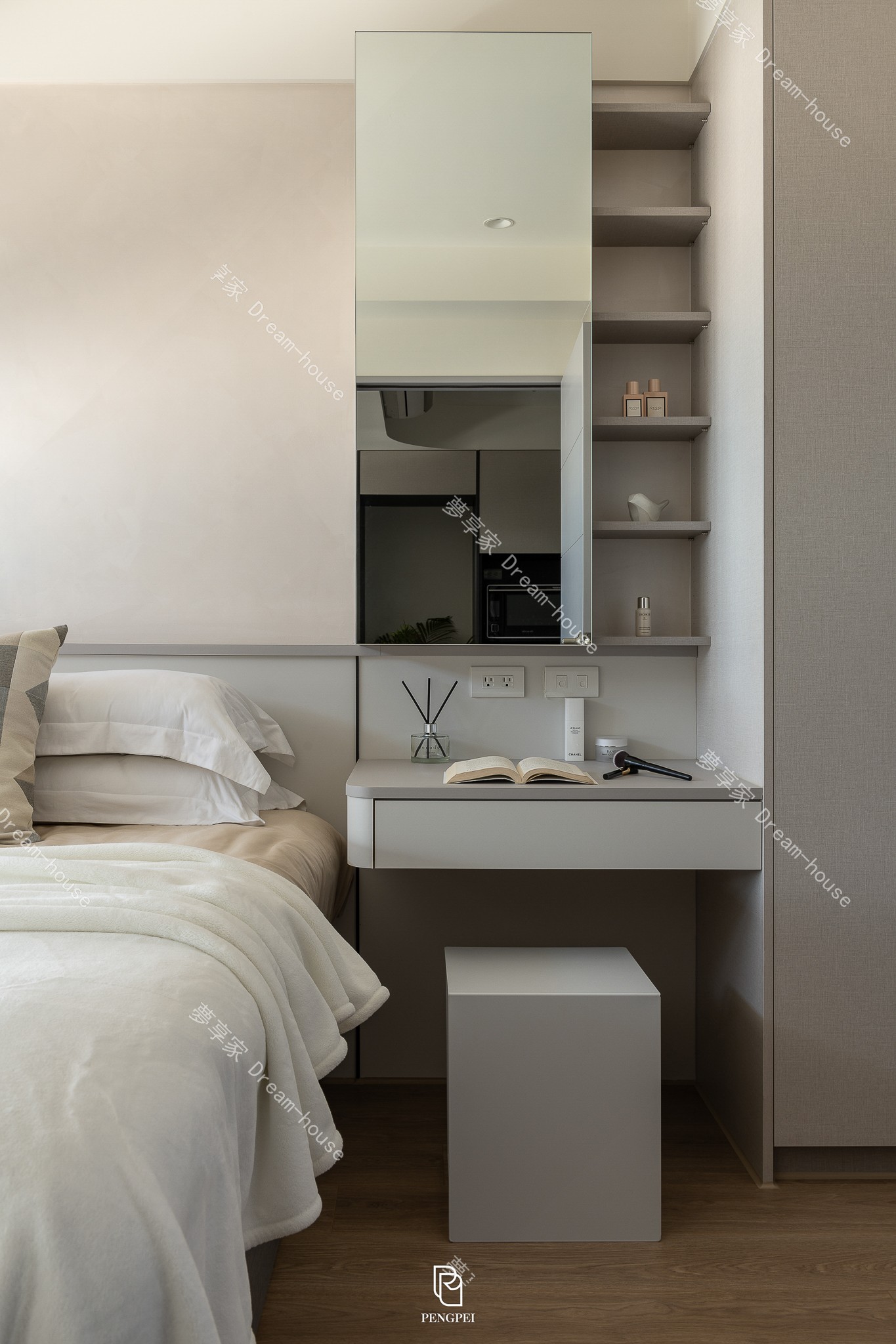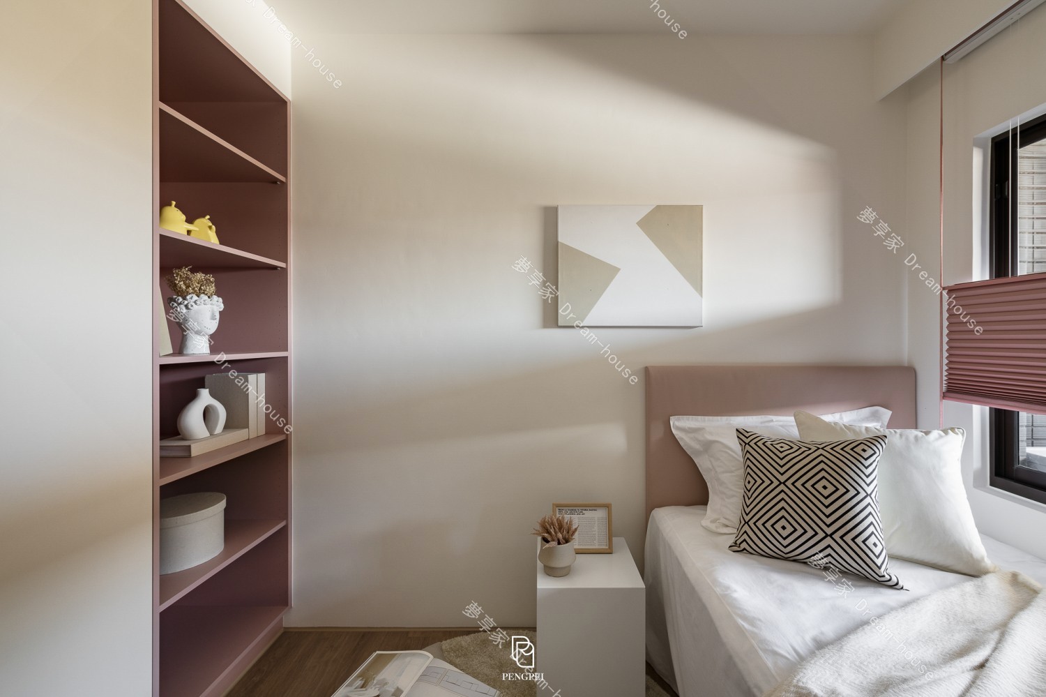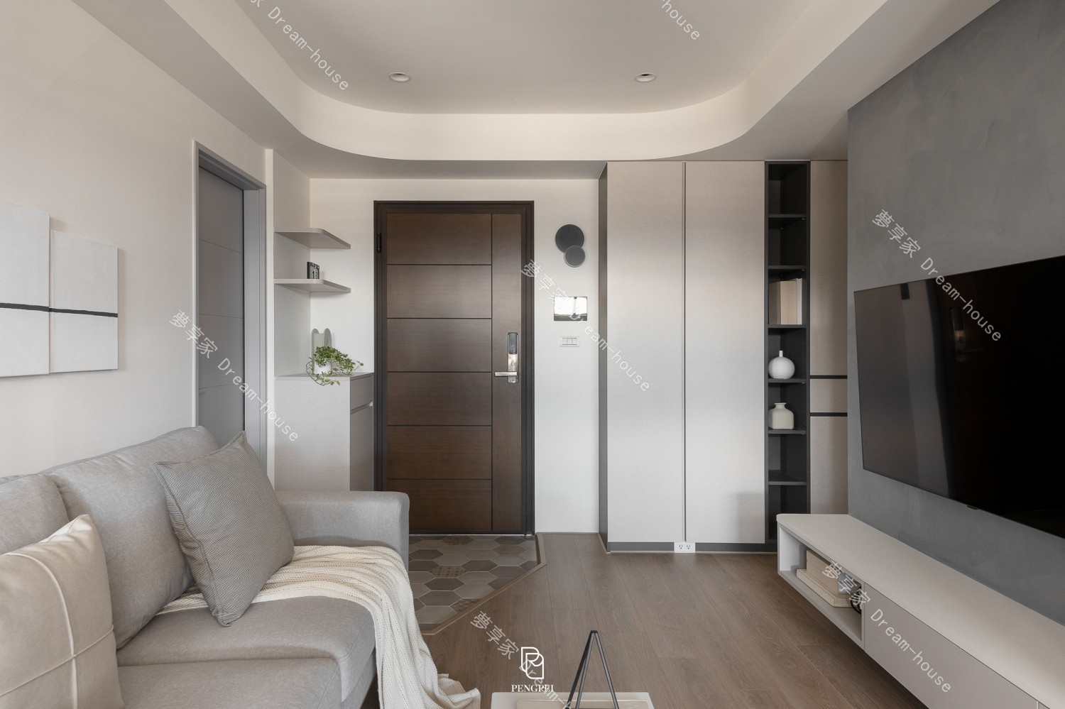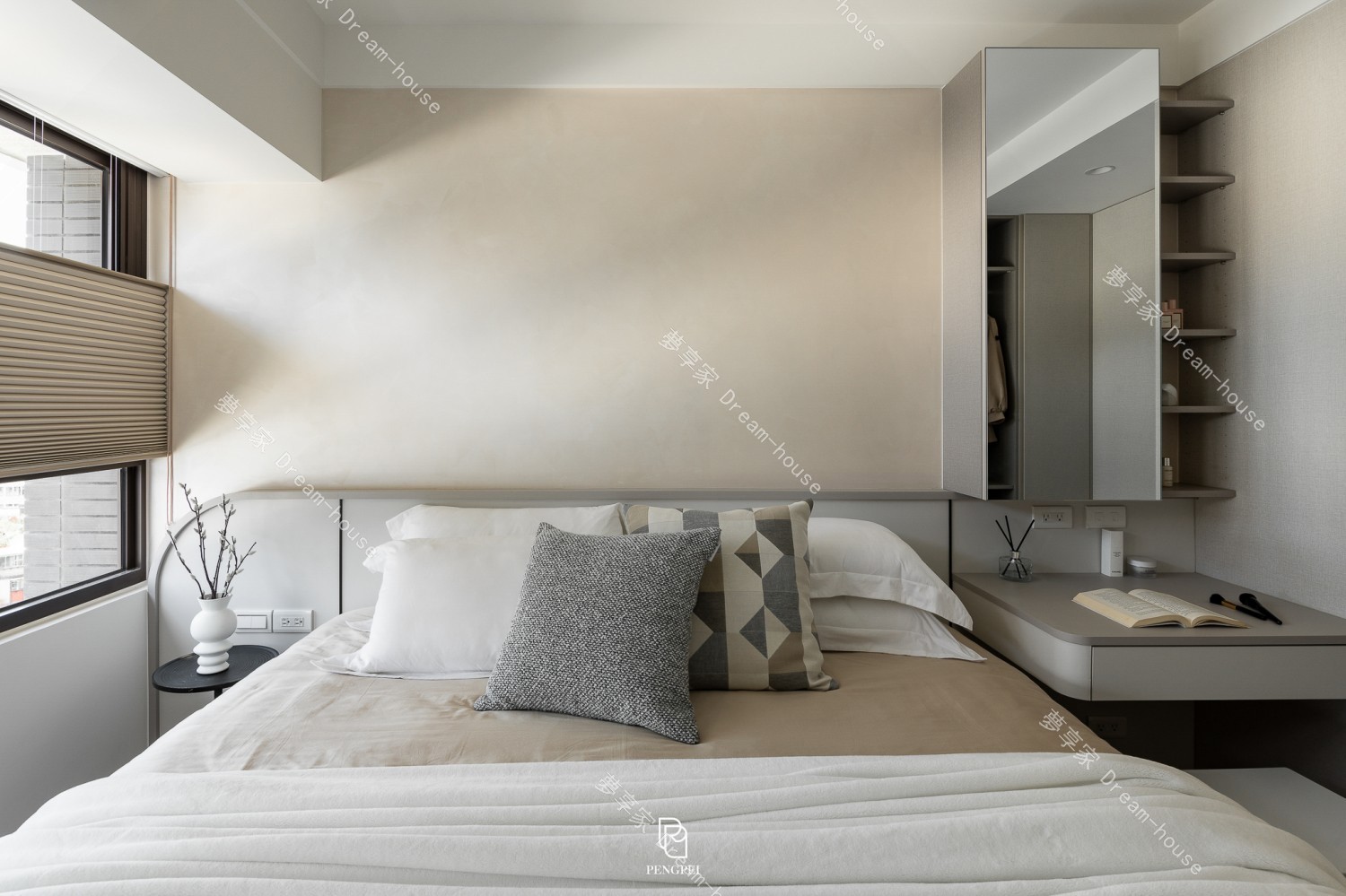 天花板以圓潤線條修飾銳角,房間門組重新烤漆搭配設計風格,並以系統櫃取代木工來替屋主控制預算。