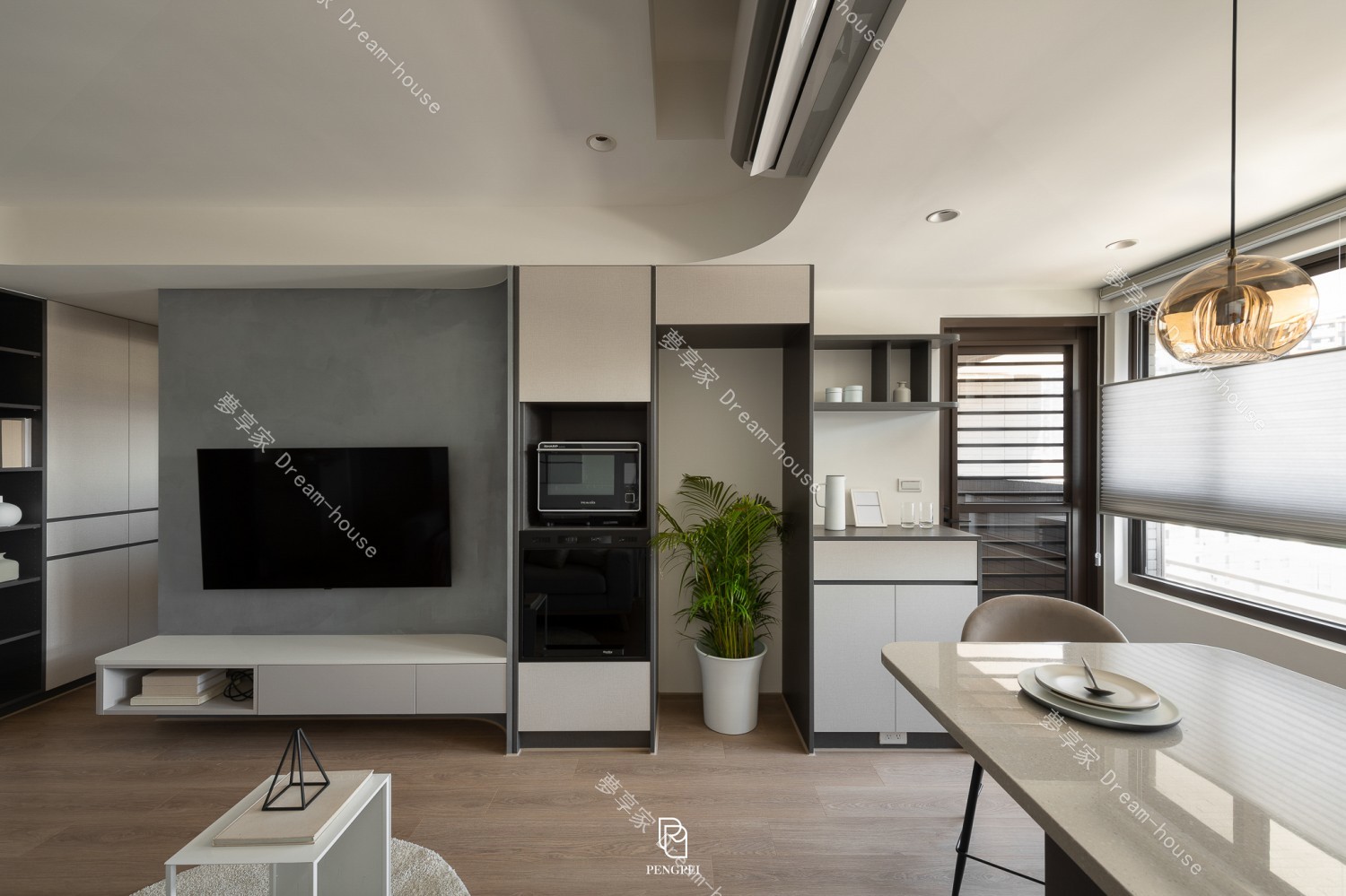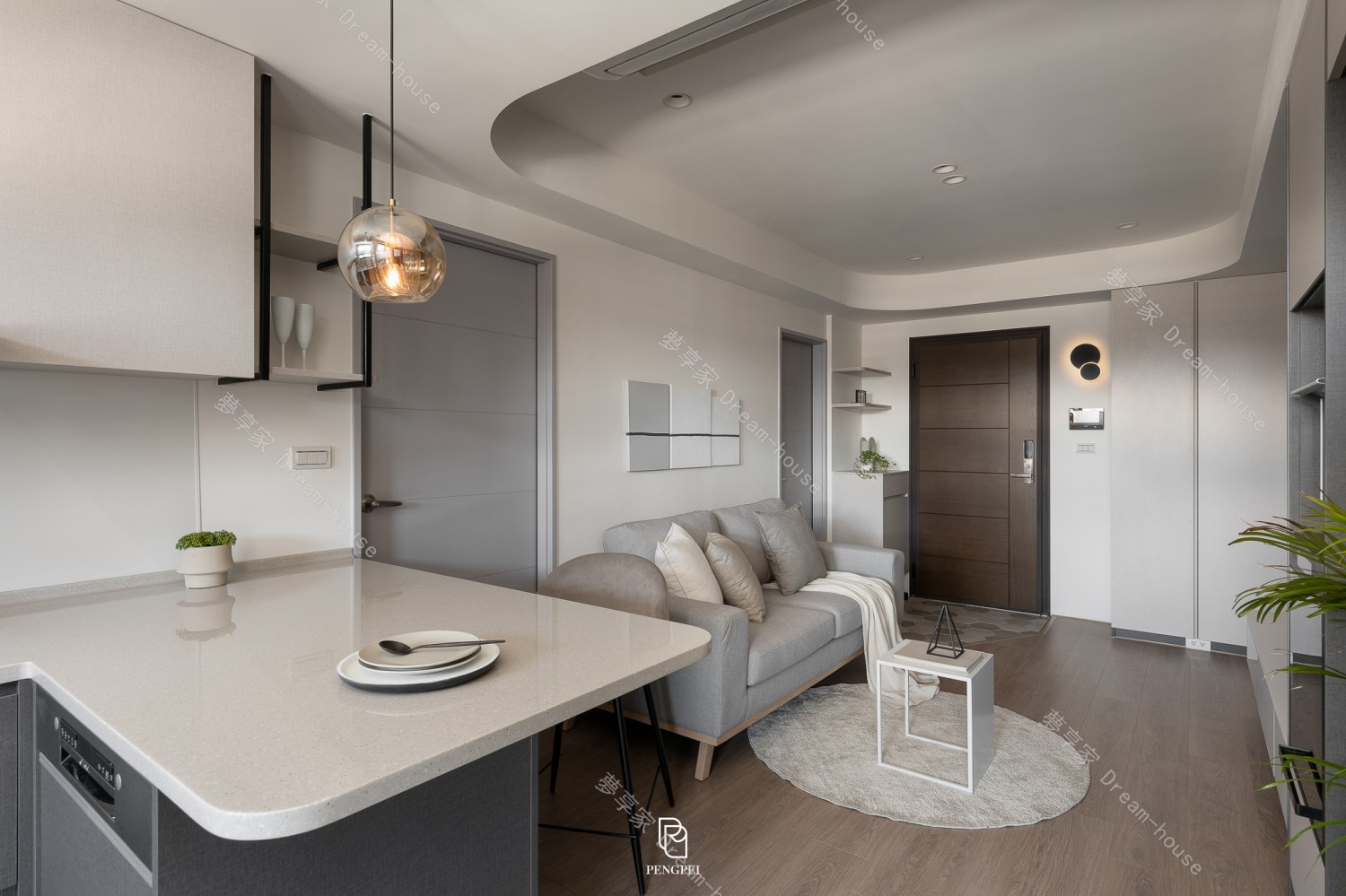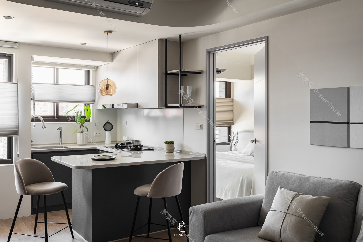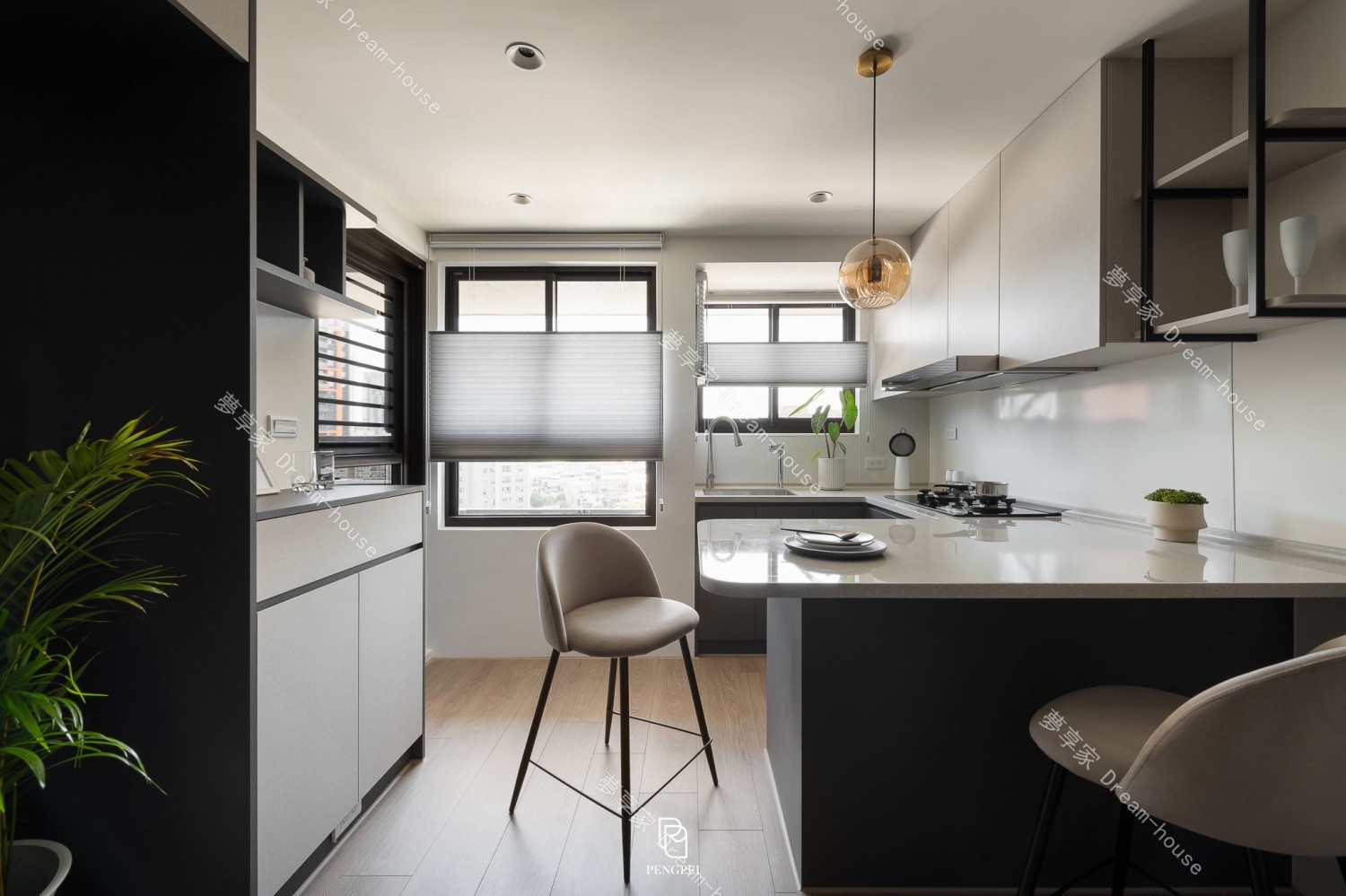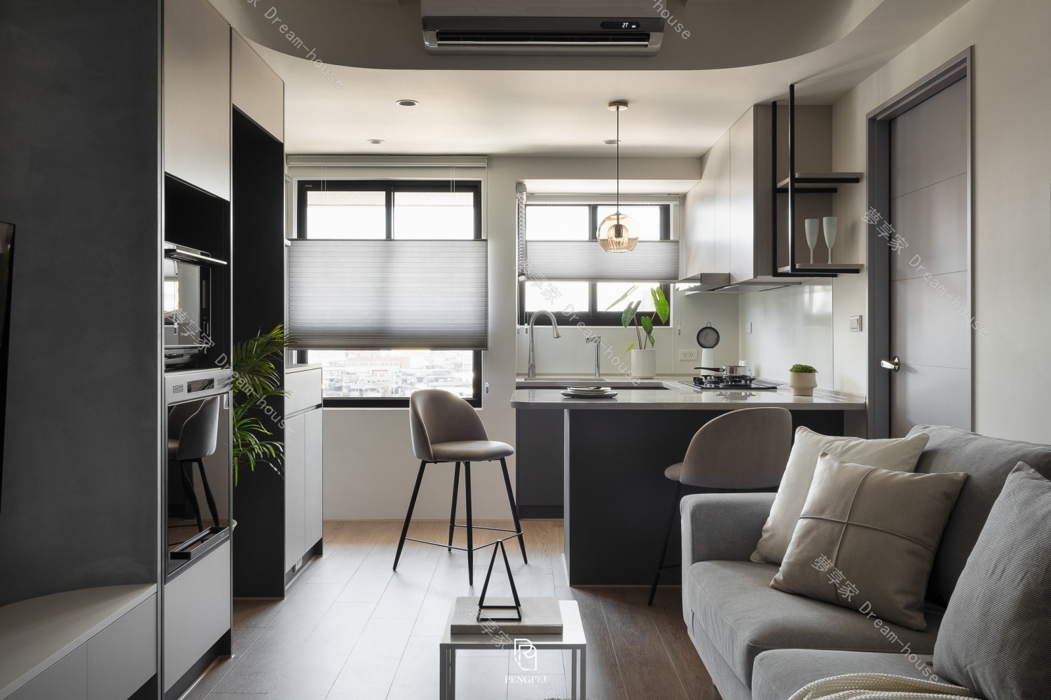 該案為新建案常見川字型格局,小坪數依屋主需求規劃大量收納空間,並滿足小廚具結合中島和餐桌為一體的設計概念。
