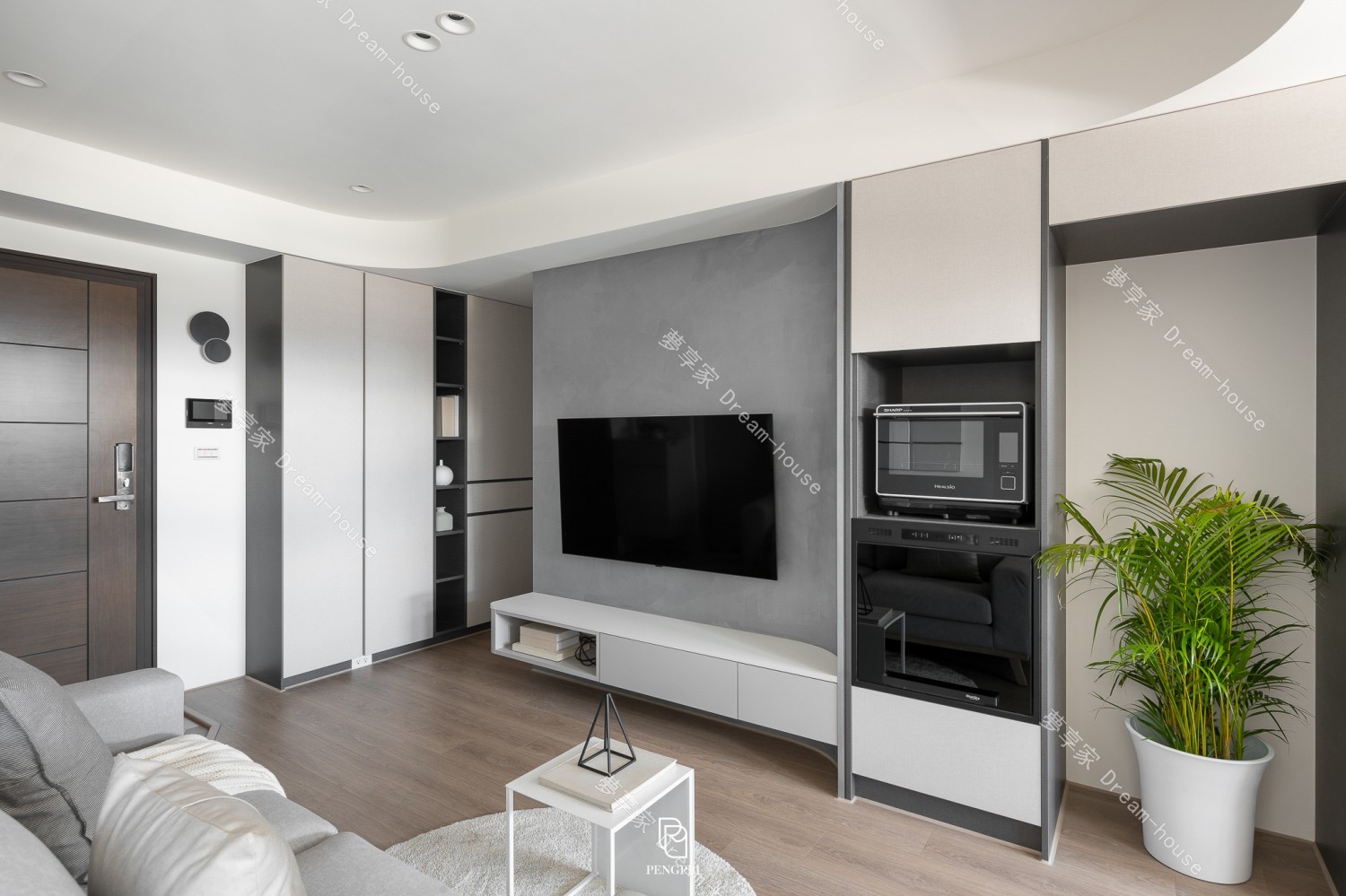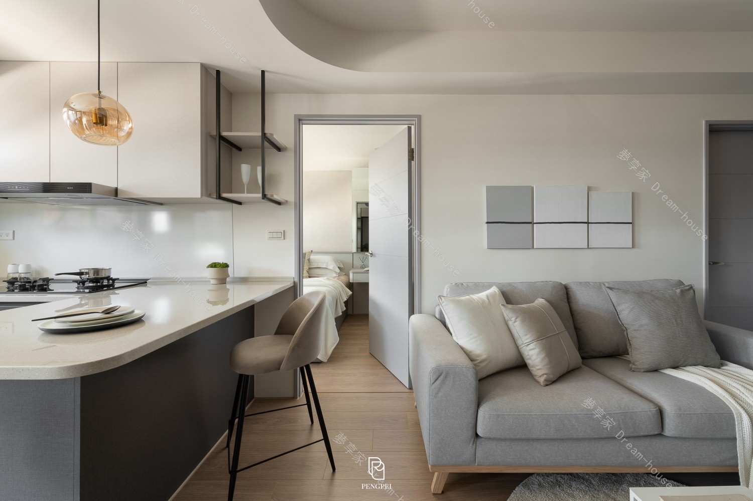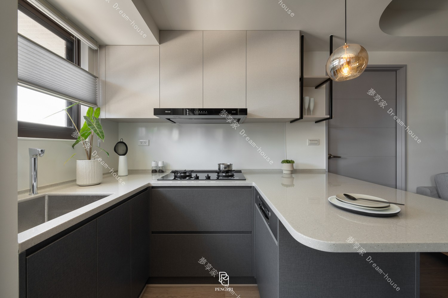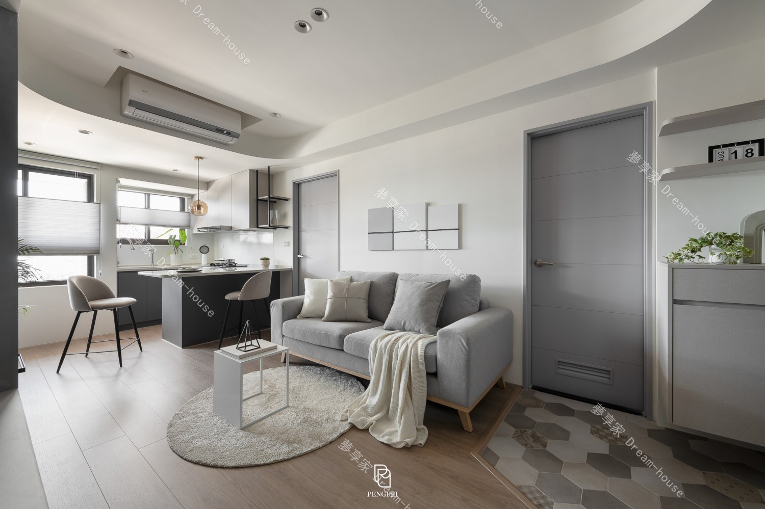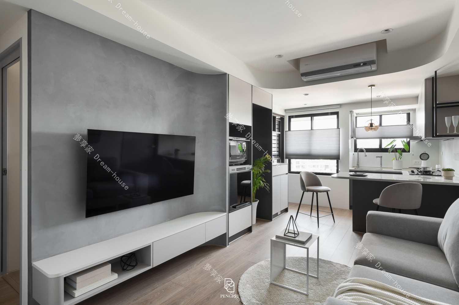 該案為新建案常見川字型格局,小坪數依屋主需求規劃大量收納空間,並滿足小廚具結合中島和餐桌為一體的設計概念。