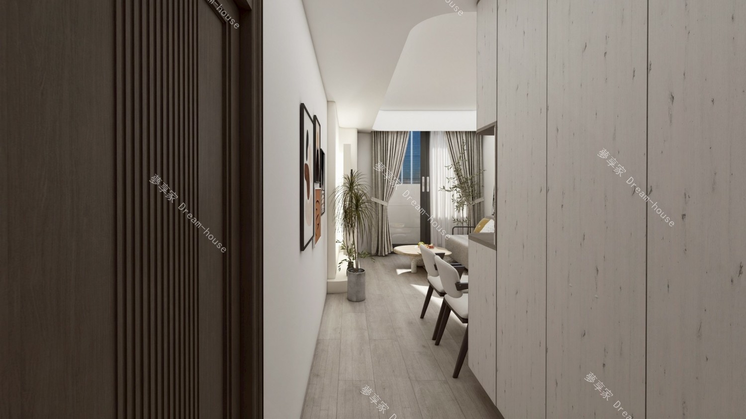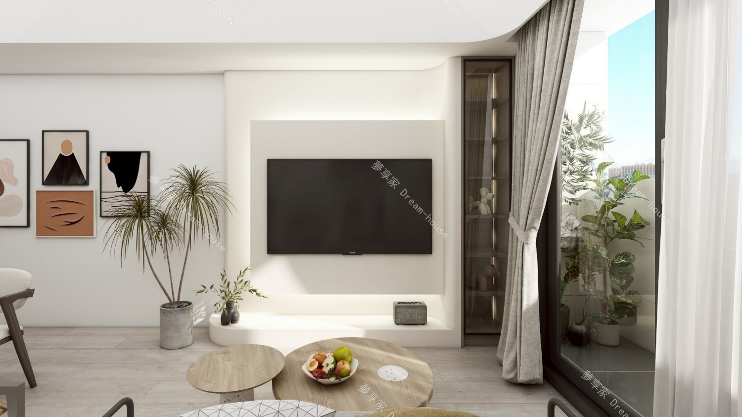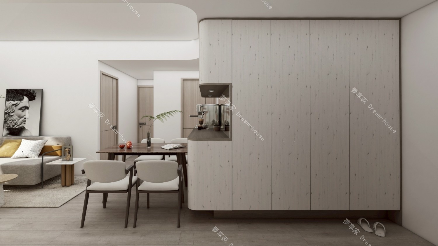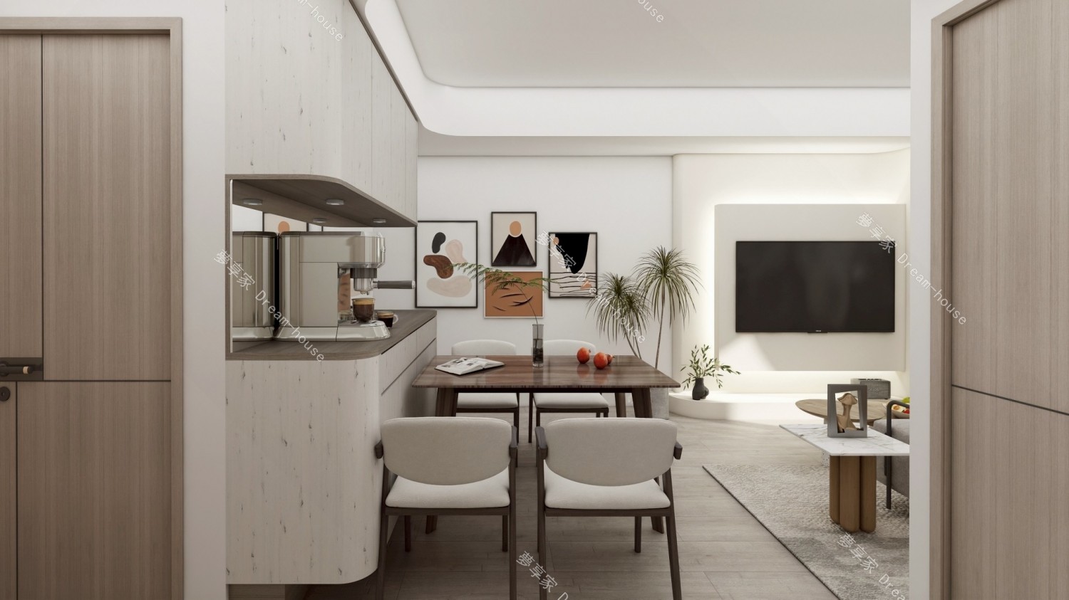 - 以「溫潤木質 × 純白留白 × 弧形語彙」為核心,透過柔和線條與自然材質交織,營造出一個兼具現代感與療癒氛圍的生活場域。設計不追求過度裝飾,而是回歸居住本質,讓空間成為情緒沉澱與日常放鬆的容器。