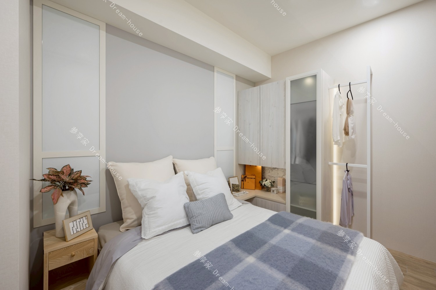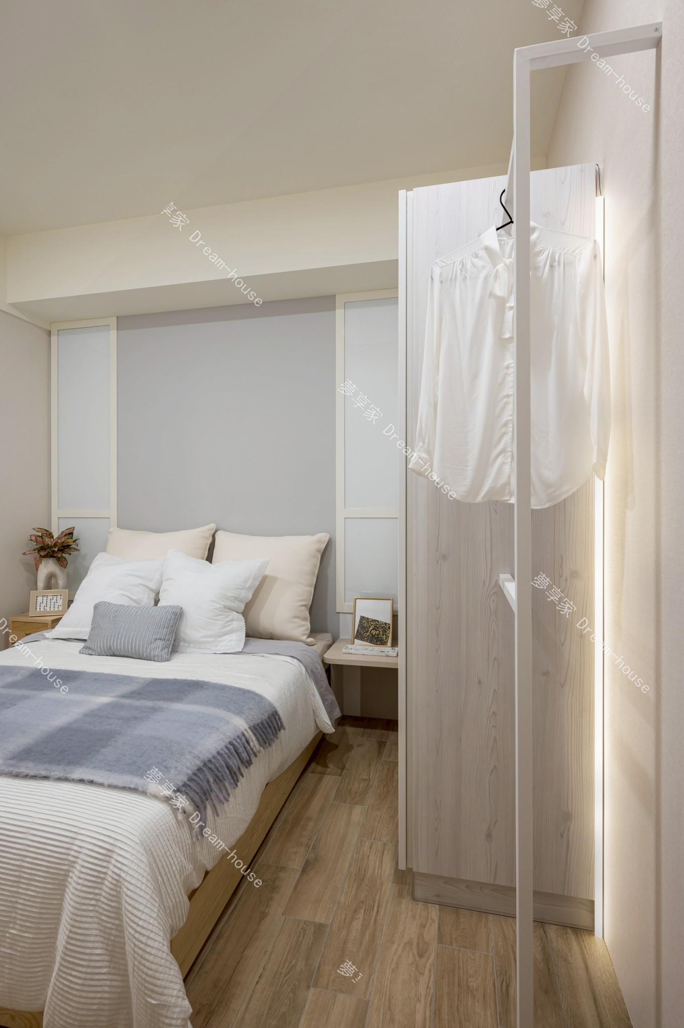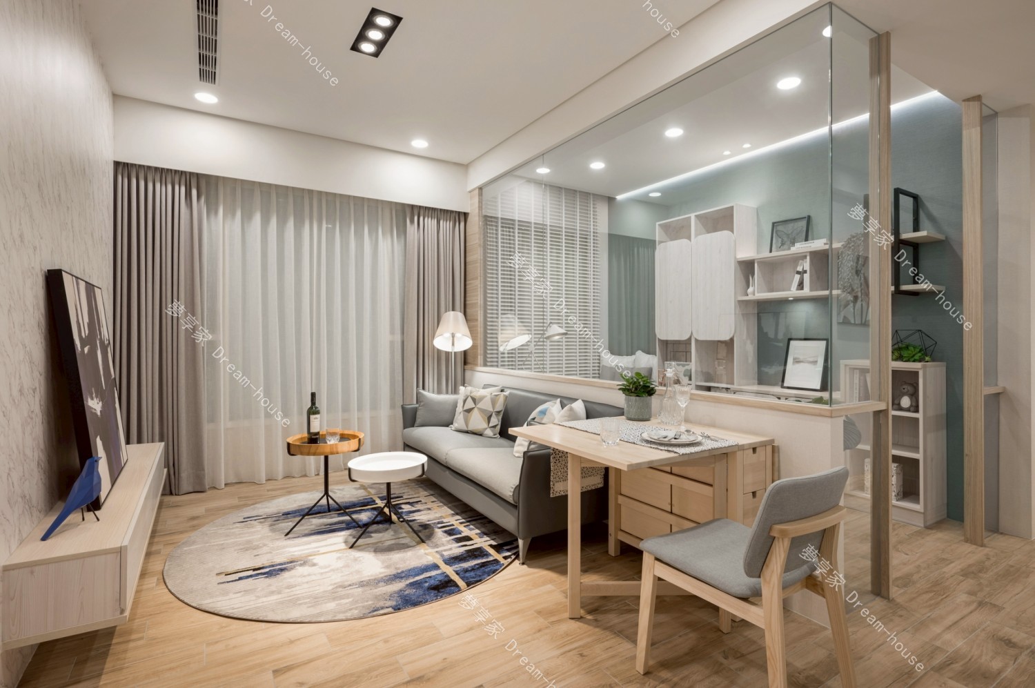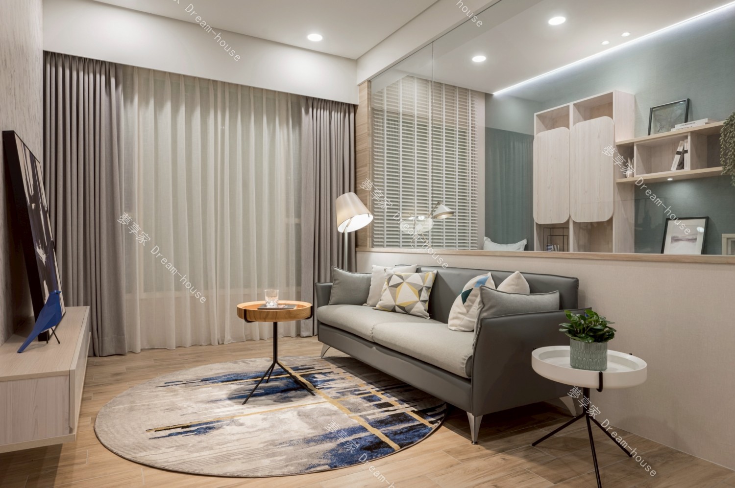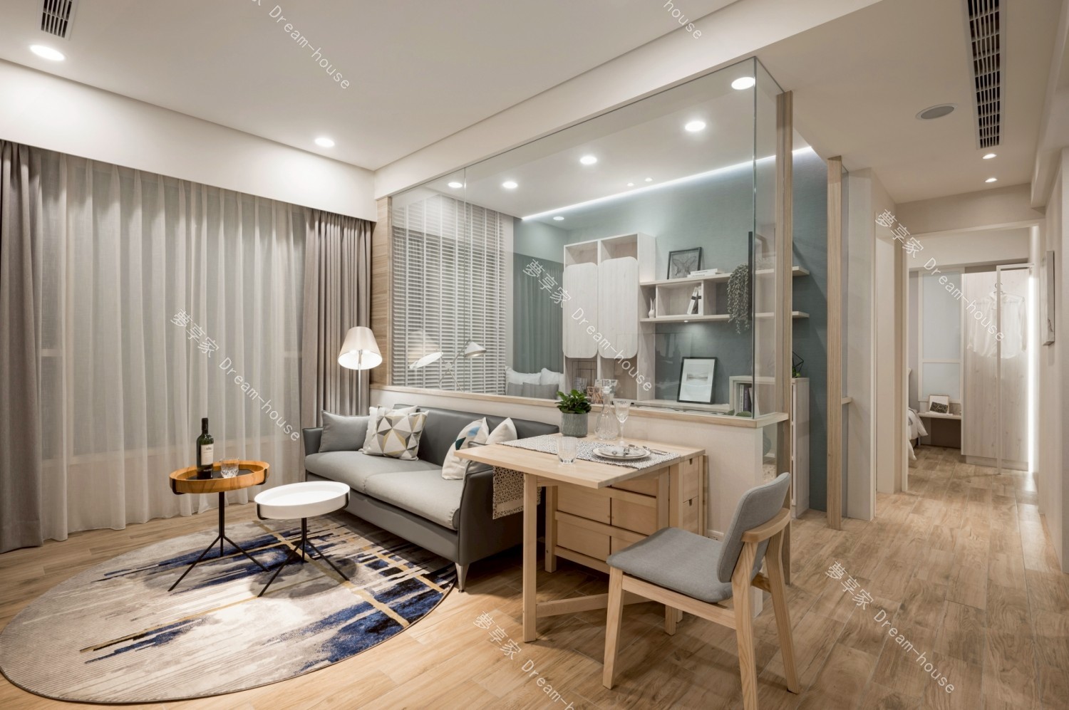 本案為中小坪數住宅規劃,整體風格走北歐清新混搭現代簡約路線,色彩以淺木紋、霧灰、灰藍為主,搭配間接照明與層次櫃體設計,營造出明亮、安定且富有生活感的居家氛圍。