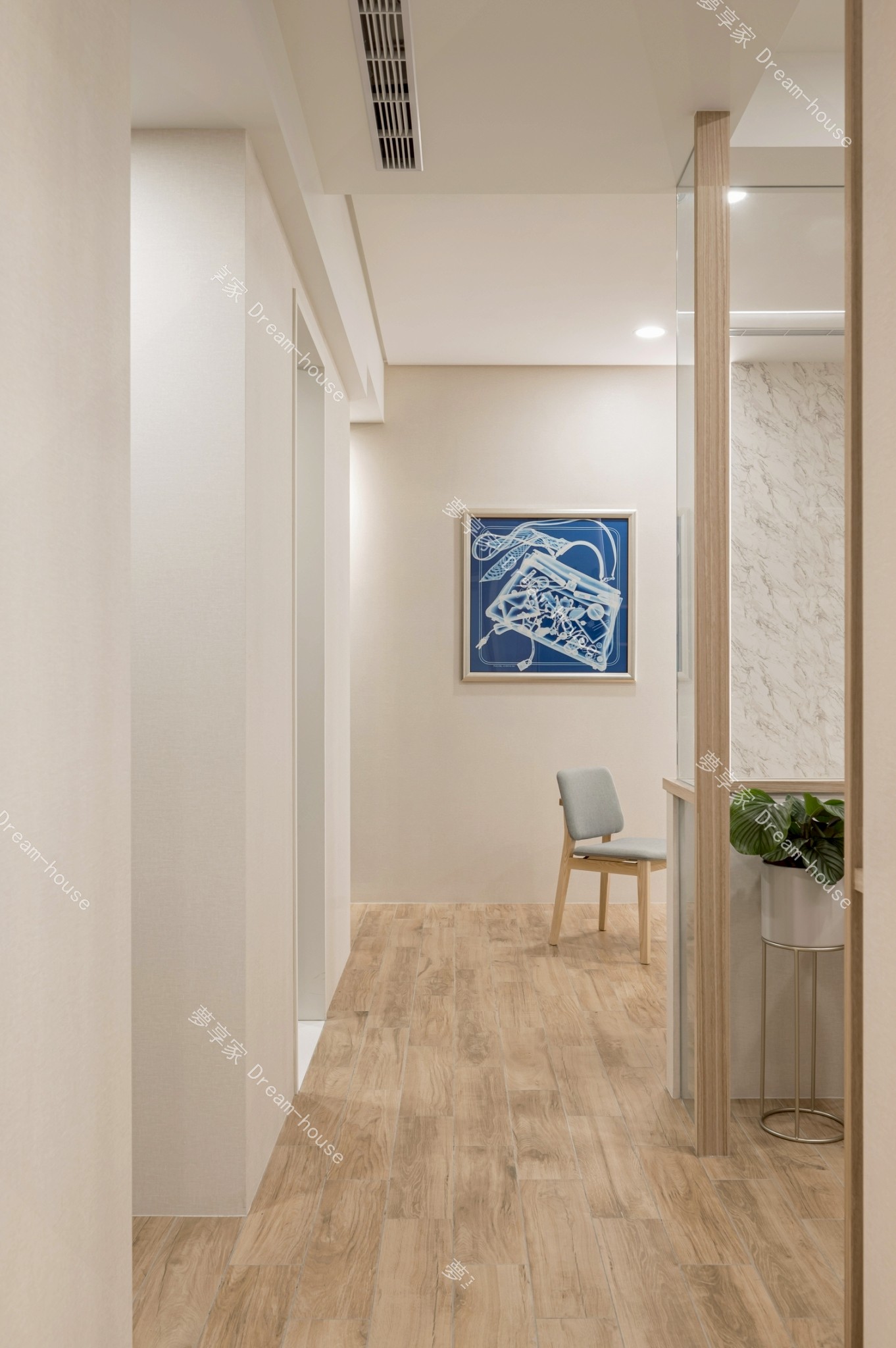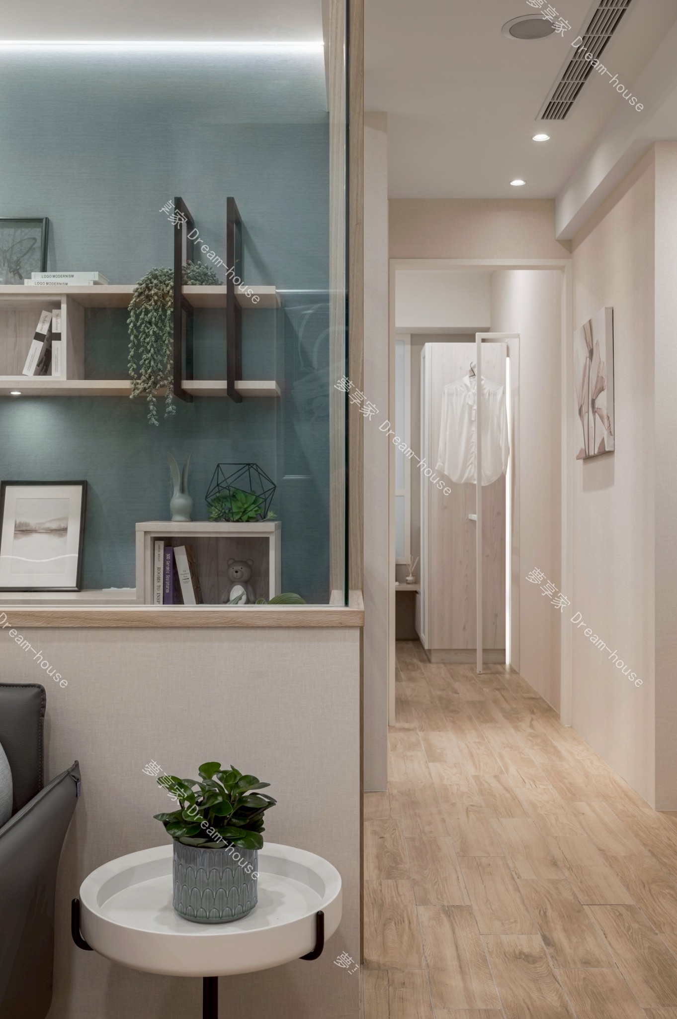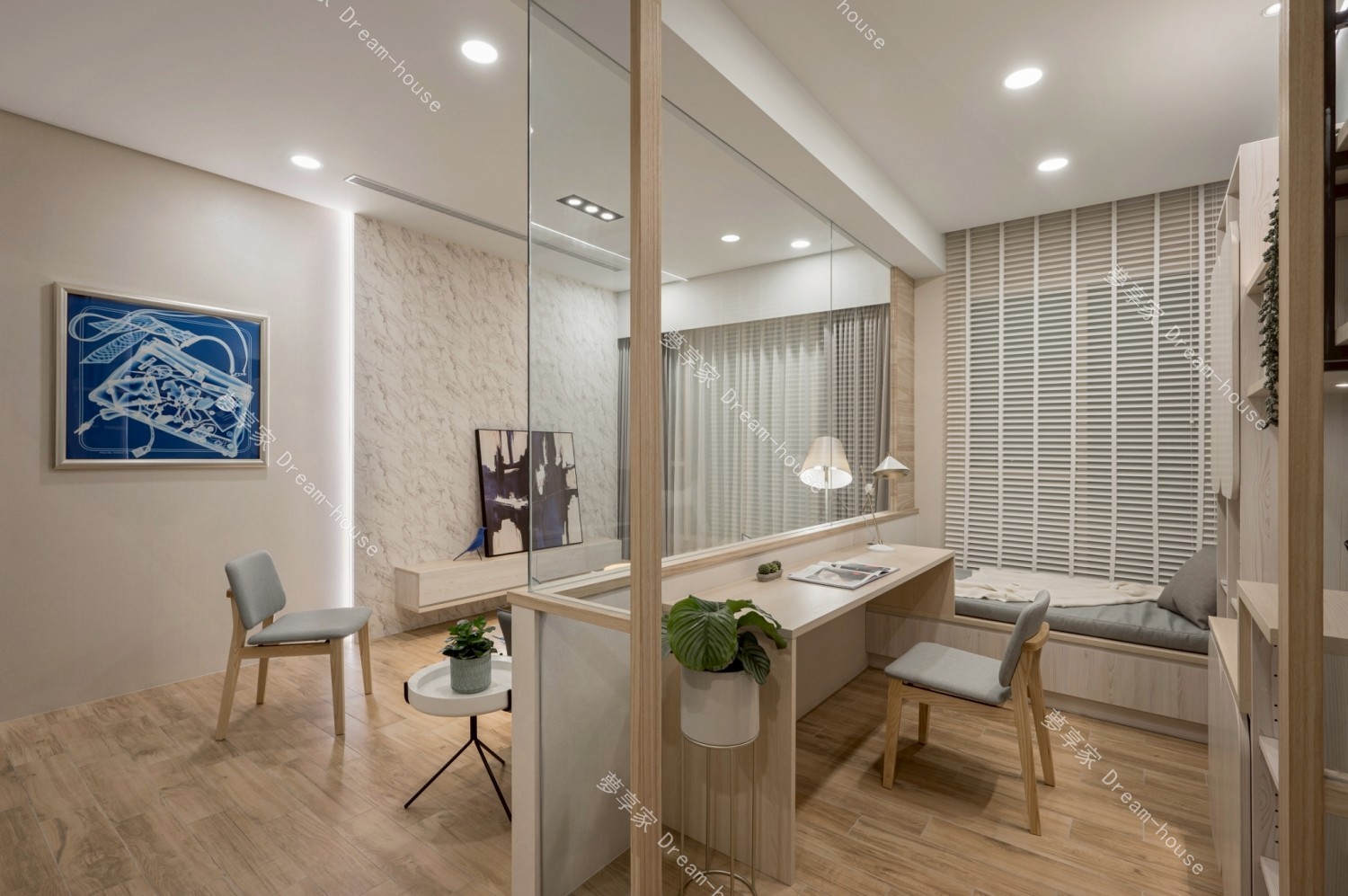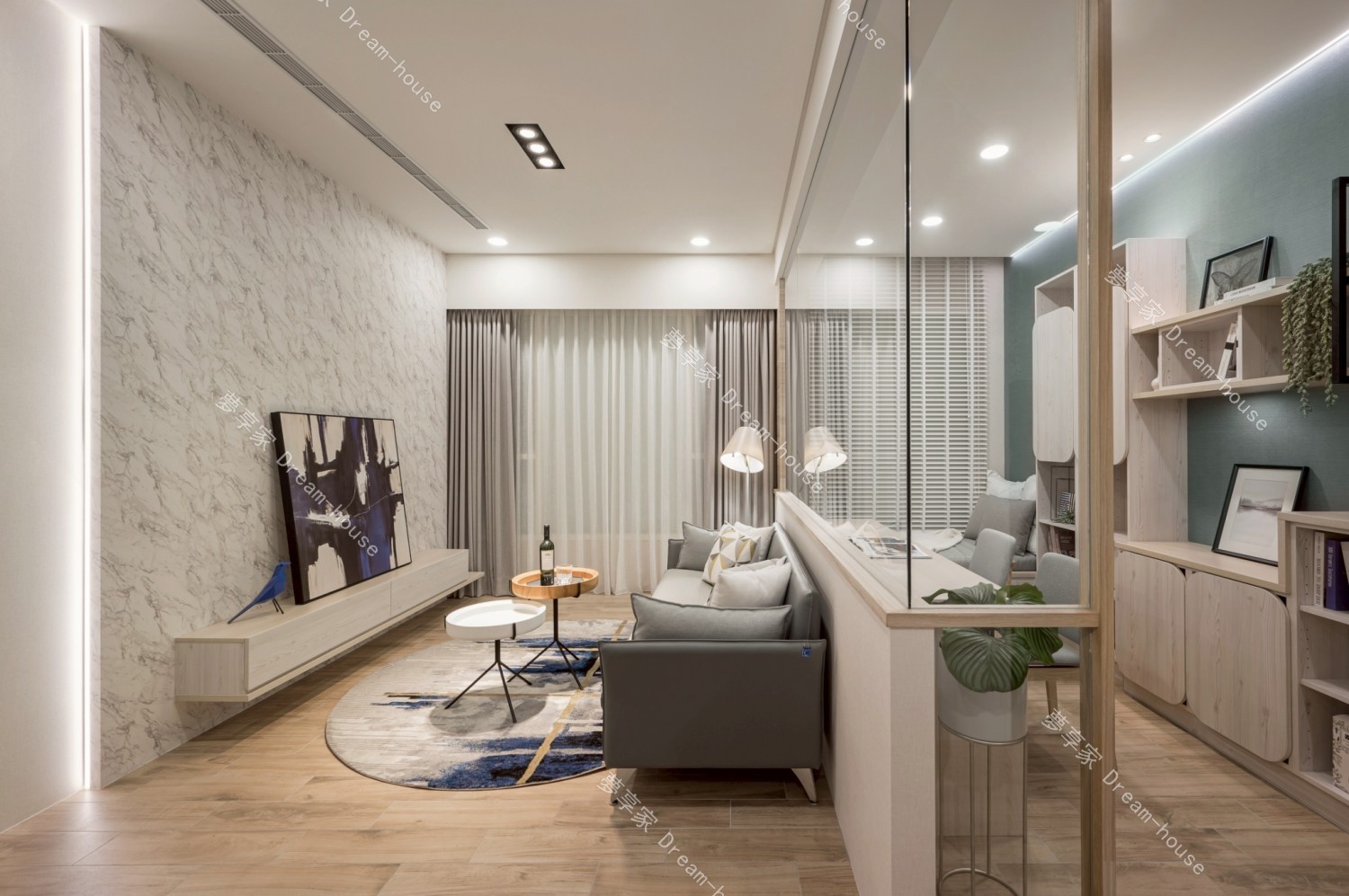 - 以「溫潤木質 × 清新灰藍 × 高效機能」為核心,回應現代都會生活中對舒適感、收納力與空間彈性的高度需求。透過系統櫃整合、玻璃隔間與柔性燈光設計,創造一個兼具視覺通透、生活秩序與放鬆氛圍的居住環境。