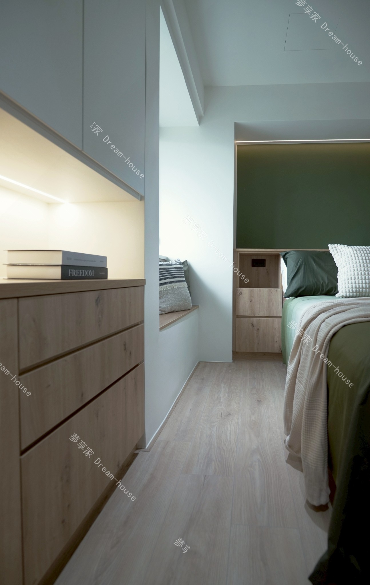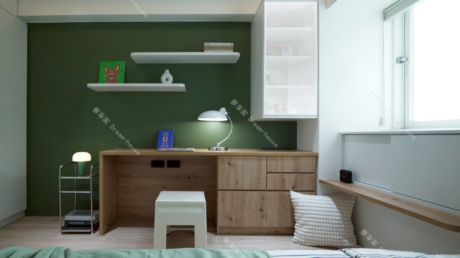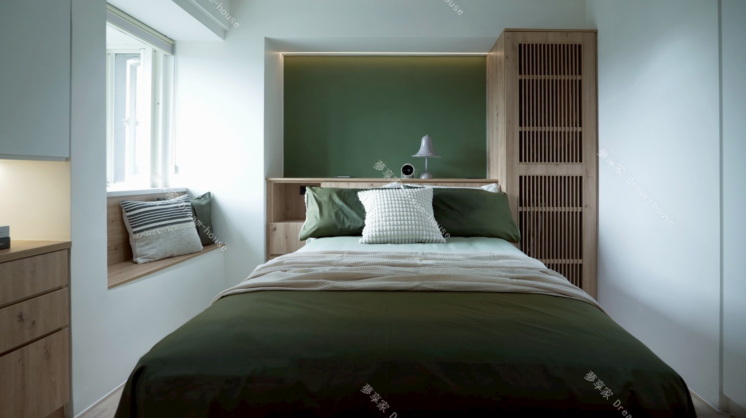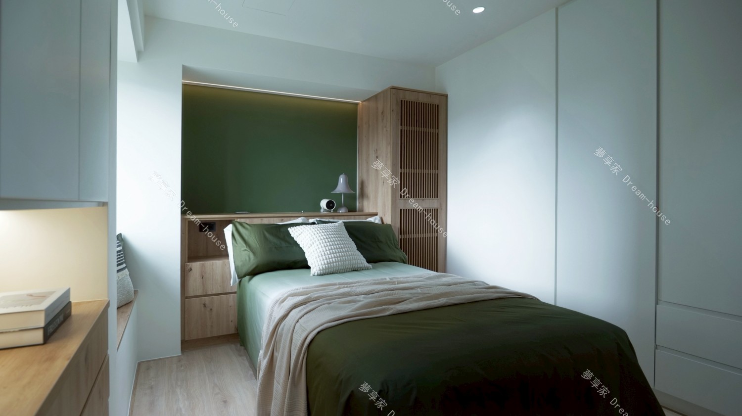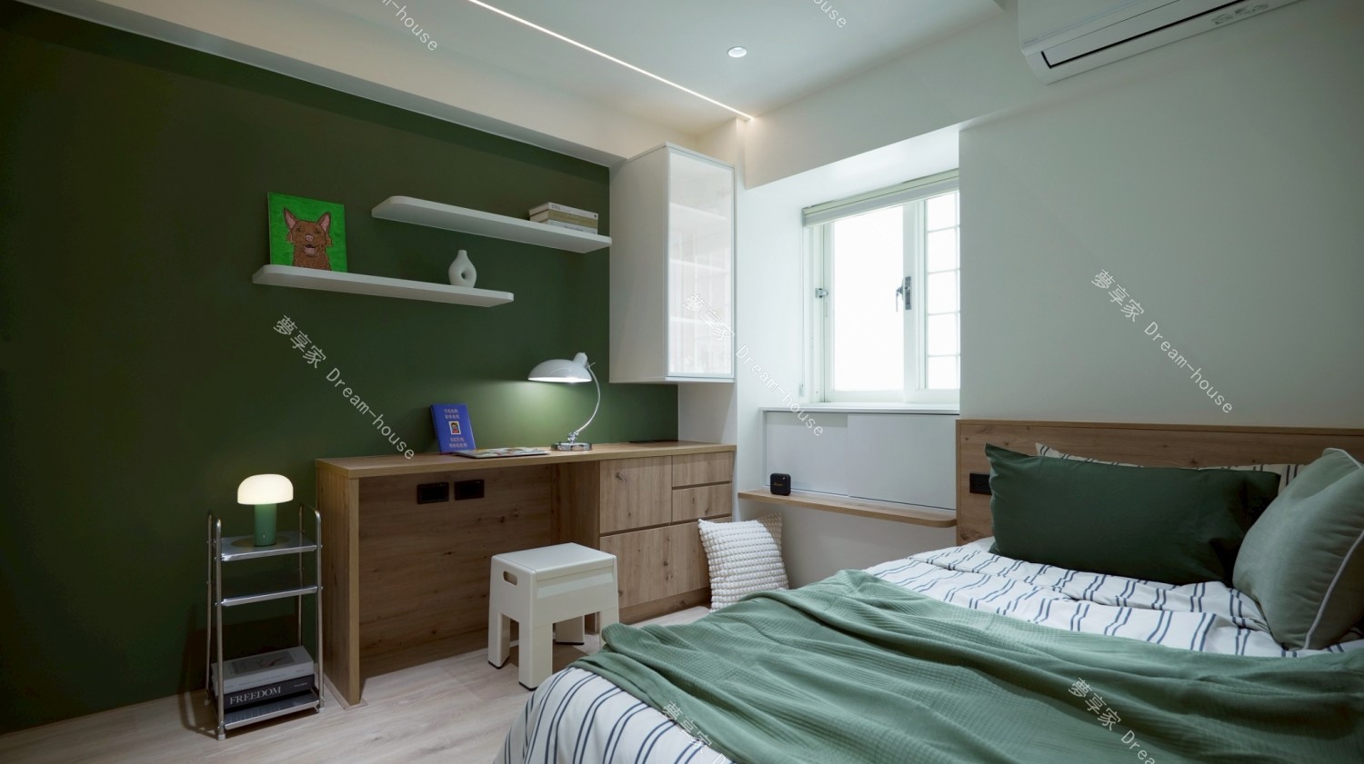 我的房間以沉穩的森林綠作為主,搭配溫潤木質與留白牆面,營造出安靜放鬆的氛圍。床鋪靠牆配置,床頭與書桌延續相同木色語彙,書桌上方規劃開放層板,擺放書籍與喜歡的小物,讓日常使用的物品自然融入空間。窗邊引入柔和自然光,搭配間接照明與桌燈,即使夜晚也能維持舒適亮度。