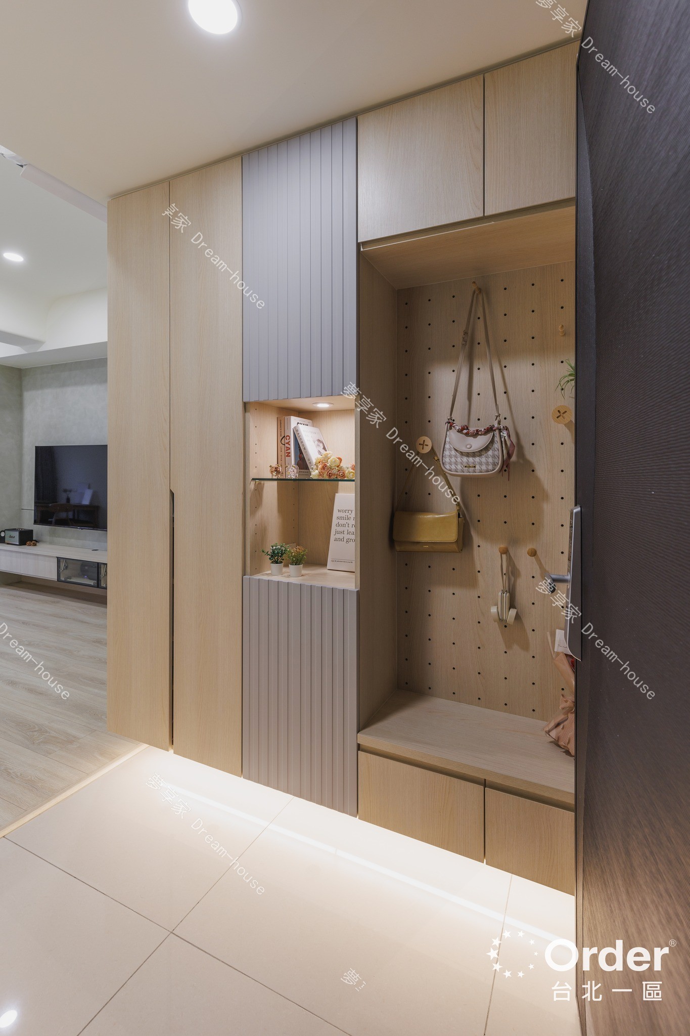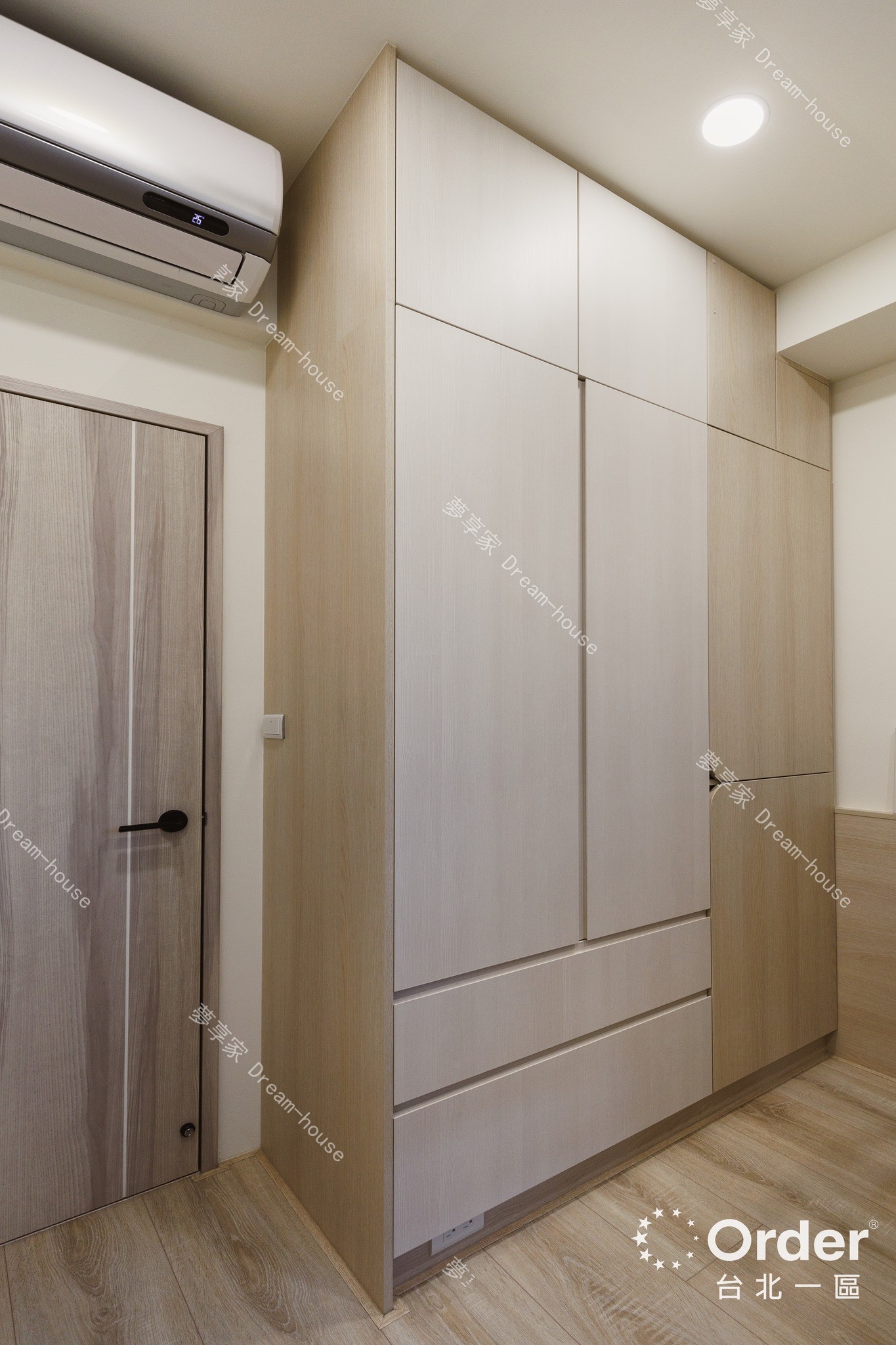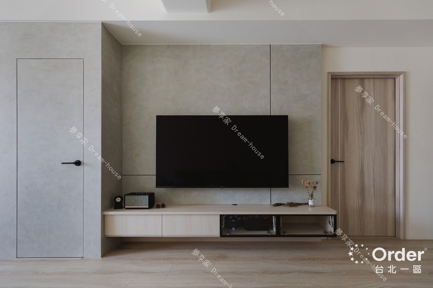 整體空間採用一致的中性暖灰與淺木色調,搭配大面積平整牆面與隱藏式門片,讓視覺延伸且放大空間感。