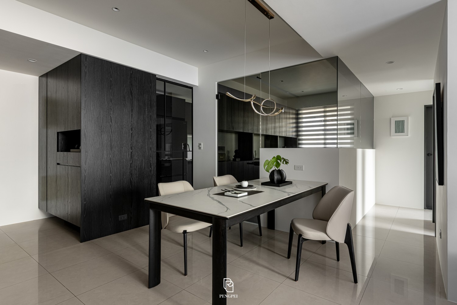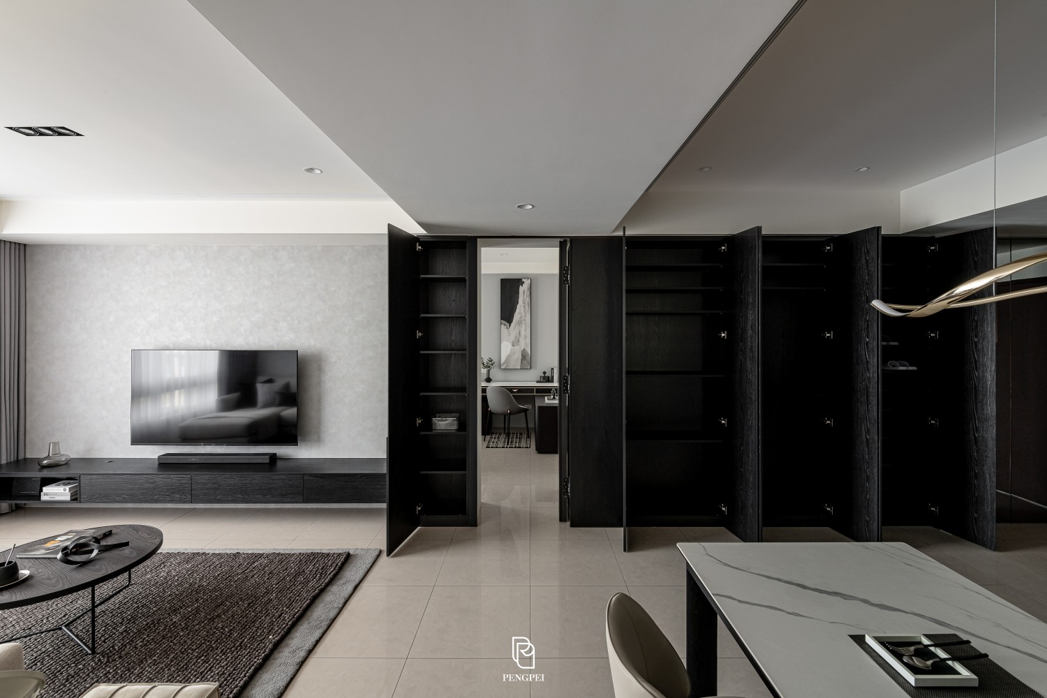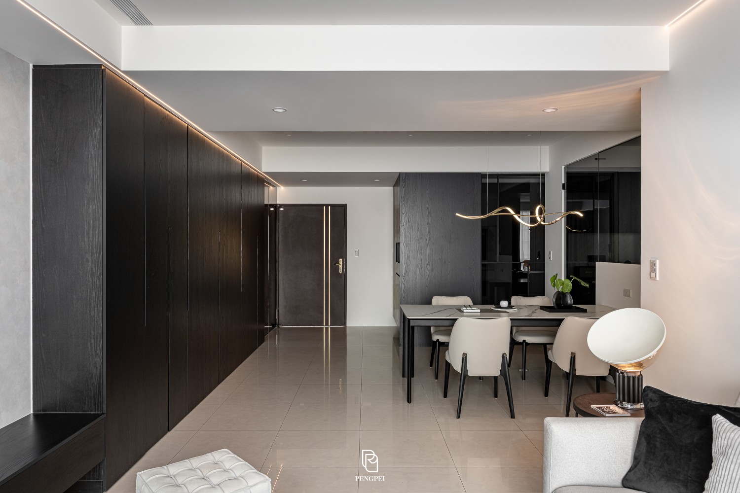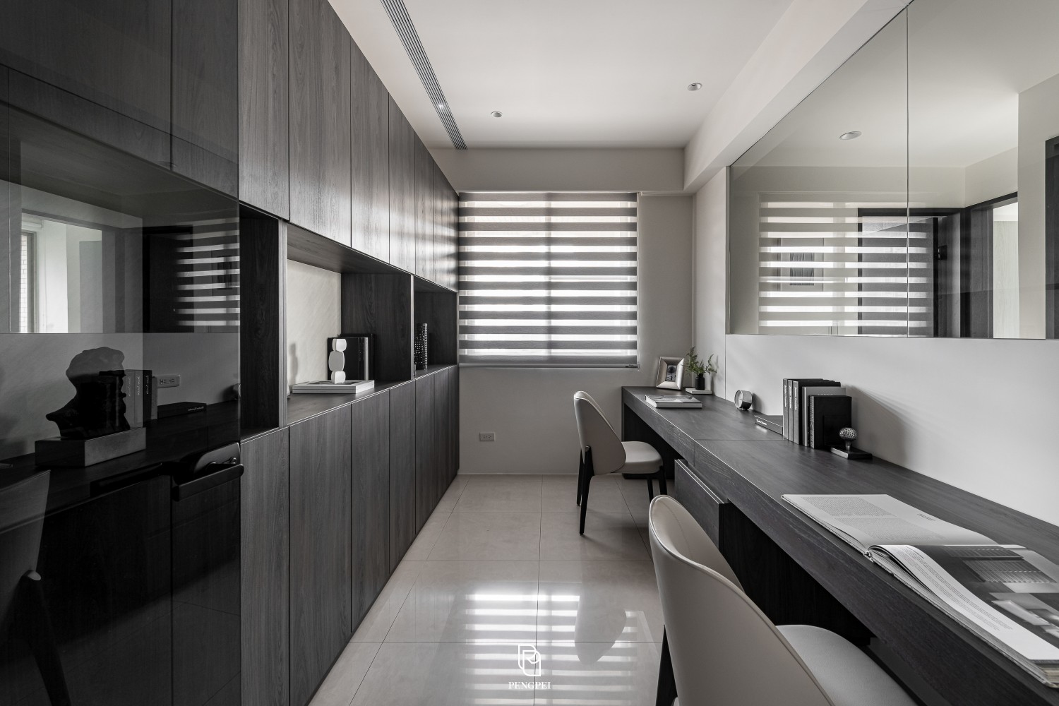 公共區域以深色調的木紋及灰黑階素材來進行搭配,收納櫃門片結合主臥室隱藏門延續公區整體造型,書房以玻璃隔間來規劃並使空間感能在放大。