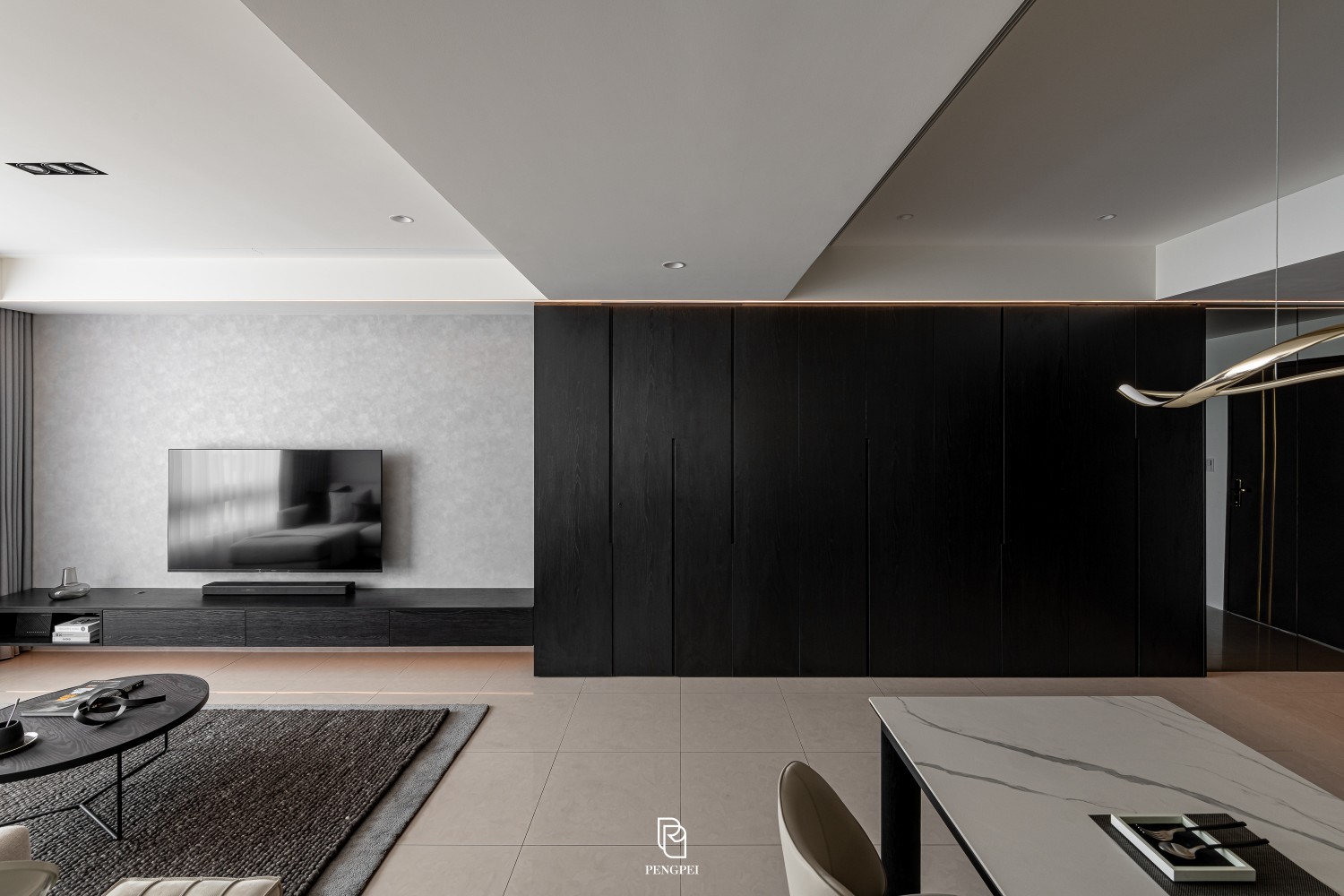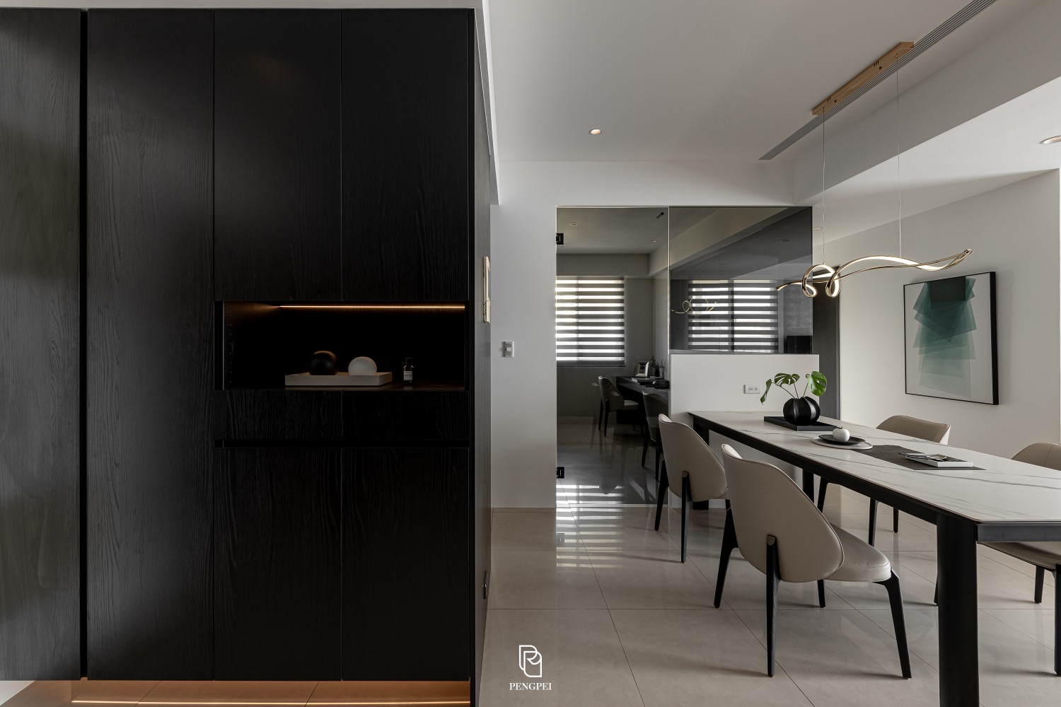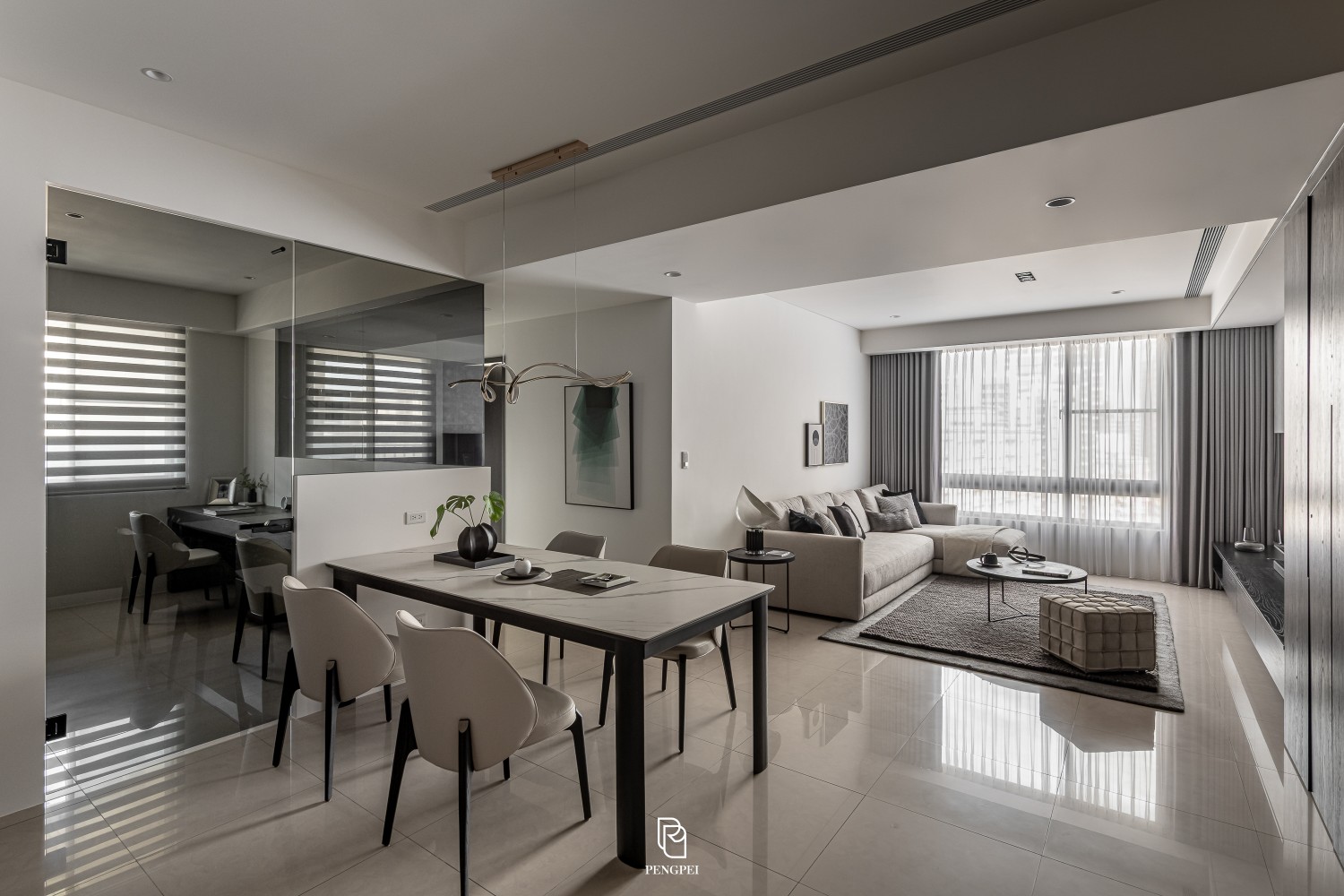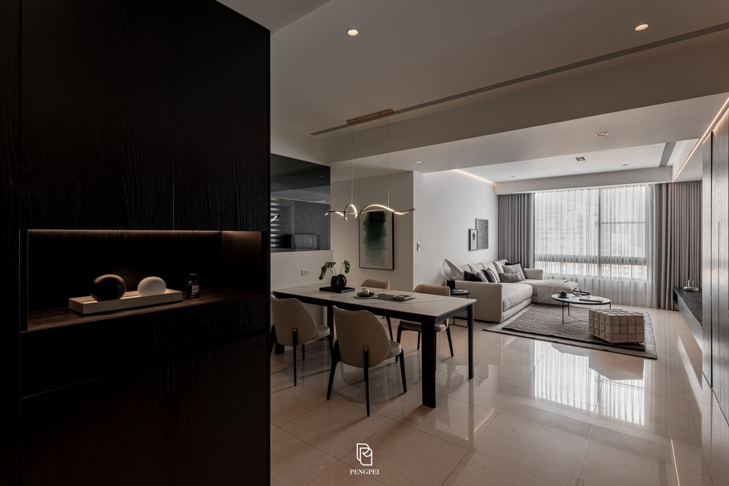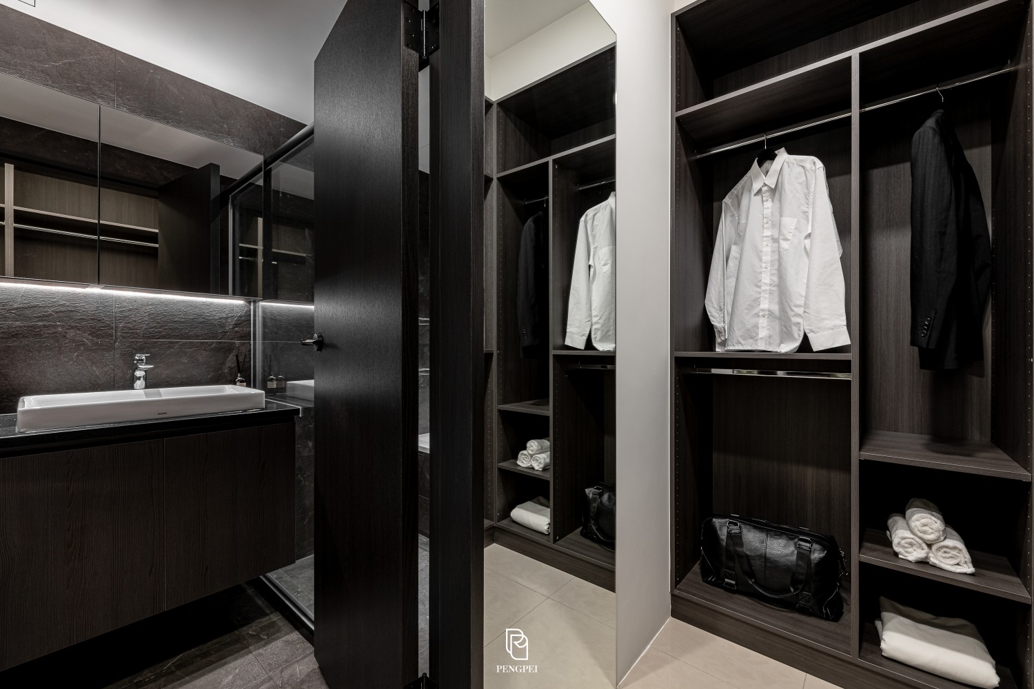 公共區域以深色調的木紋及灰黑階素材來進行搭配,收納櫃門片結合主臥室隱藏門延續公區整體造型,書房以玻璃隔間來規劃並使空間感能在放大。
