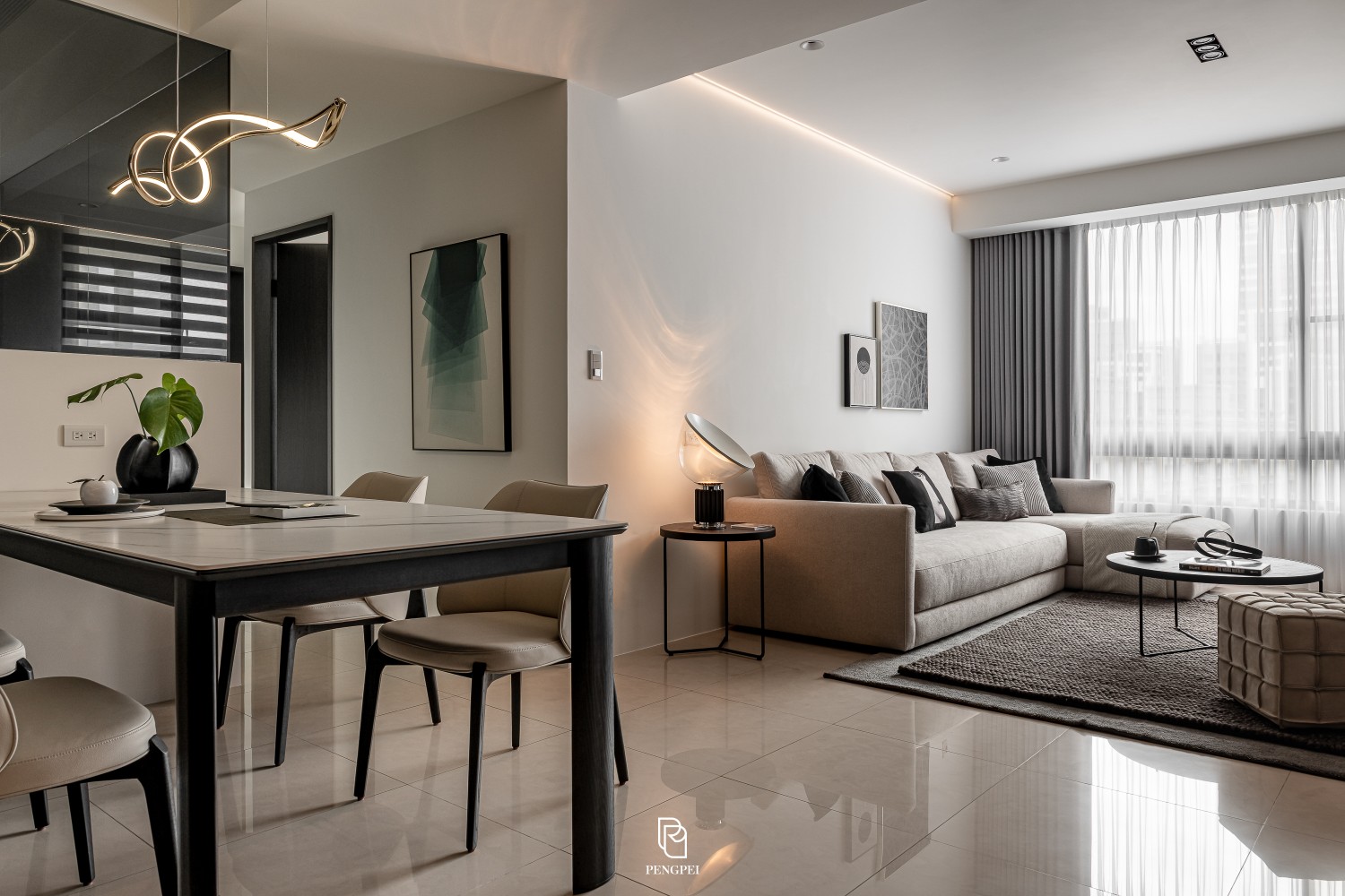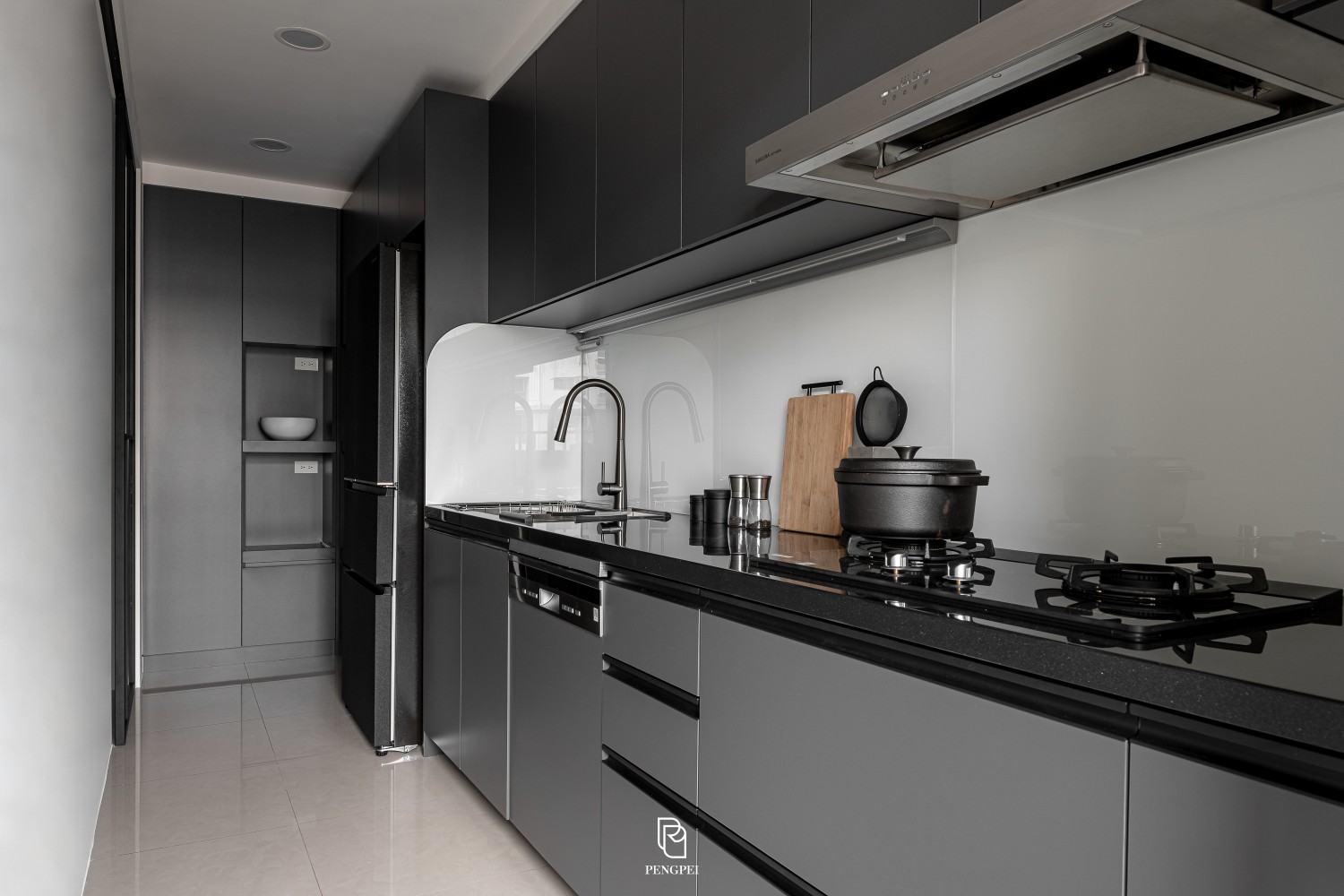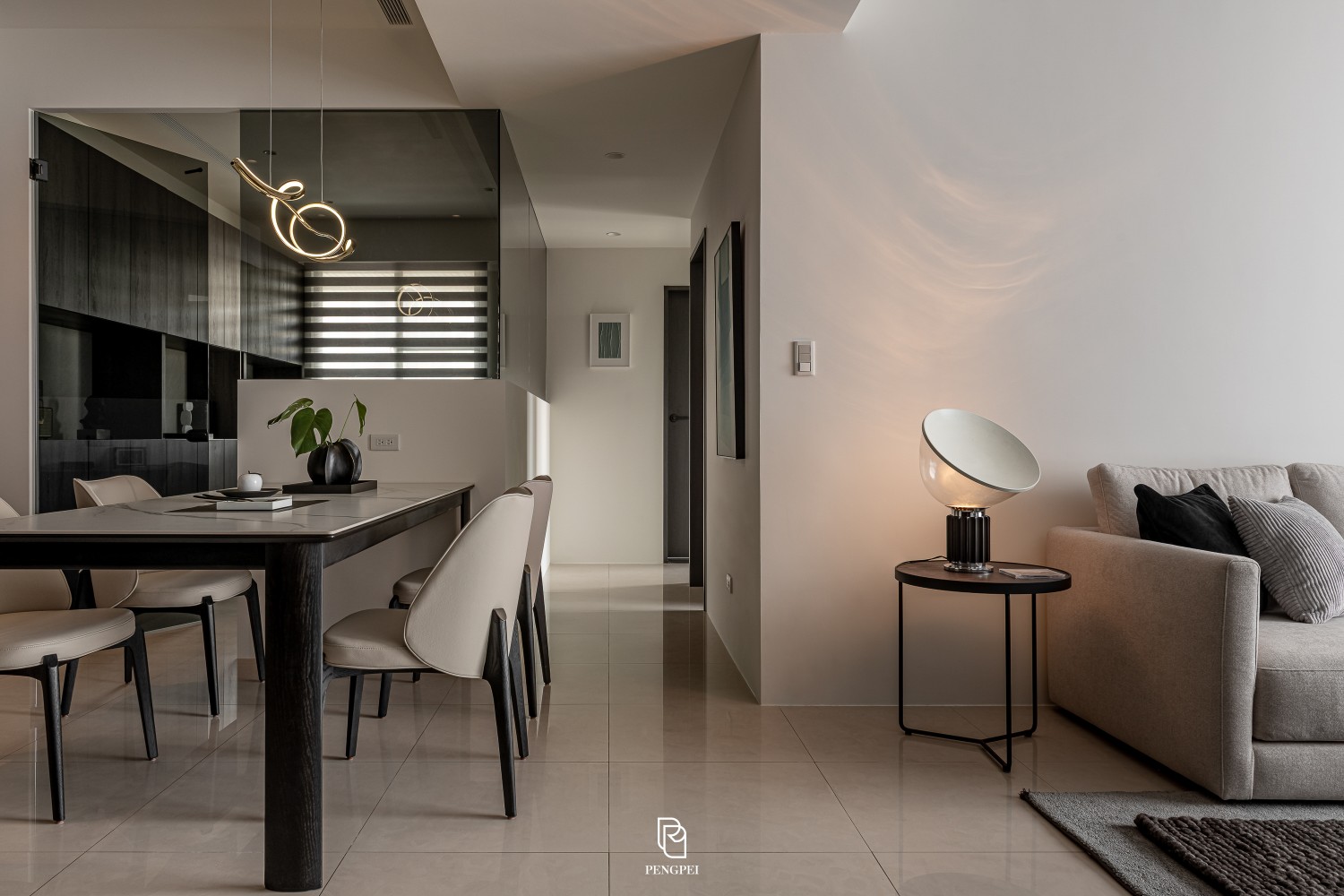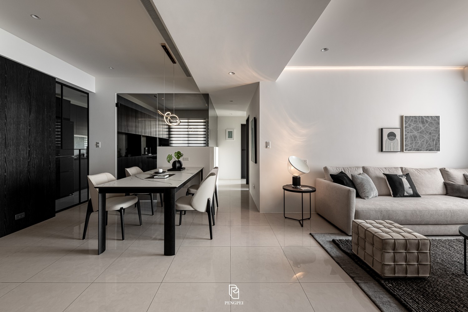 公共區域以深色調的木紋及灰黑階素材來進行搭配,收納櫃門片結合主臥室隱藏門延續公區整體造型,書房以玻璃隔間來規劃並使空間感能在放大。
