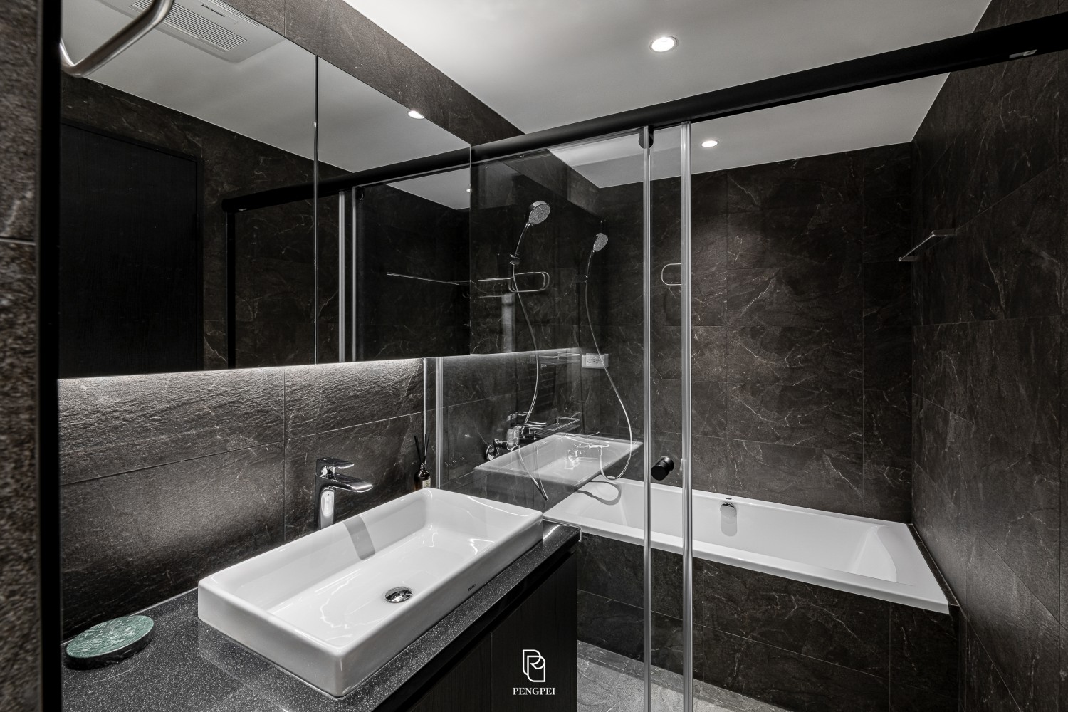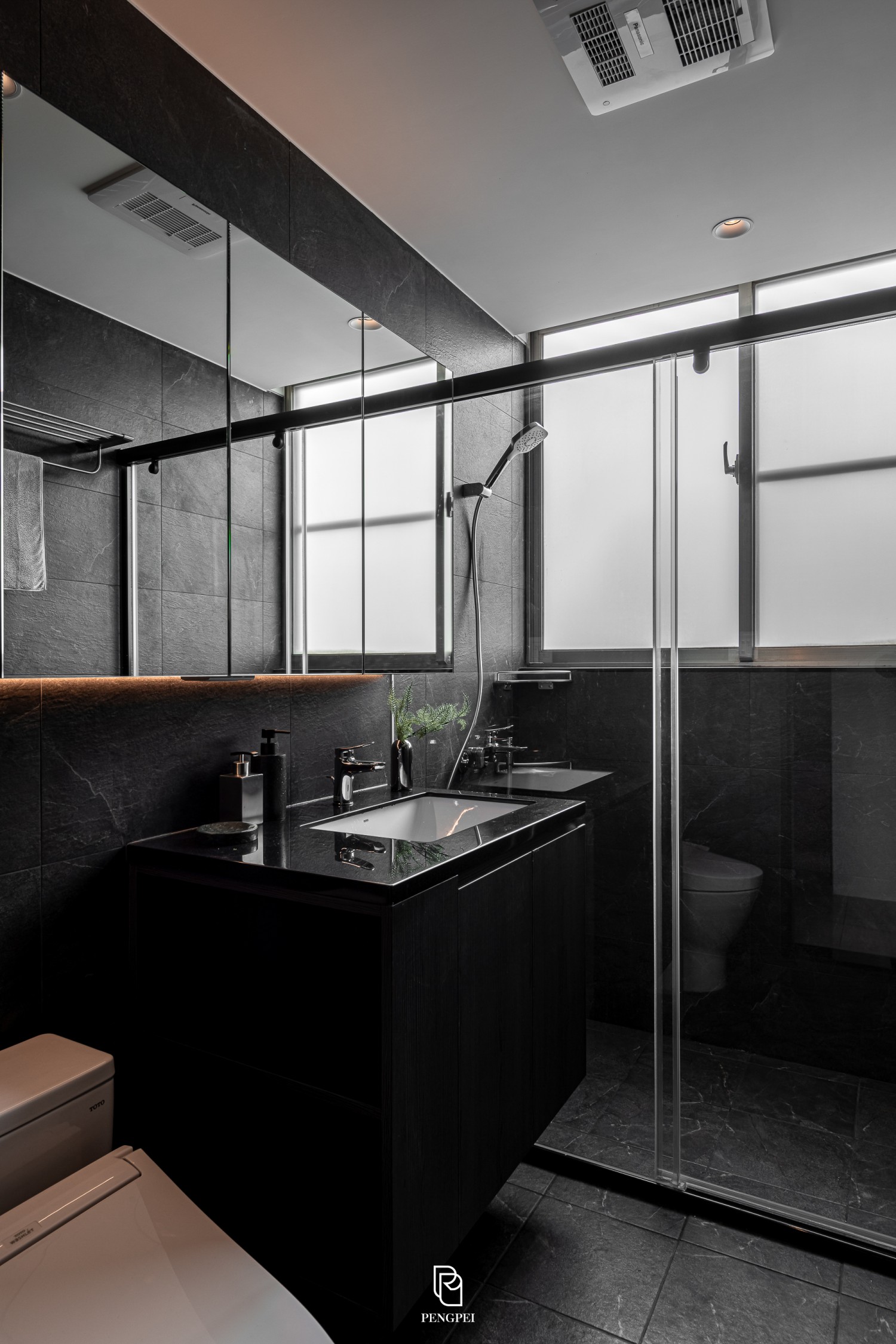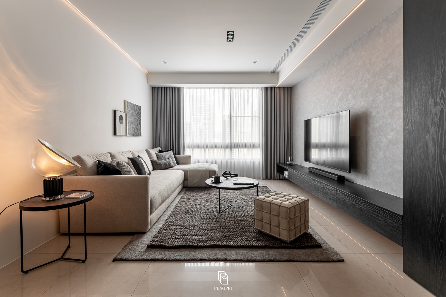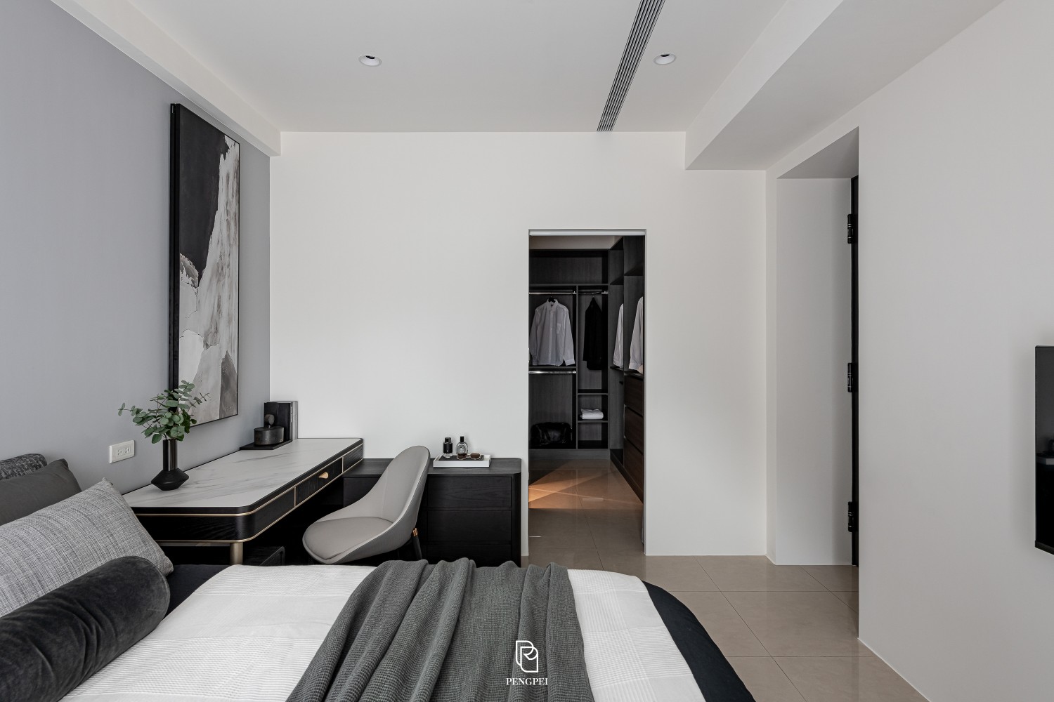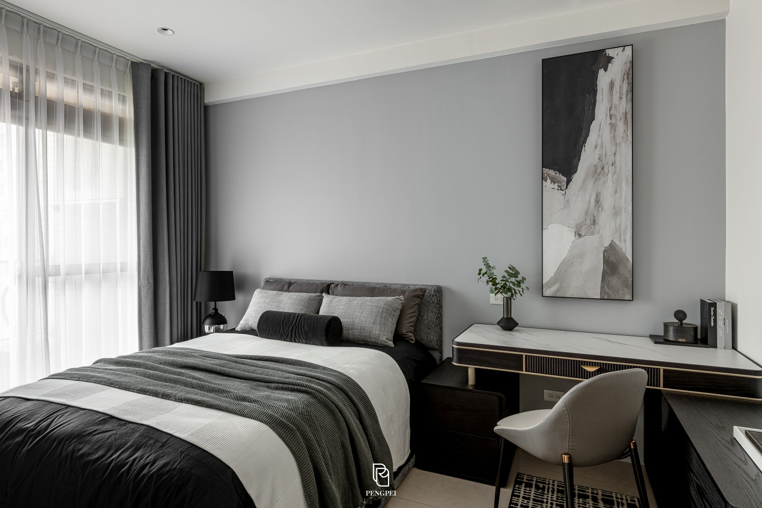 公共區域以深色調的木紋及灰黑階素材來進行搭配,收納櫃門片結合主臥室隱藏門延續公區整體造型,書房以玻璃隔間來規劃並使空間感能在放大。
