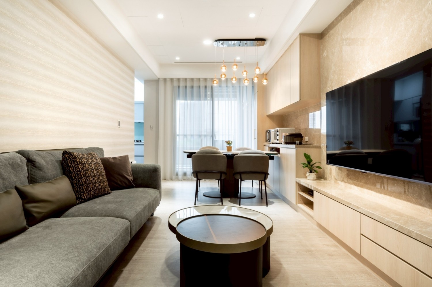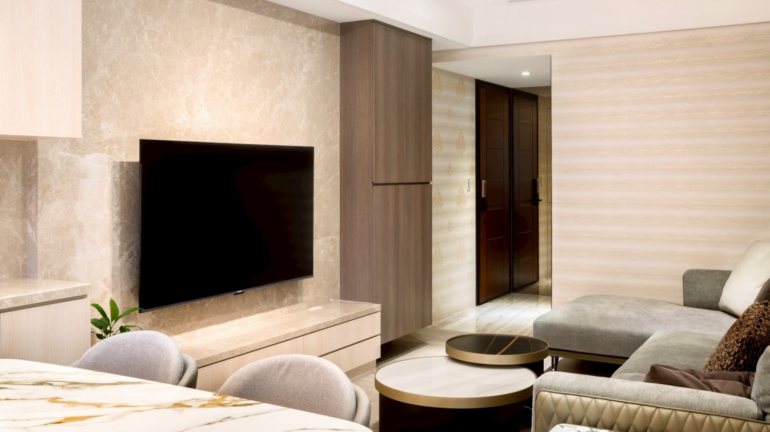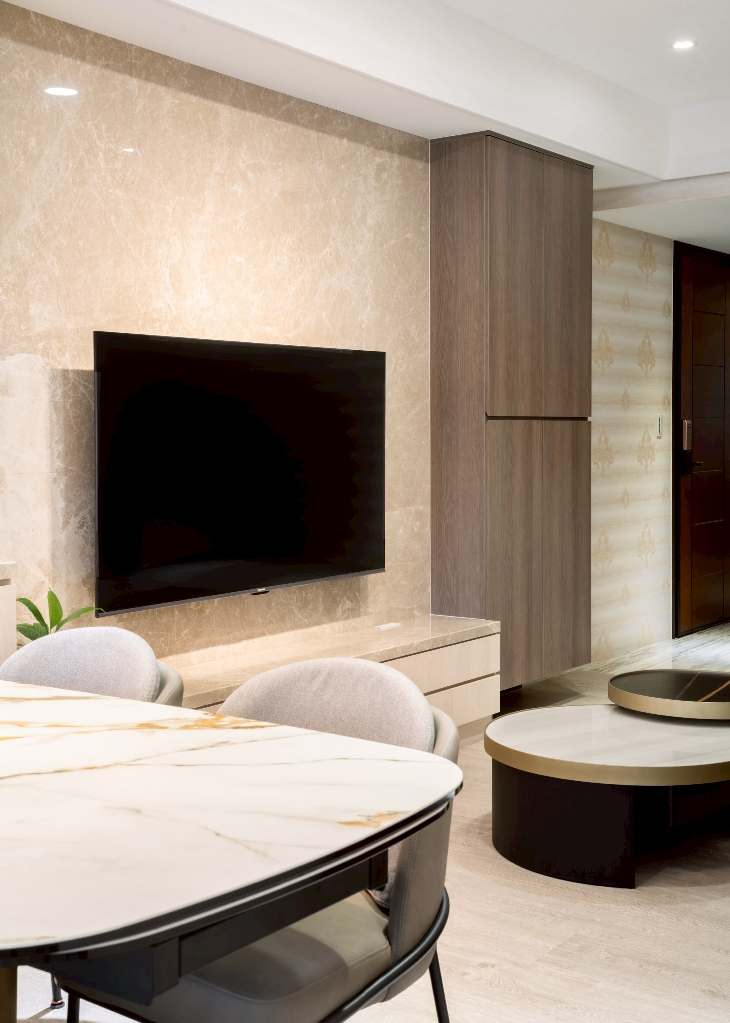 公共空間以石紋電視牆作為視覺主軸,搭配木質立面櫃體與低調收納設計,讓空間在沉穩中展現質感層次。