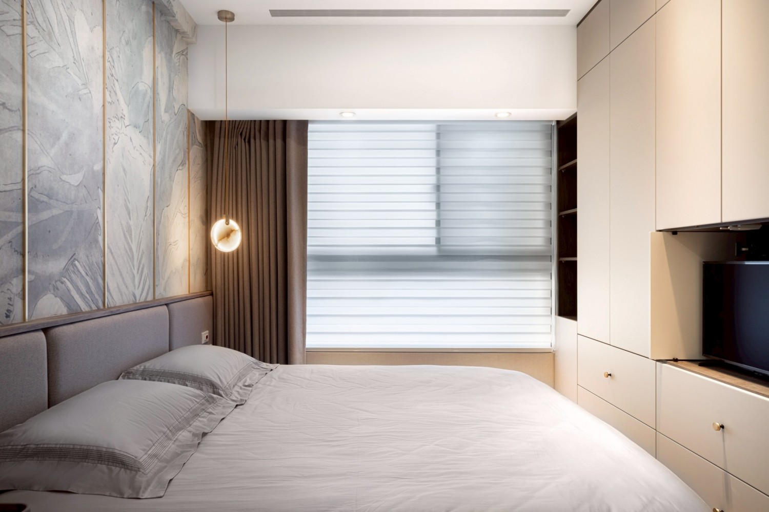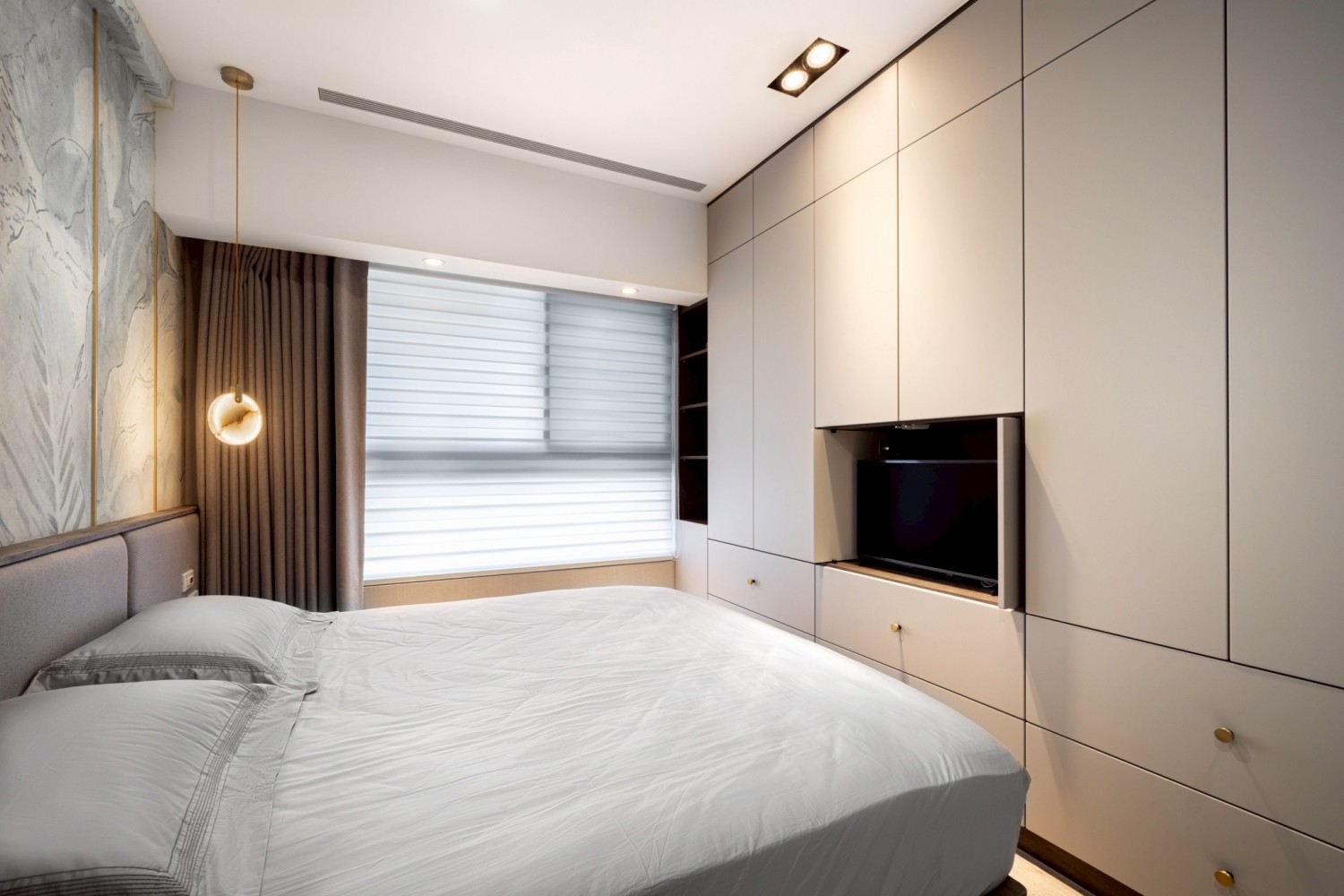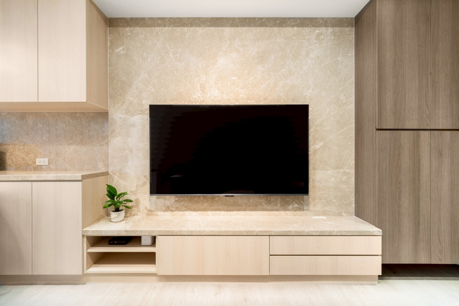 公共空間以石紋電視牆作為視覺主軸,搭配木質立面櫃體與低調收納設計,讓空間在沉穩中展現質感層次。