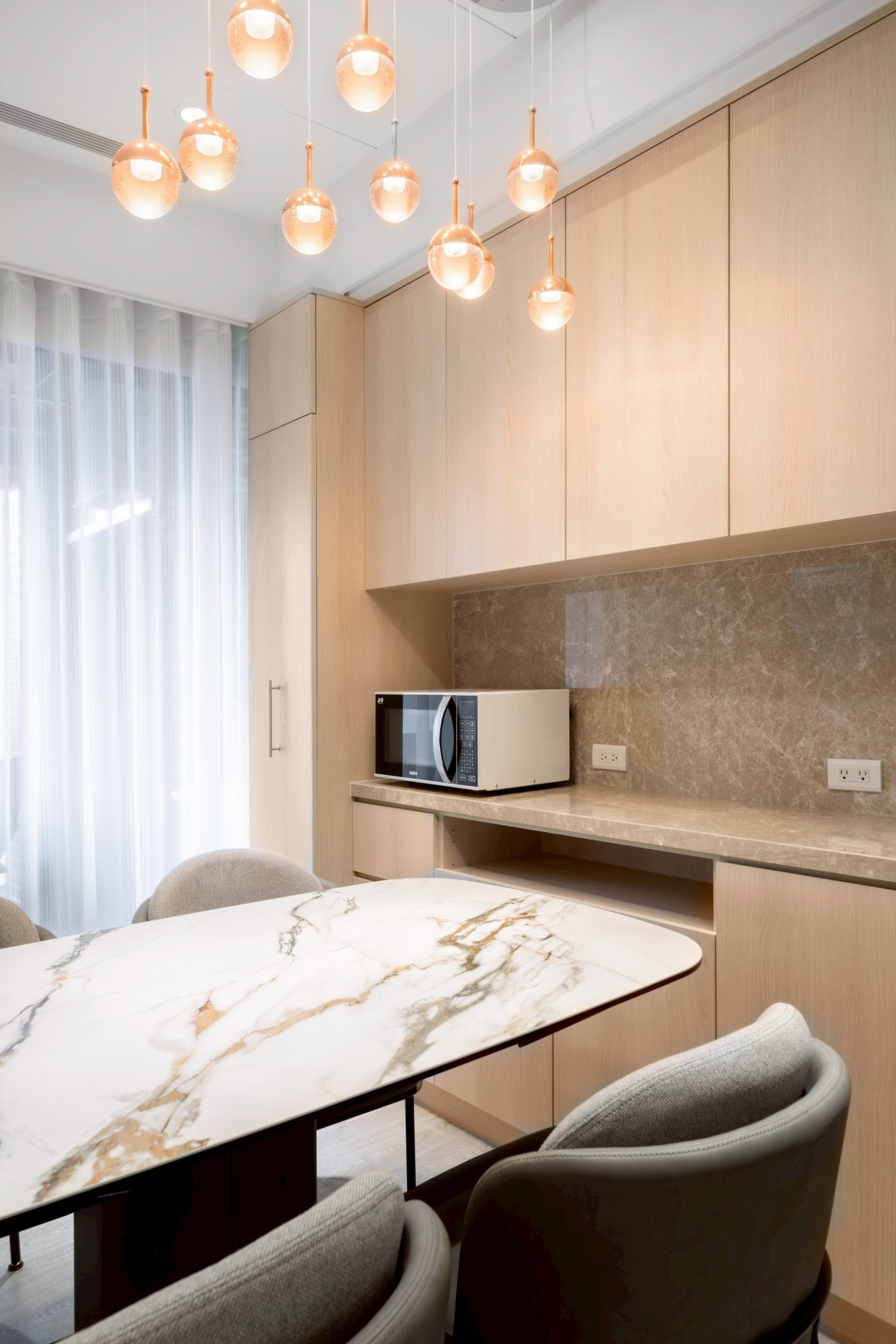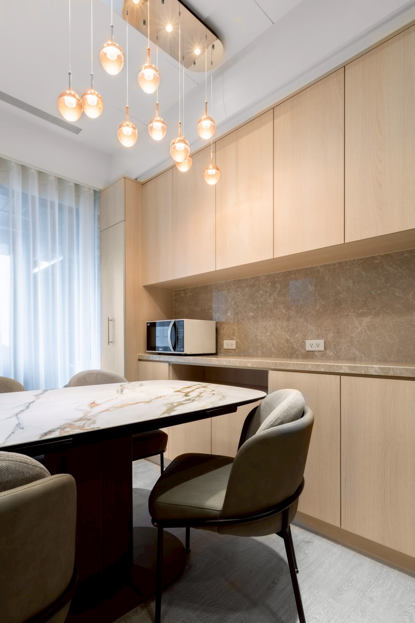 餐廳區透過整排餐邊櫃整合收納機能,並搭配吊燈營造用餐氛圍,使空間更具生活儀式感。