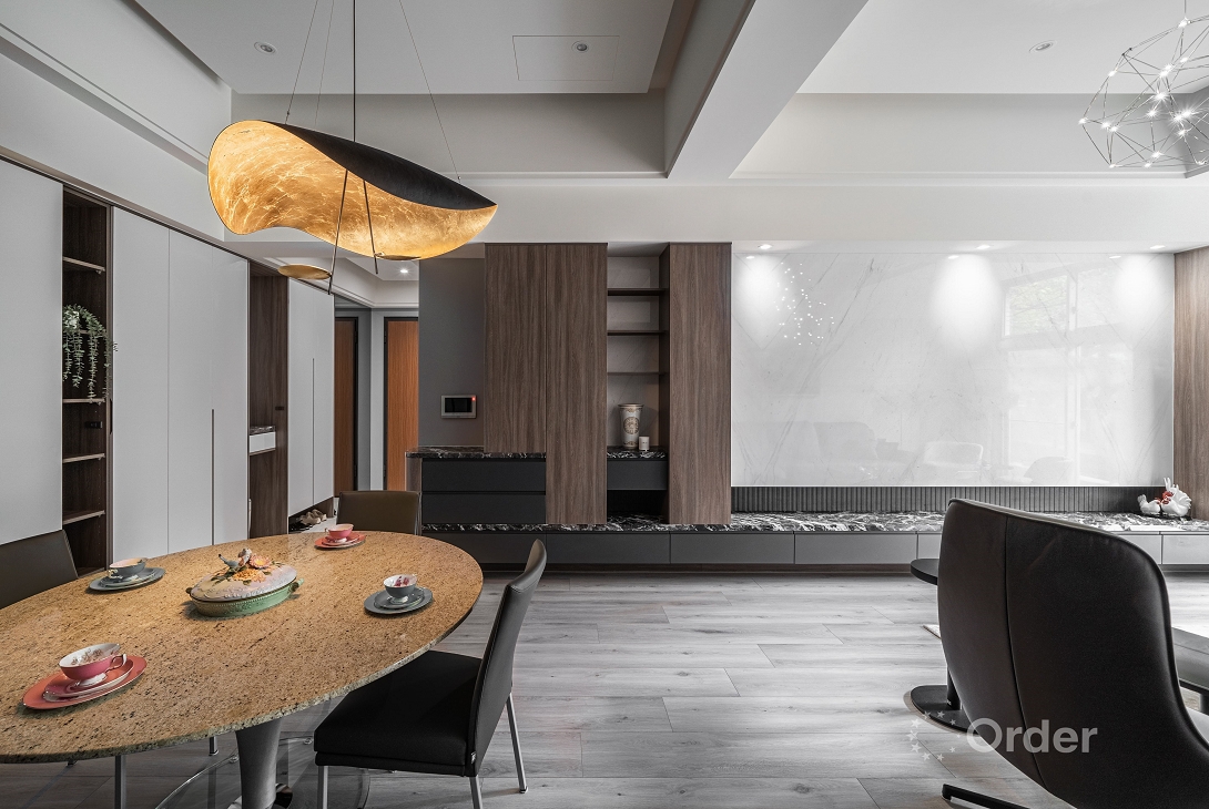 利用石材紋理、木質溫度與燈光層次,打造出兼具機能與美感的居家氛圍,呈現出內斂卻不失細節的高端生活體驗。