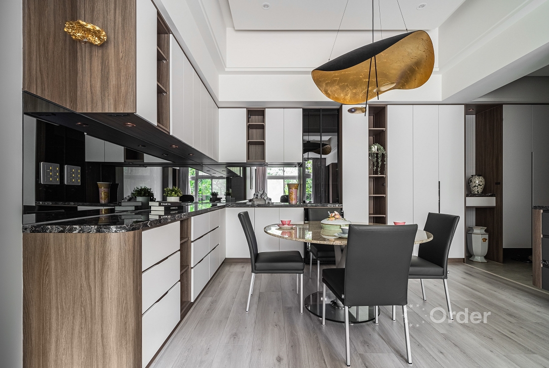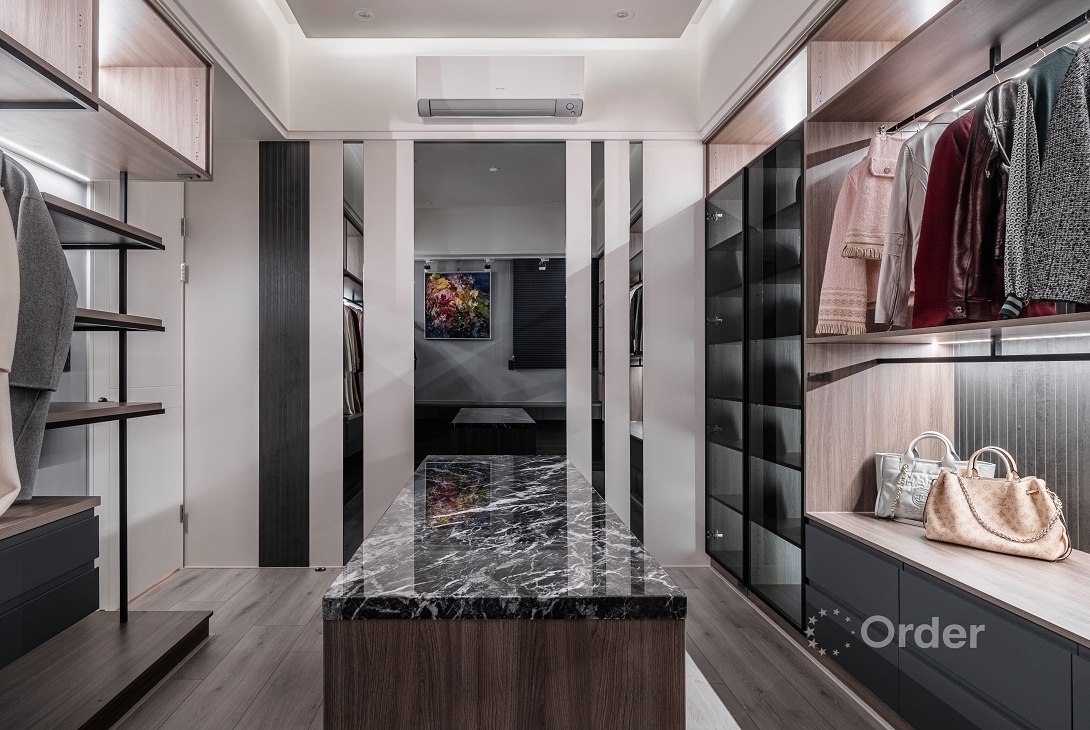 義式風為主軸,打造現代輕奢居宅,玄關內縮打造層次,格柵造型加嵌燈讓入門充滿儀式感;