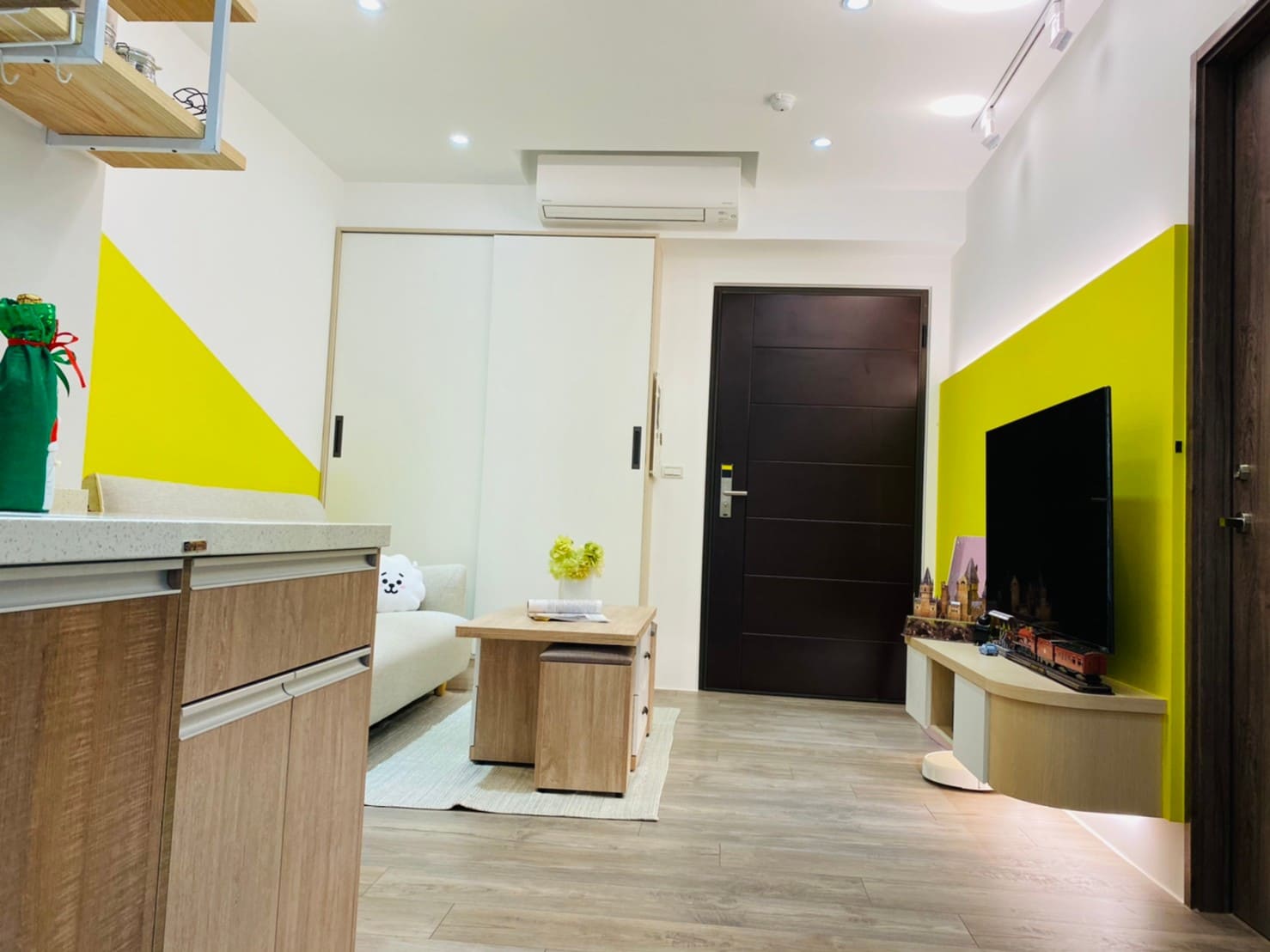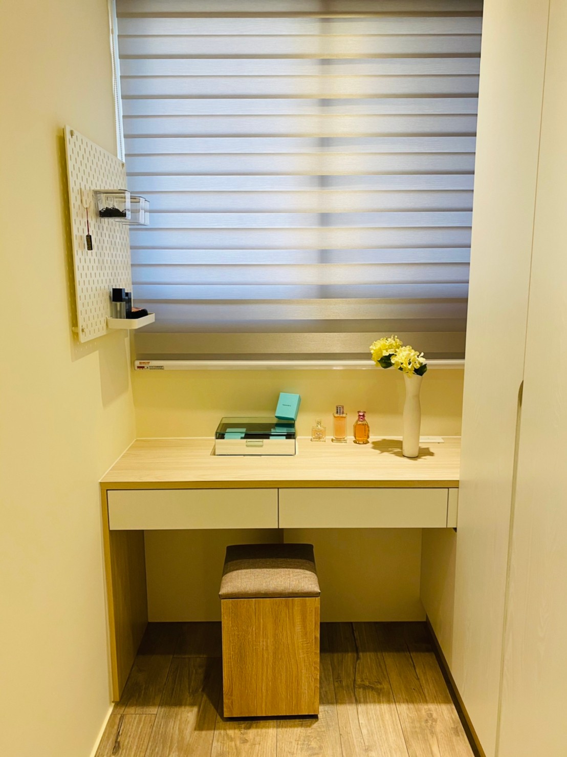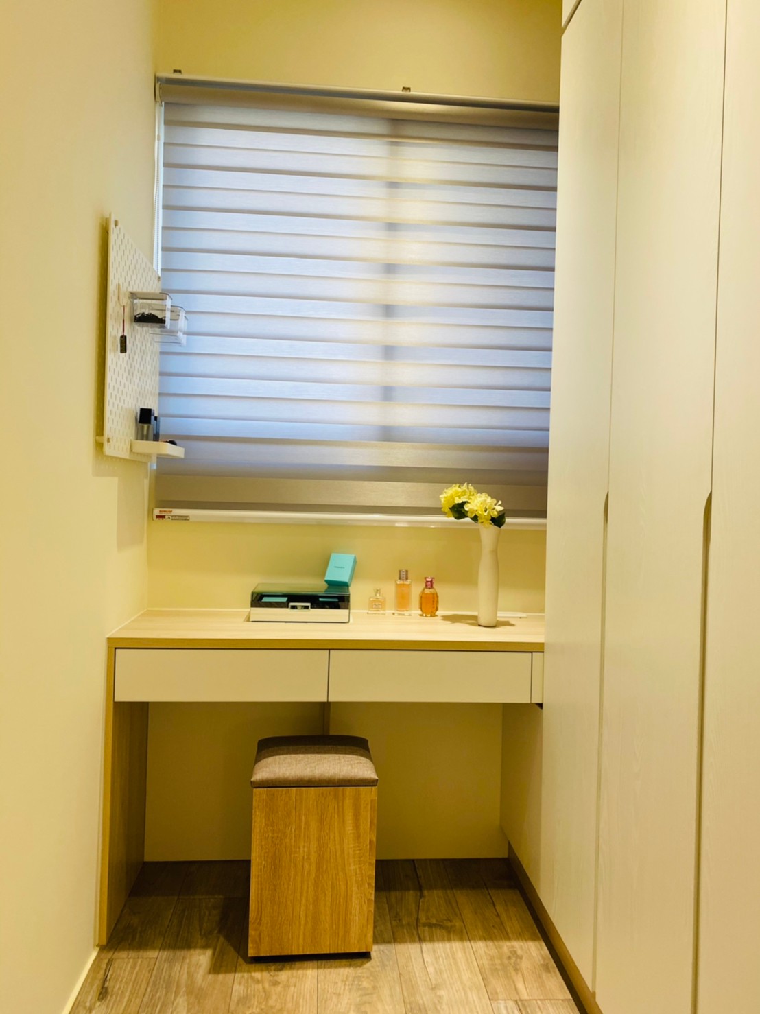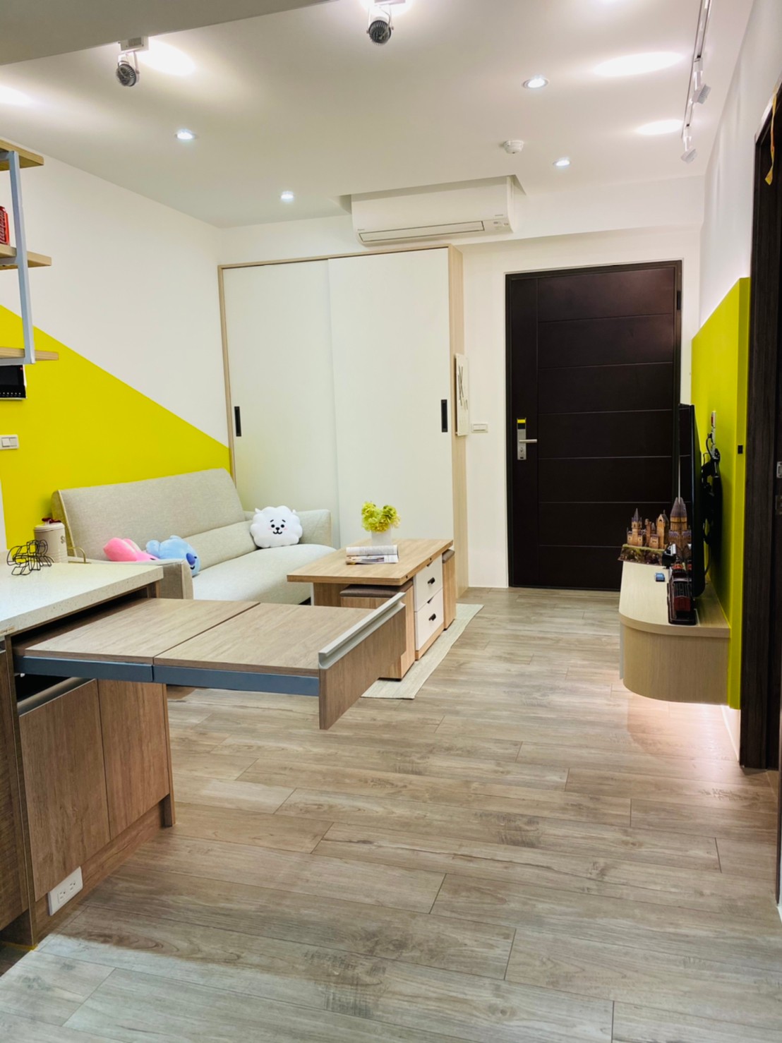 私領域則轉以淺色木紋高櫃與柔和色系鋪陳,降低視覺重量,讓房間在具備充足收納量的同時,仍保有輕盈與舒適感。透過材質與色彩的轉換,使公共與私領域在風格上既連貫又各具層次。