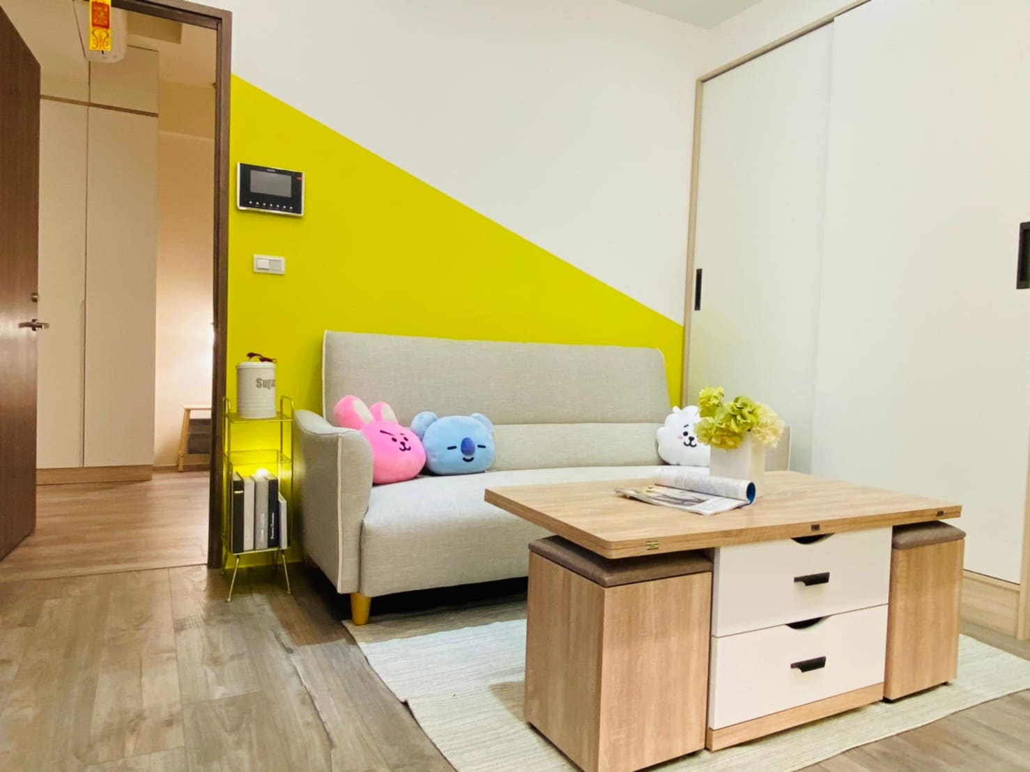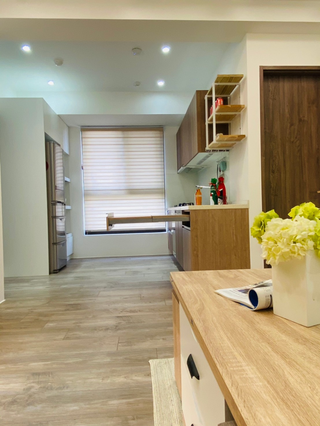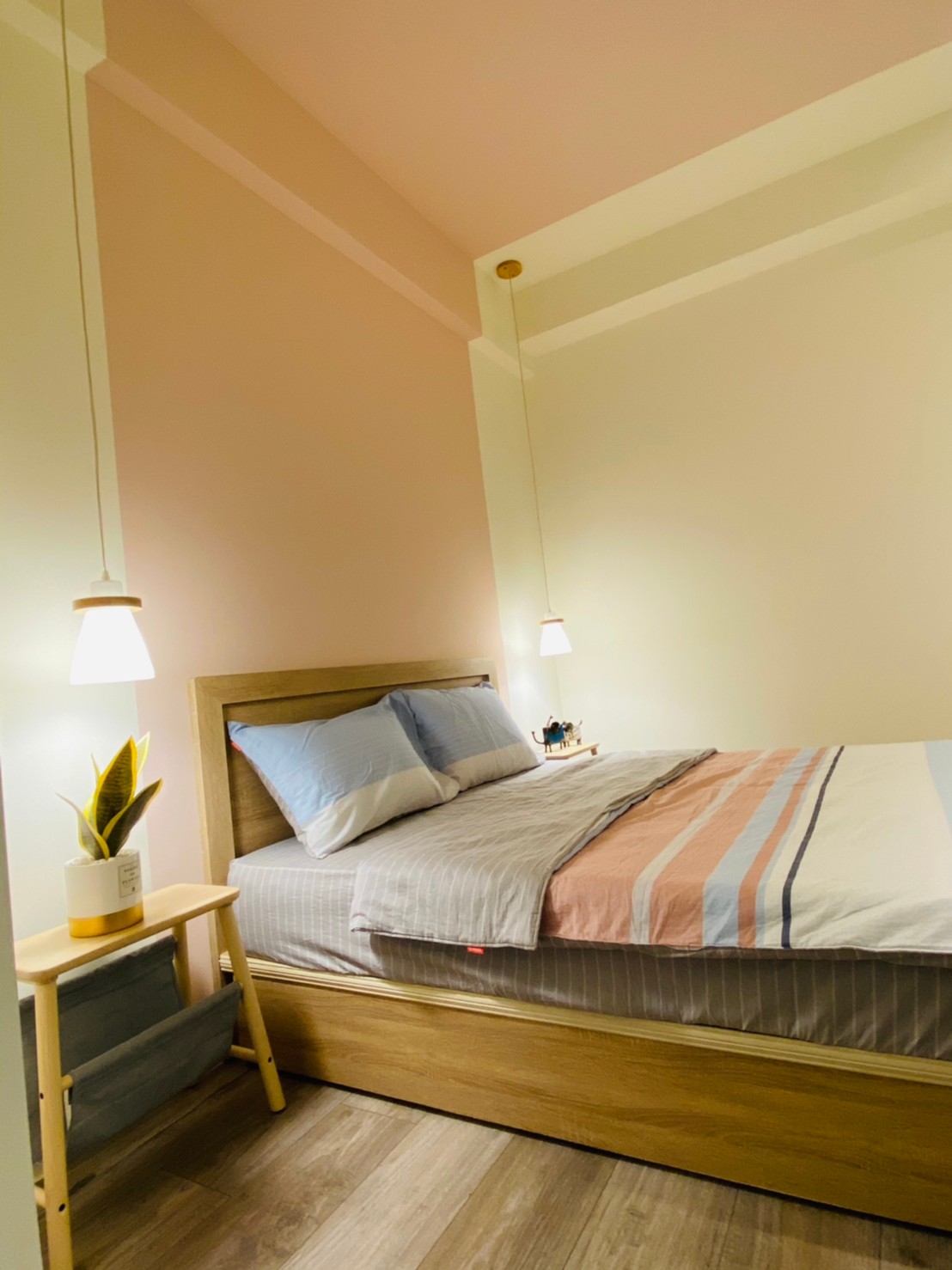 私領域則轉以淺色木紋高櫃與柔和色系鋪陳,降低視覺重量,讓房間在具備充足收納量的同時,仍保有輕盈與舒適感。透過材質與色彩的轉換,使公共與私領域在風格上既連貫又各具層次。