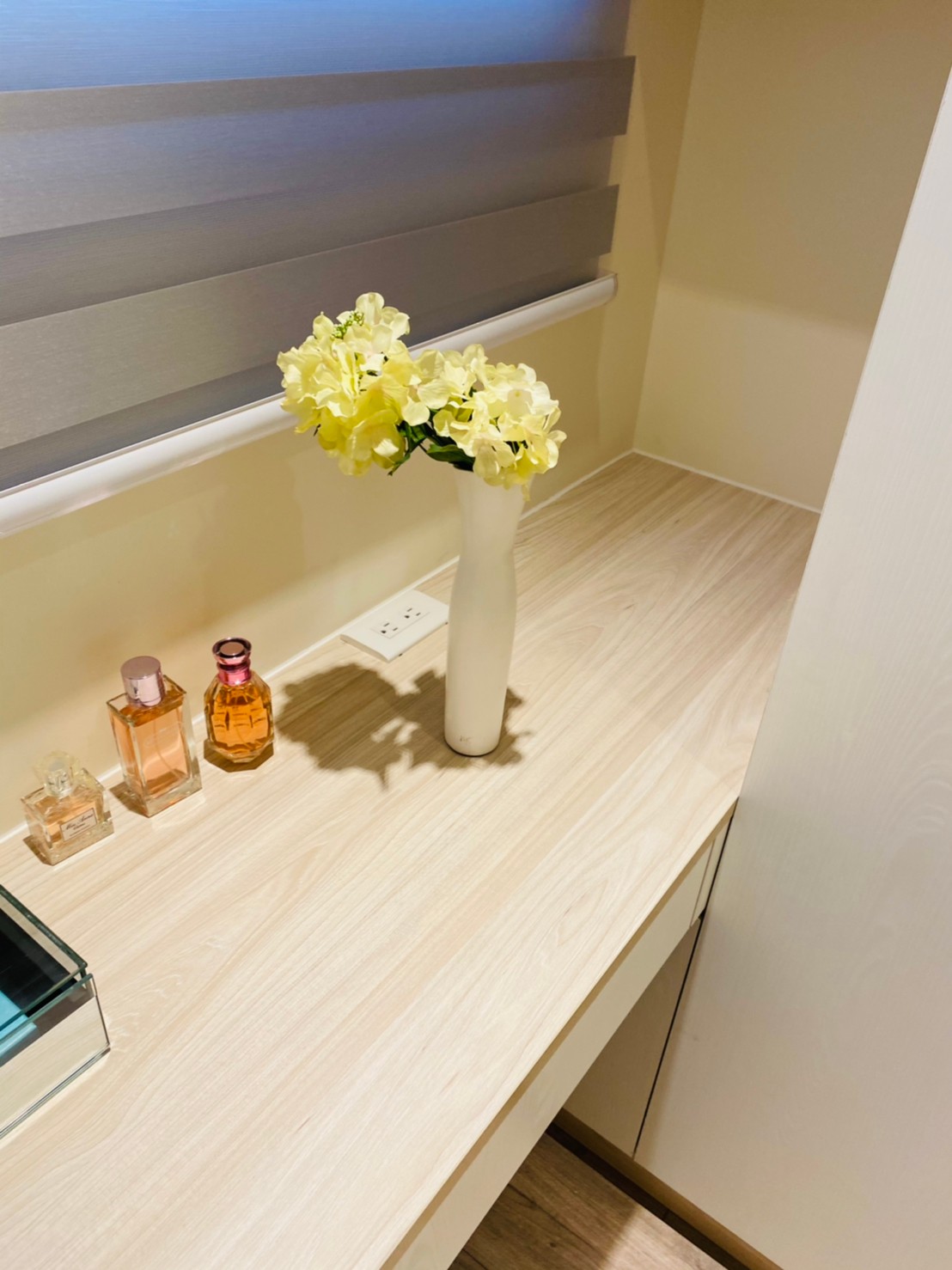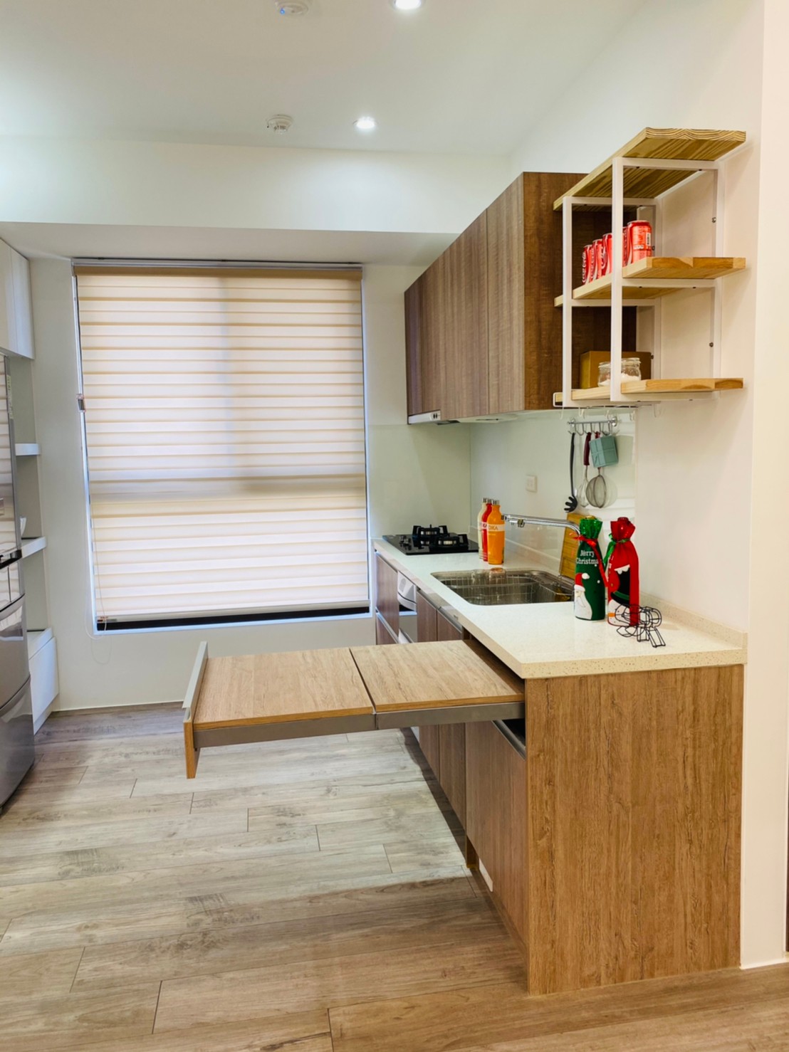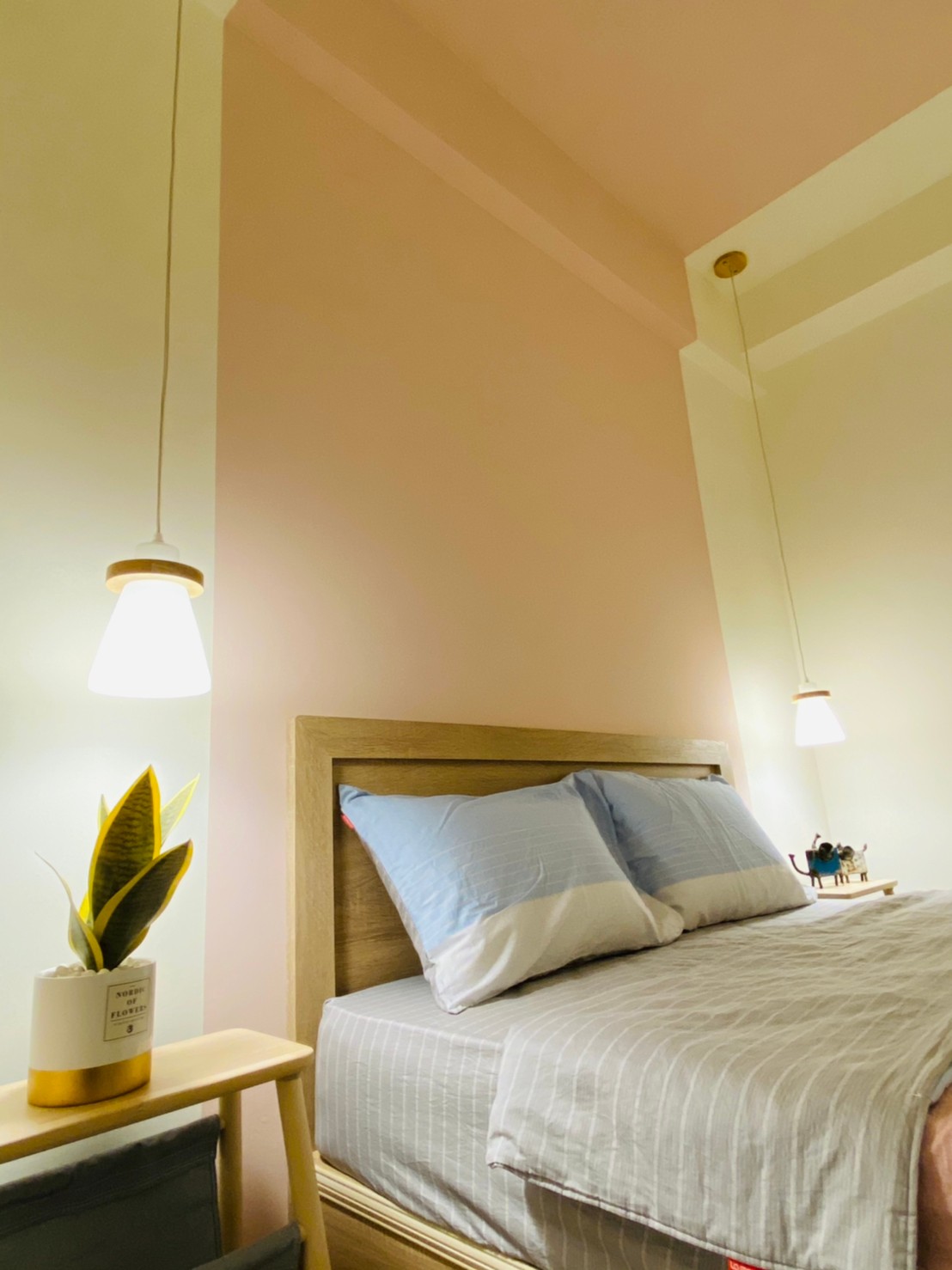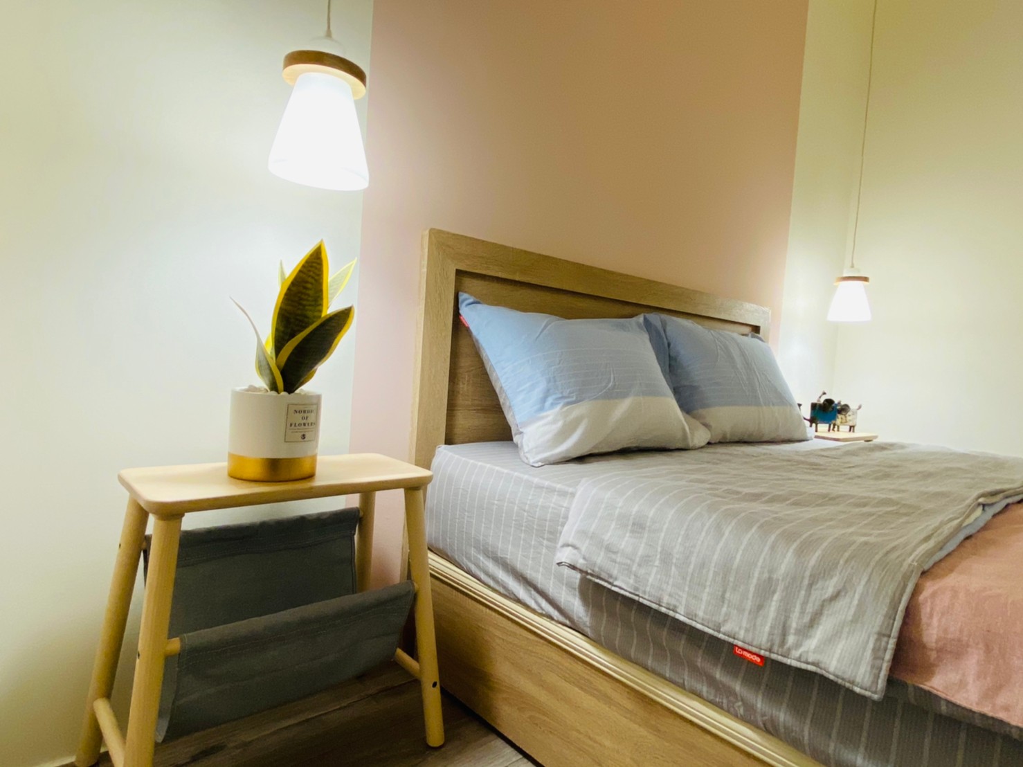 私領域則轉以淺色木紋高櫃與柔和色系鋪陳,降低視覺重量,讓房間在具備充足收納量的同時,仍保有輕盈與舒適感。透過材質與色彩的轉換,使公共與私領域在風格上既連貫又各具層次。